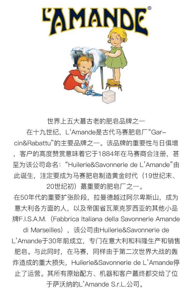 L'Amande成立于1884年,源自意大利,它是世界上蕞古老的品牌之一 !拥有悠久的历史!在欧洲拥有广泛的群众基础和不俗的口碑,各大商超都能找到它!