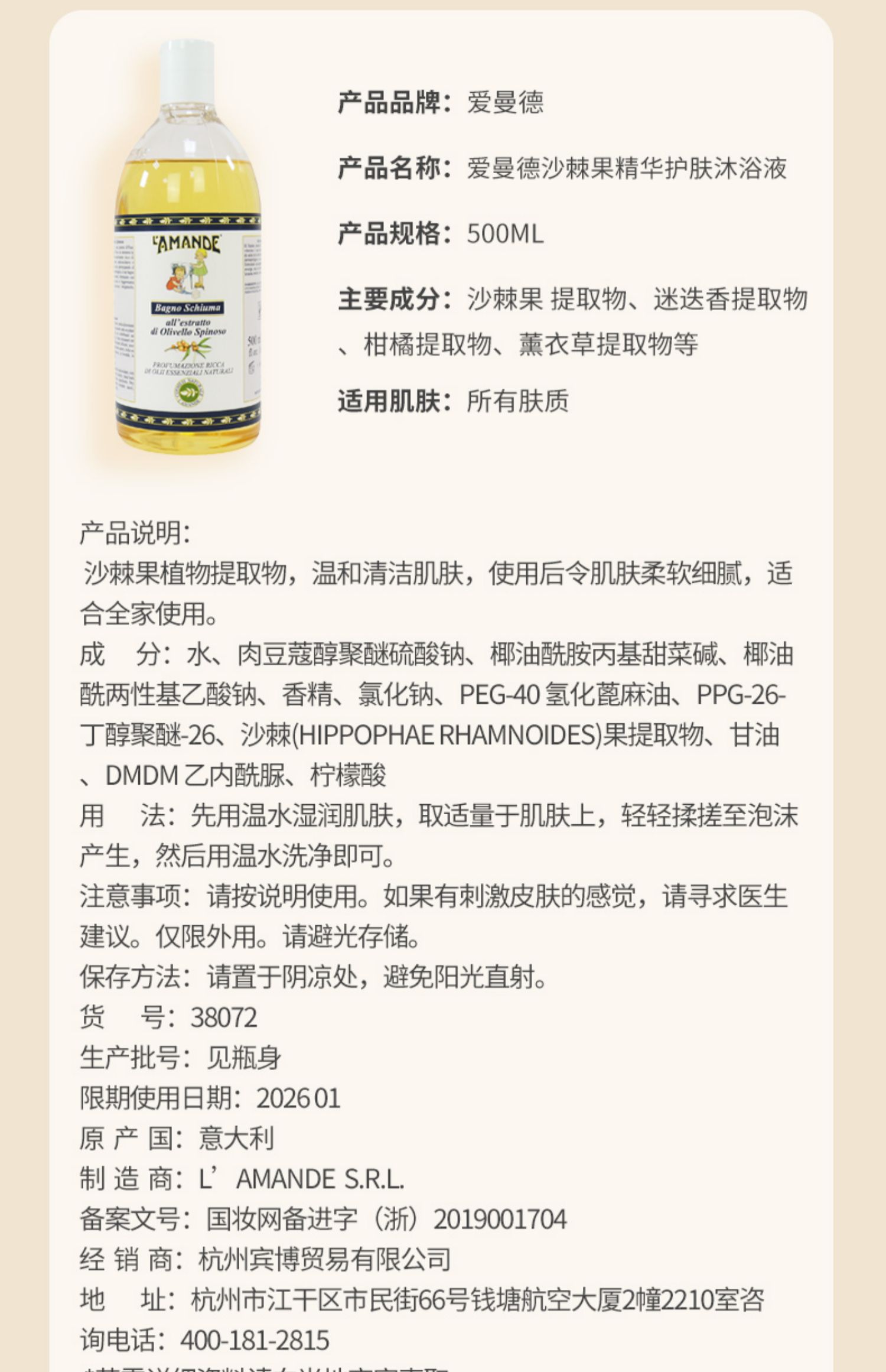 【商品名称】意大利L'Amande沙棘果精华沐浴液500ml