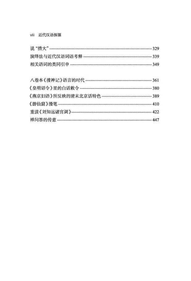 语法方面主要探寻虚词来源与语法化问题,另外有几篇与语言接触问题有关。词汇方面,有对具体语词的考释,也有探讨词义考释的方法和词义演变规律的。专书语言部分,是对专书语言的介绍或考辨,多从语法和词汇着手,有的也牵涉到语音问题。最后一篇是从传意方式的角度来讨论近代汉语的重要资料——禅宗语录的语言特点的。