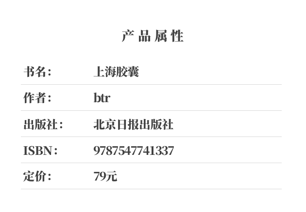 1,展览可以成为小说吗?小说可以成为展览吗?这是出生并生活在上海的白羊座、酷爱小说/电影/当代艺术等无用之物的作家/译者/评论人btr的小说集,或者说,个人展览,欢迎各位的观看/光临。btr痴迷于新鲜有意思的叙事,新作《上海胶囊》包含了19篇“展览小说”,凭空搭建起19座展厅,从入口进入,在文字和图片构建的空间里,你可以随着他一起自由观看、想象、游荡、晃神……19篇故事,19个虚实映照的镜厅,19段虚实互涉的旅行,为我们时代的都市生活保存下充满迷思的奇妙胶囊。在btr笔下,你总能期待在某个地方,艺术突然涌入现实,将其改变。
