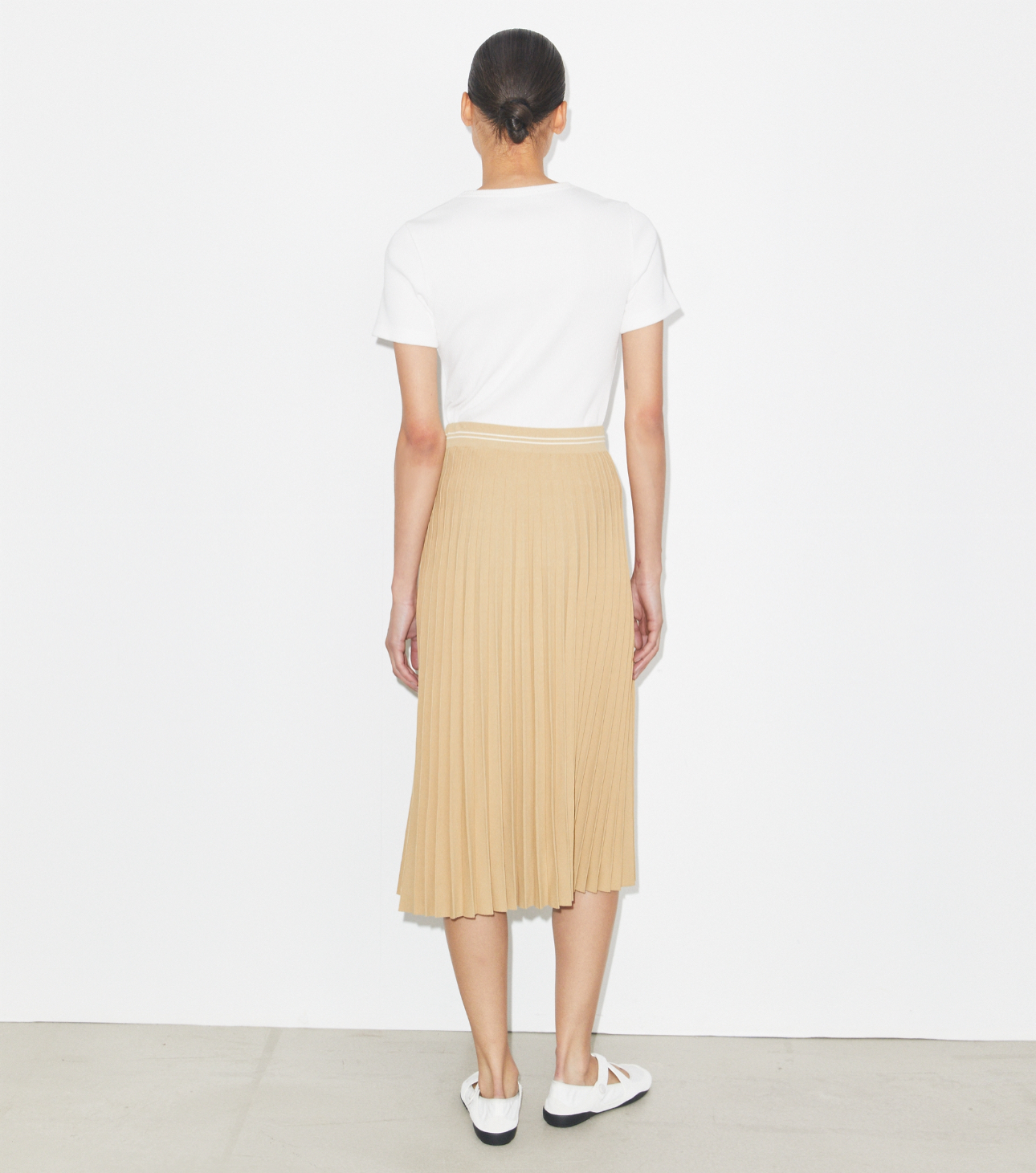 这款粘纤半身裙,款型优雅,长度及至小腿中部,饰以利落褶裥与舒适弹性腰带。廓形简约多变,四季皆可穿搭。