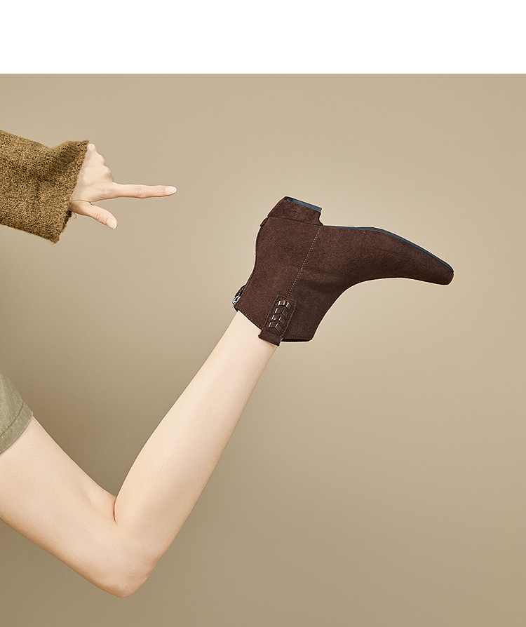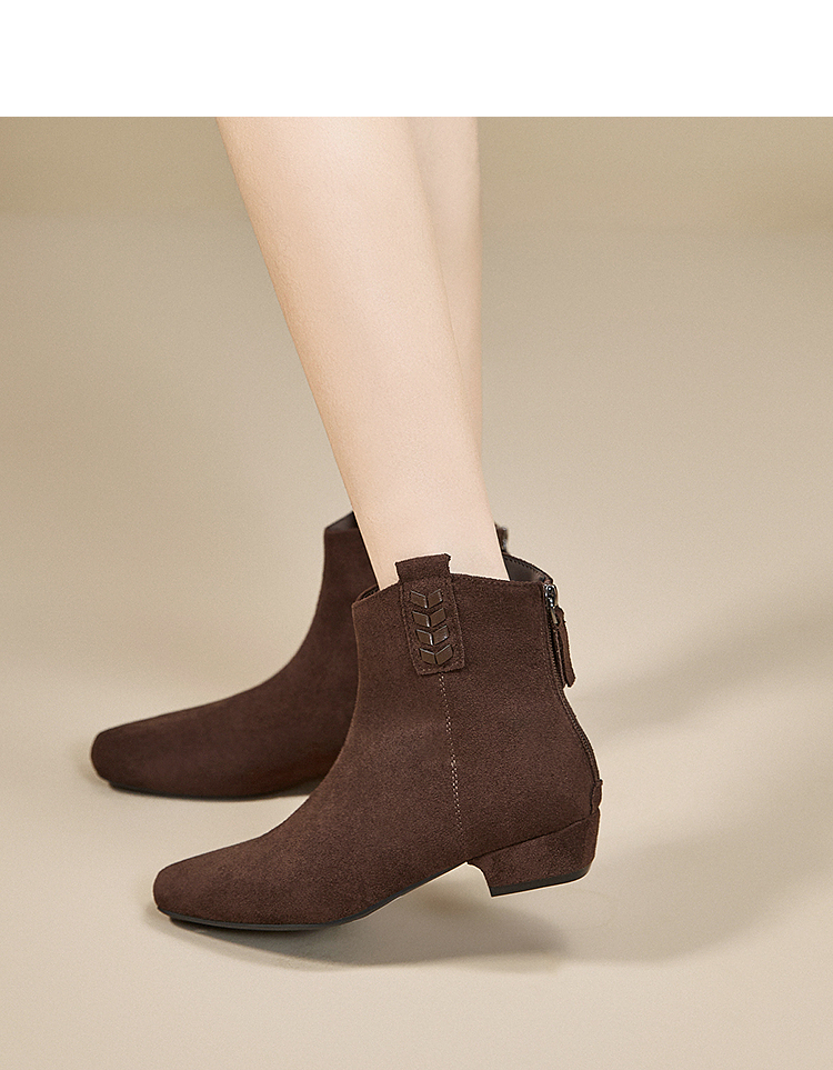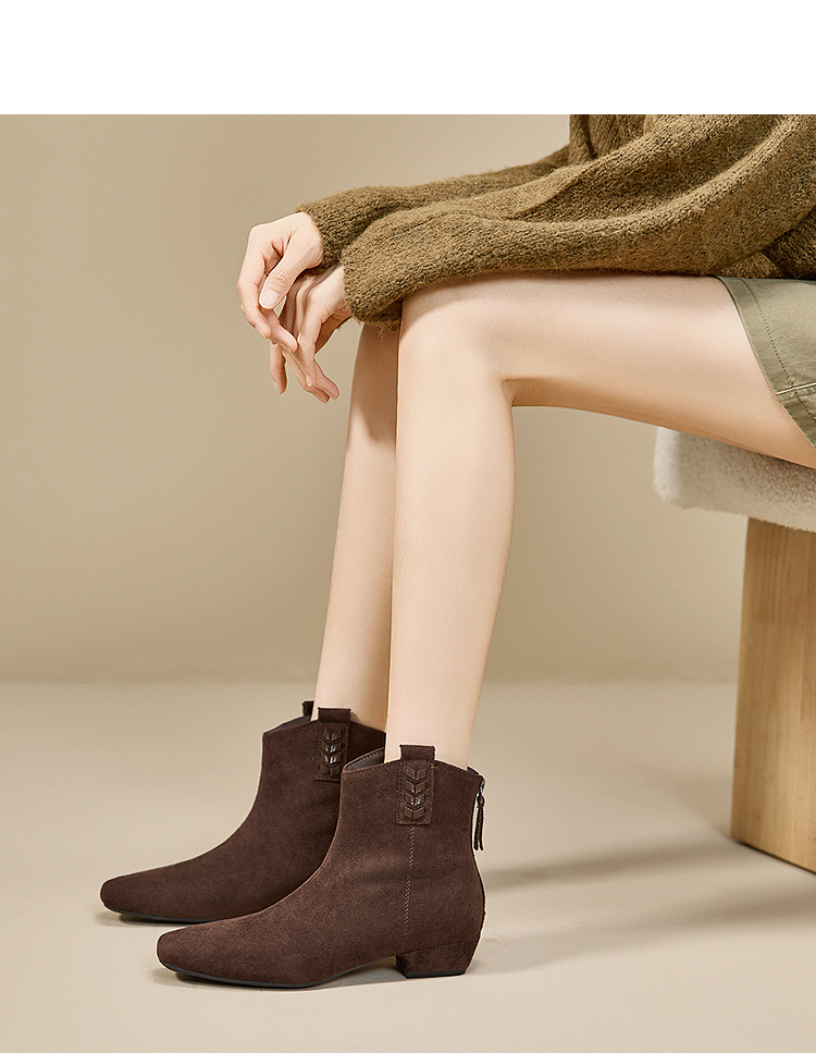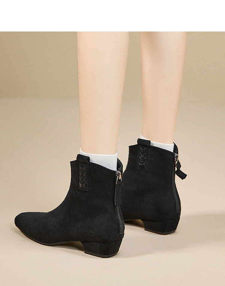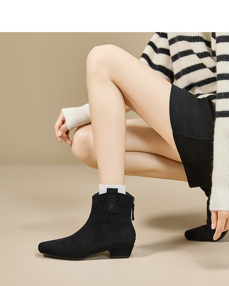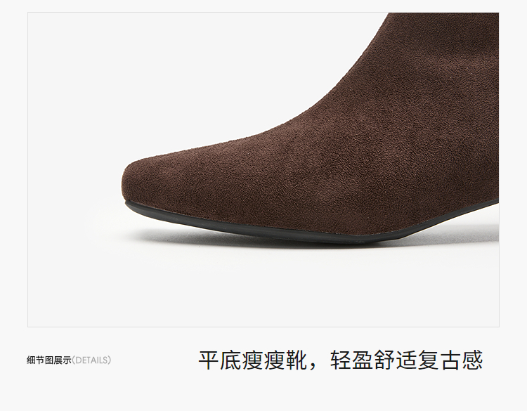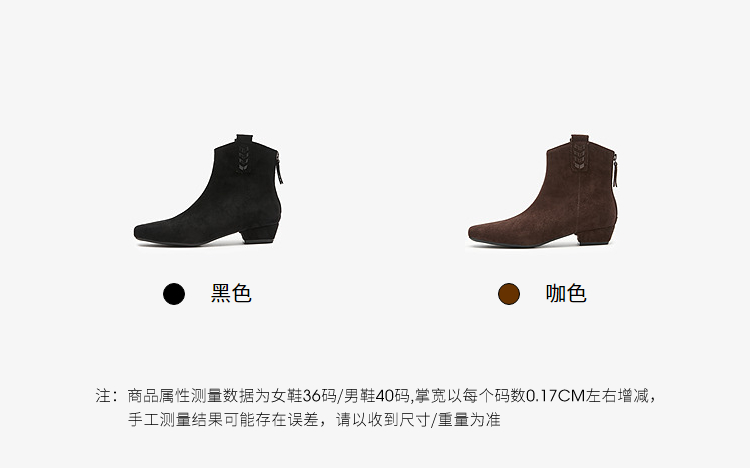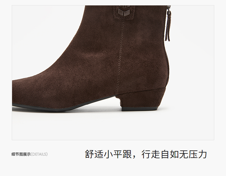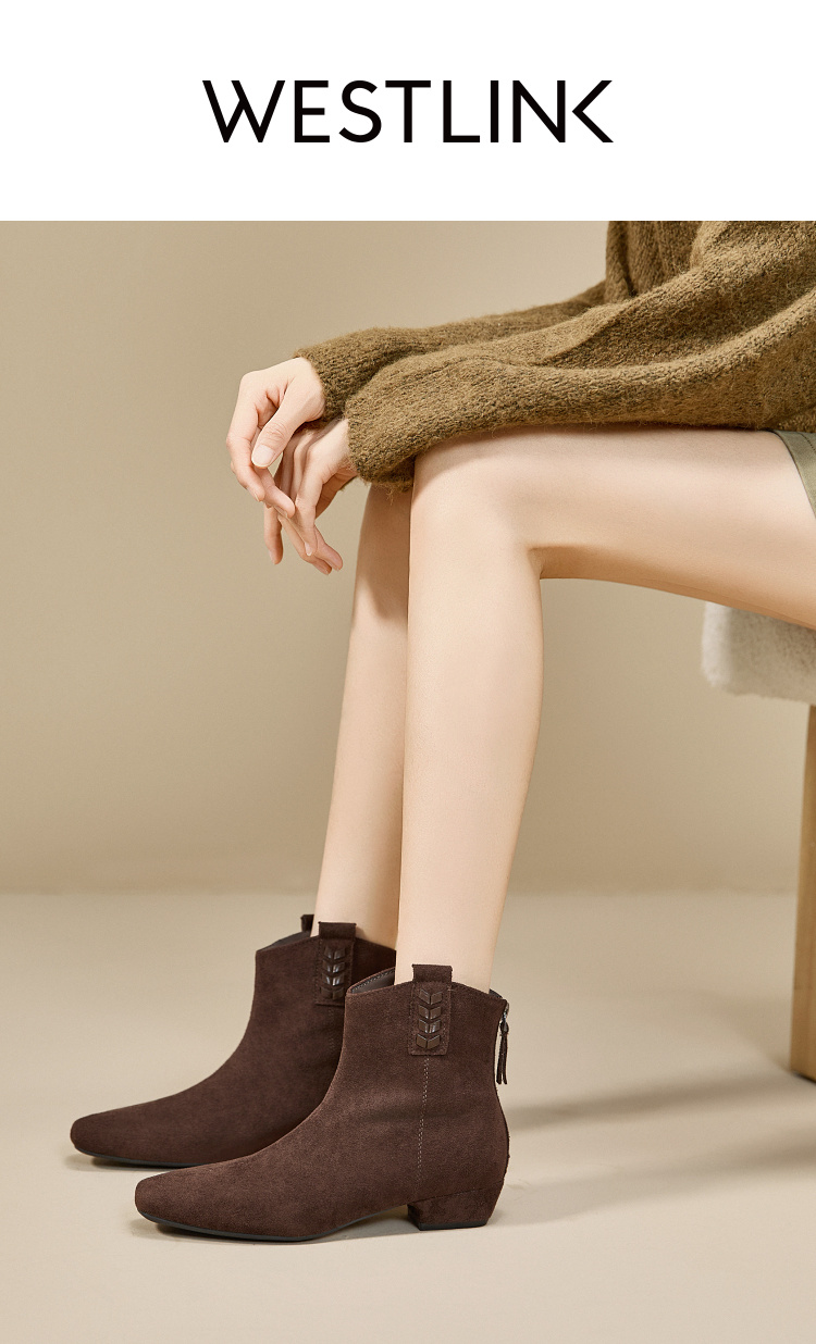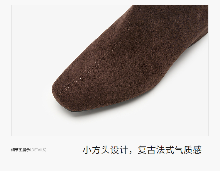 西遇方头短靴女新款秋冬法式绒面V口低跟切尔西靴黑色瘦瘦靴V2157197