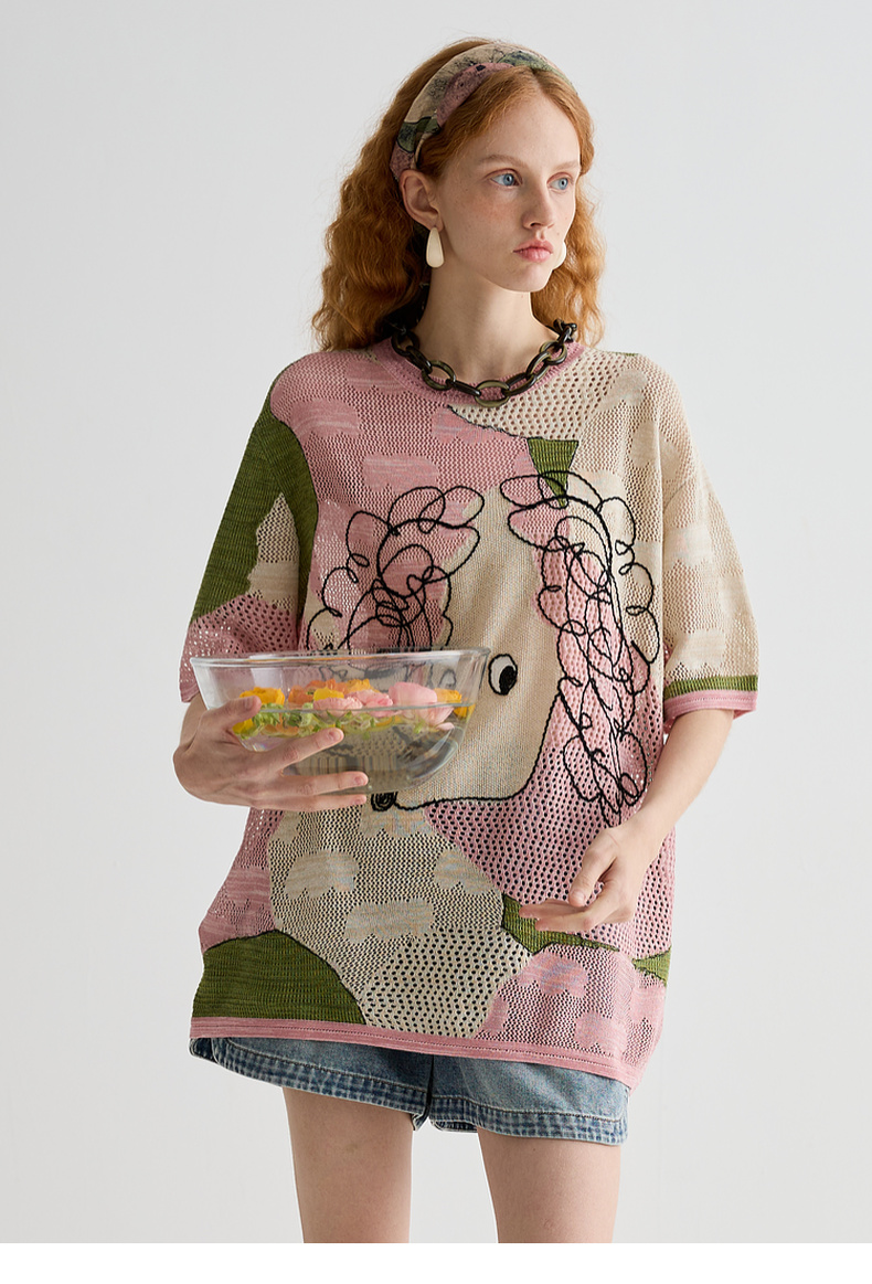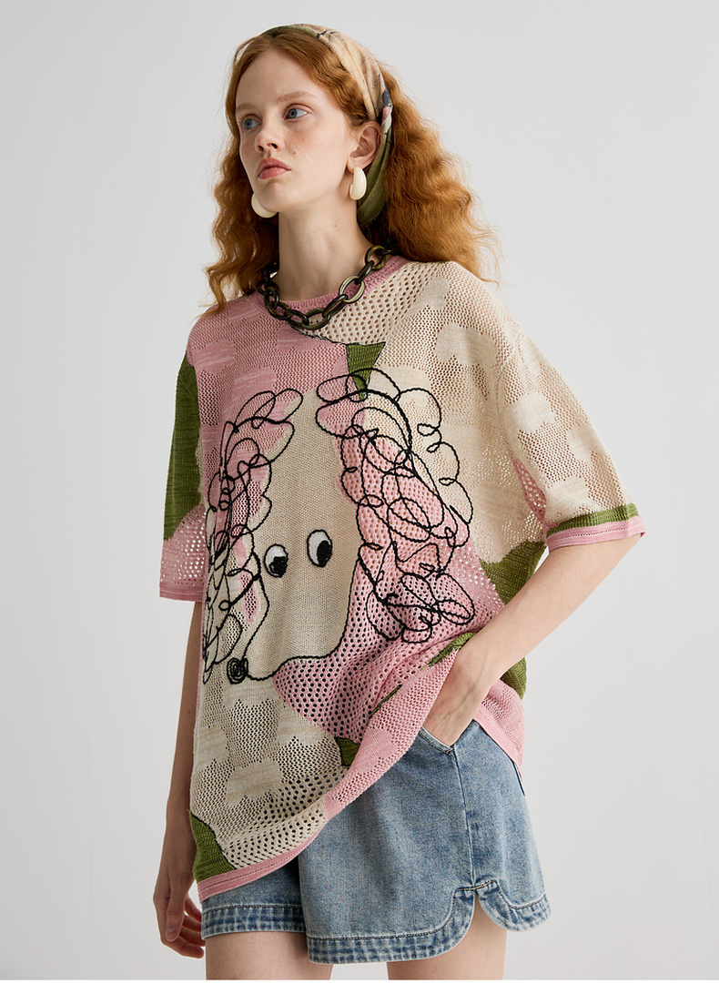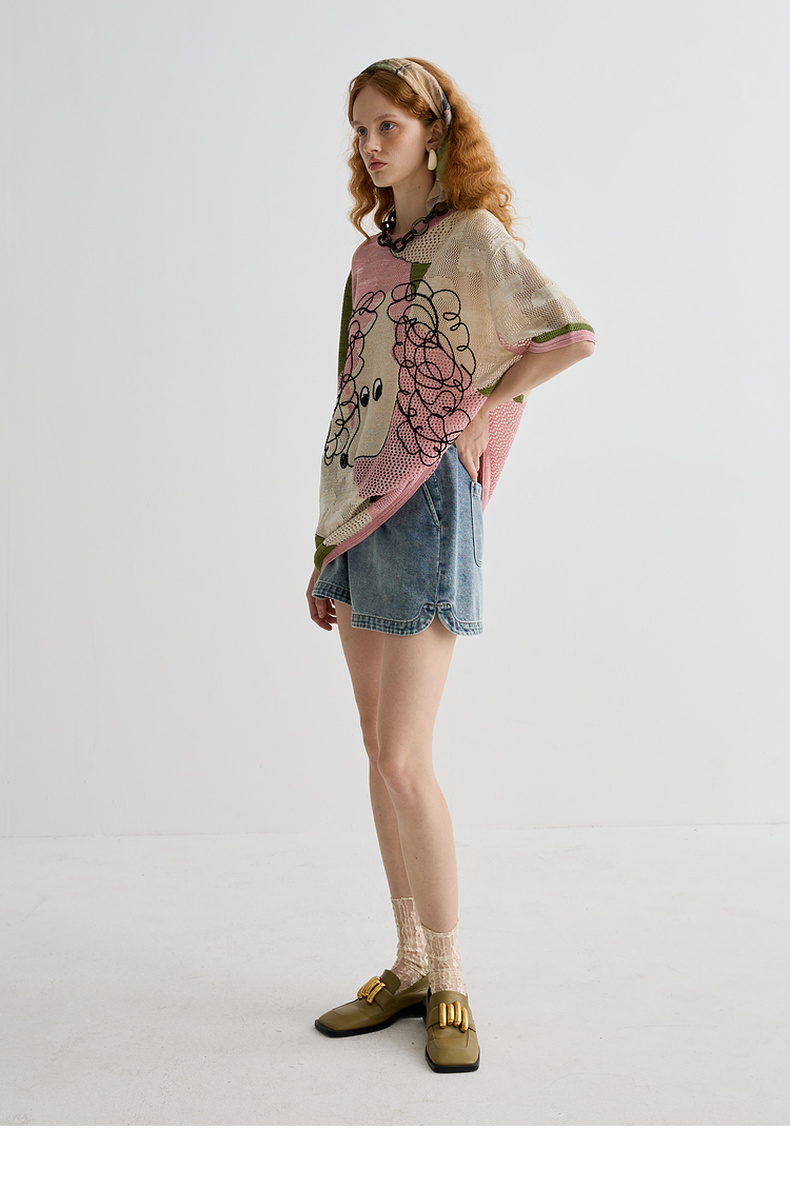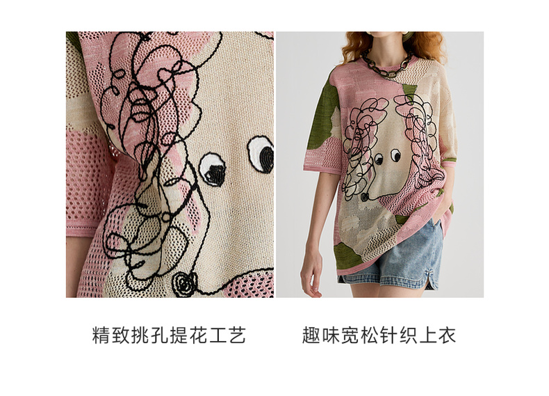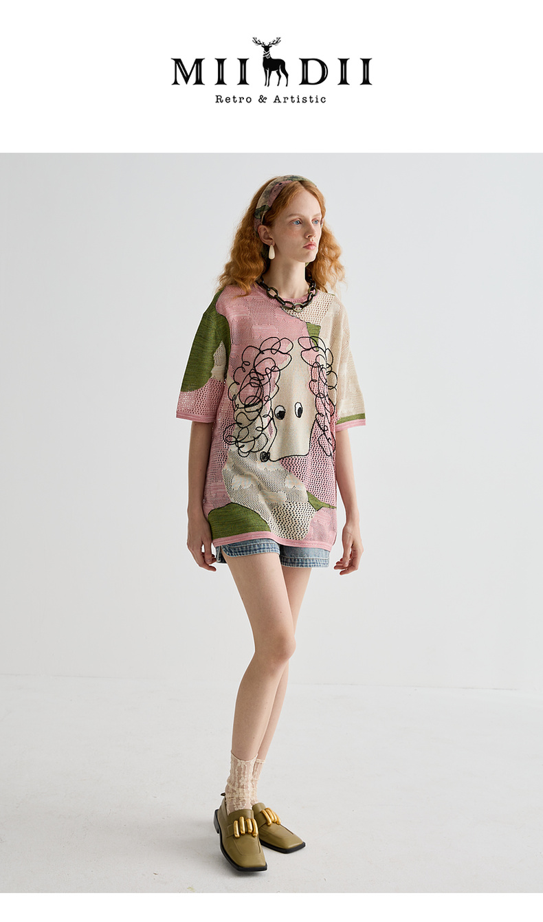 谜底针织衫短袖女2025夏季新品复古文艺大廓形H型长毛衣252MZ0876