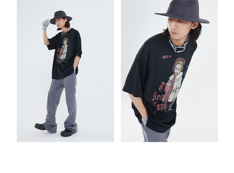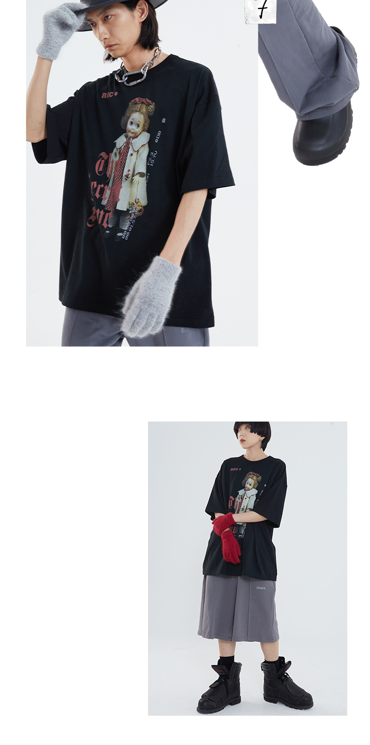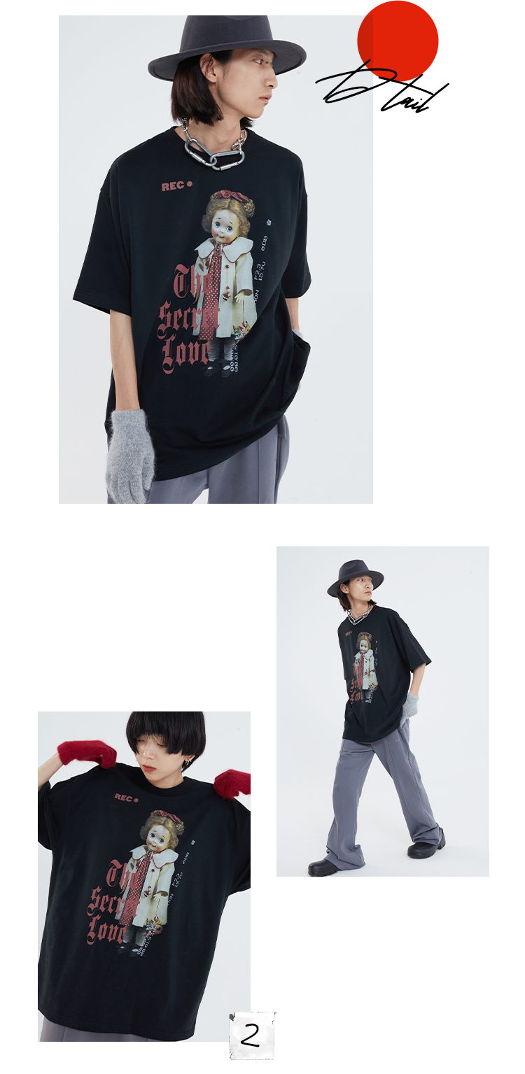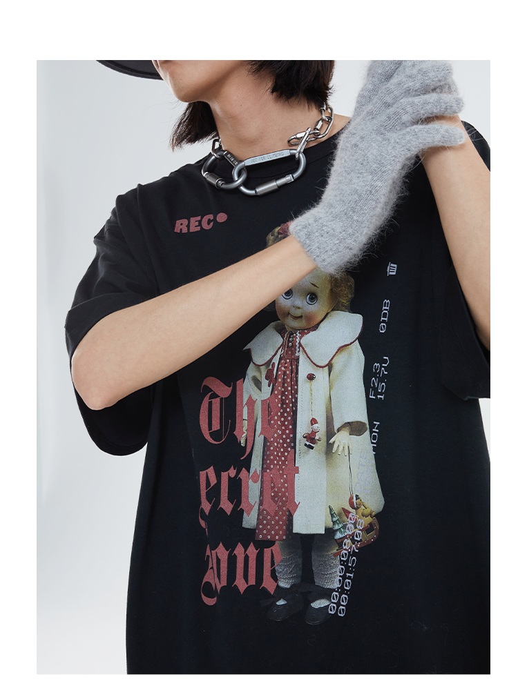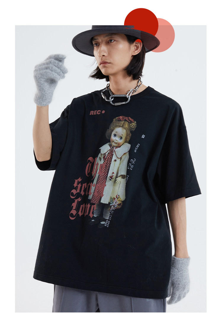 POH 「秘密的爱」洋娃娃印花休闲宽松落肩短袖T恤男夏季潮牌半袖
