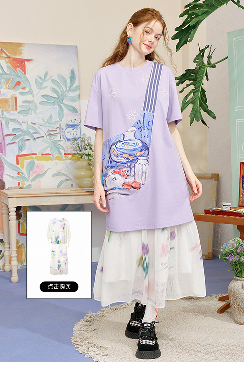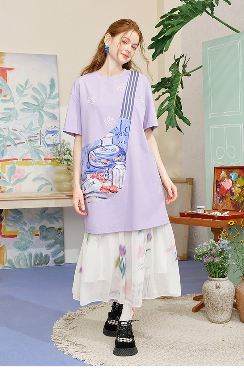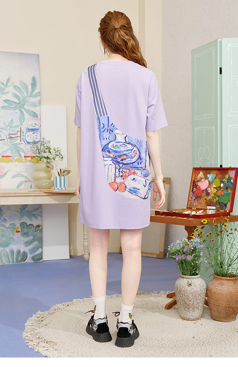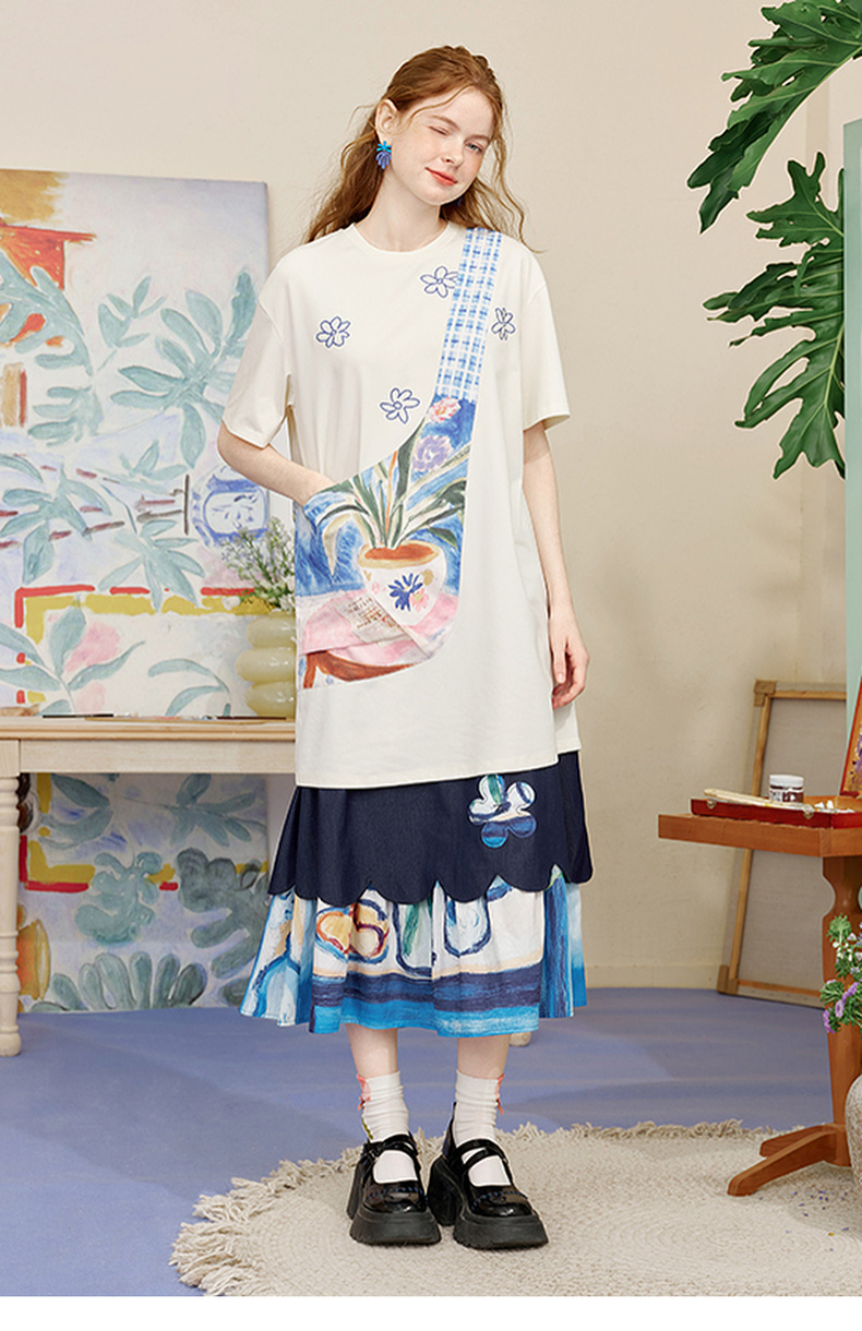 两三事 盛满仲夏 2025夏季新款时尚印花斜挎口袋拼接t恤裙连衣裙