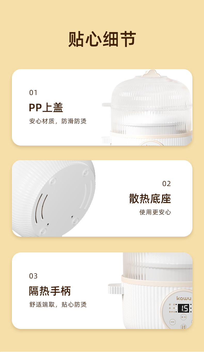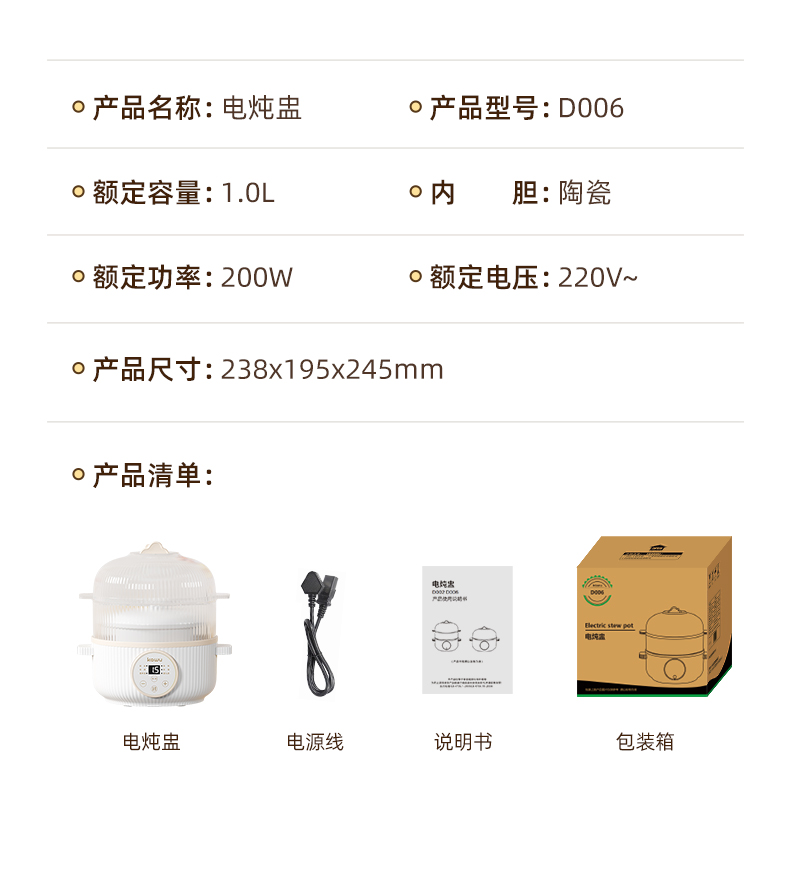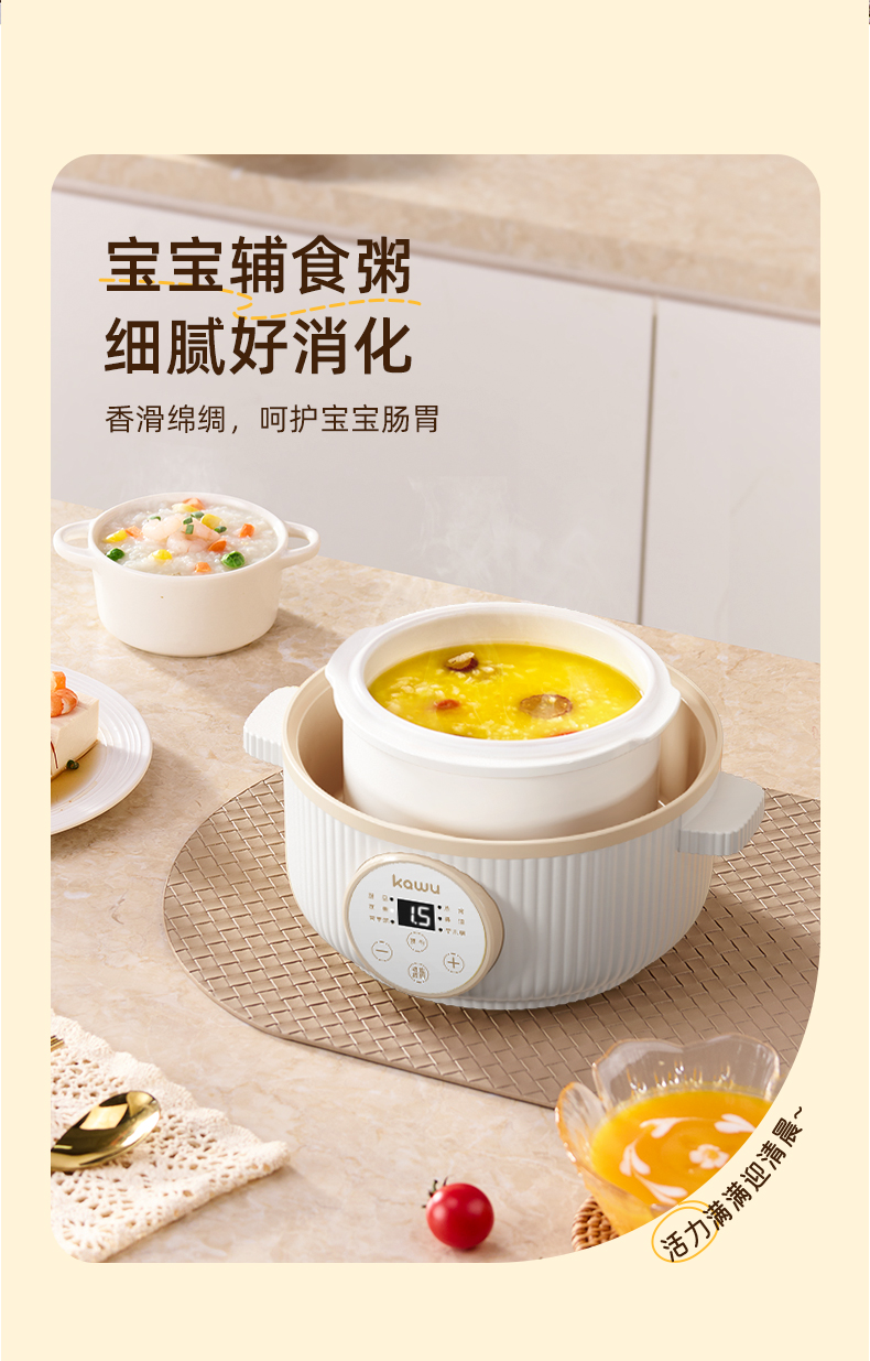 【产品功能】:蒸煮、甜品、保温、婴儿粥、燕窝、煲汤