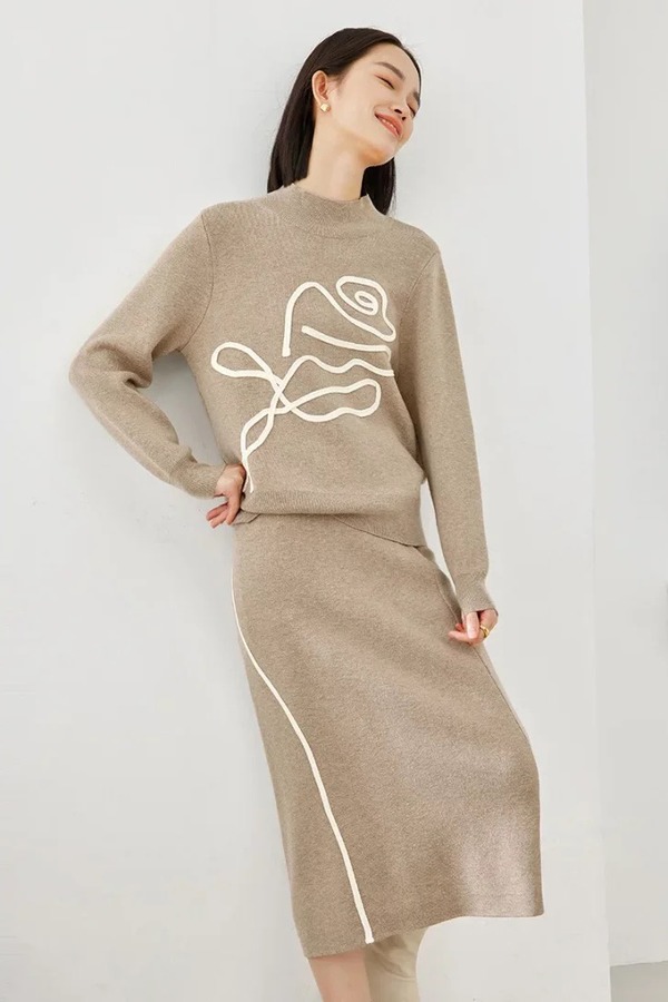 VIMLY/梵希蔓 时尚绣花针织上衣+半裙套装 21681