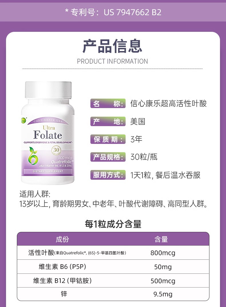 美国信心药业牌高含量活性叶酸复合胶囊30粒/瓶 WH