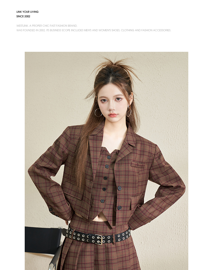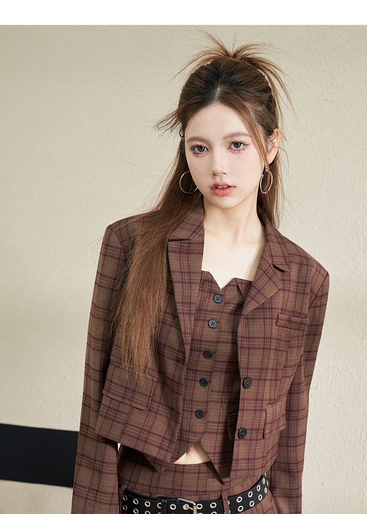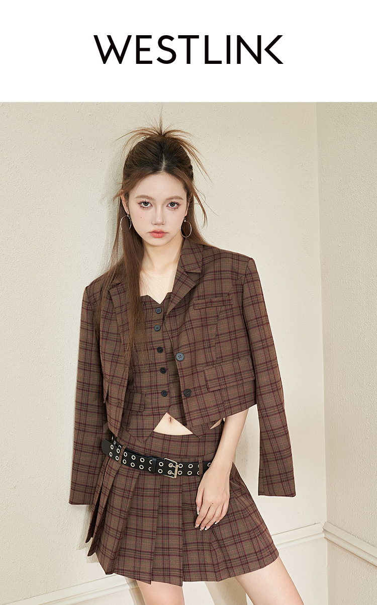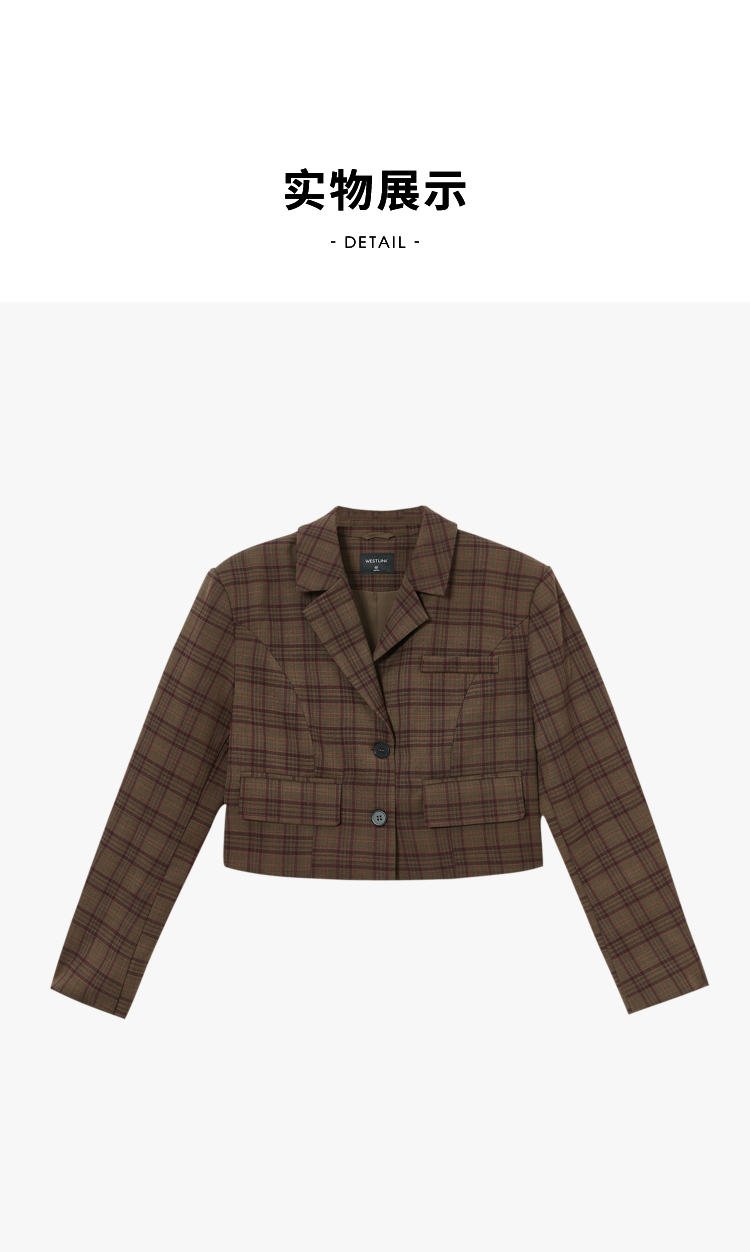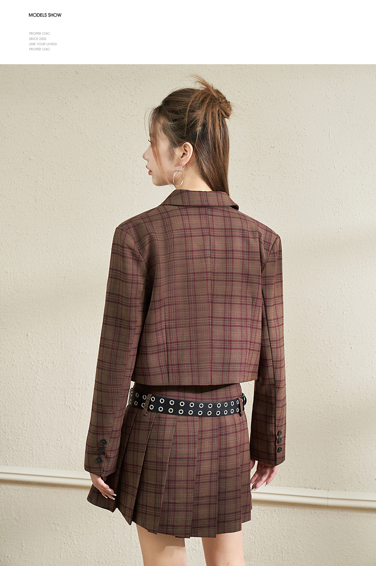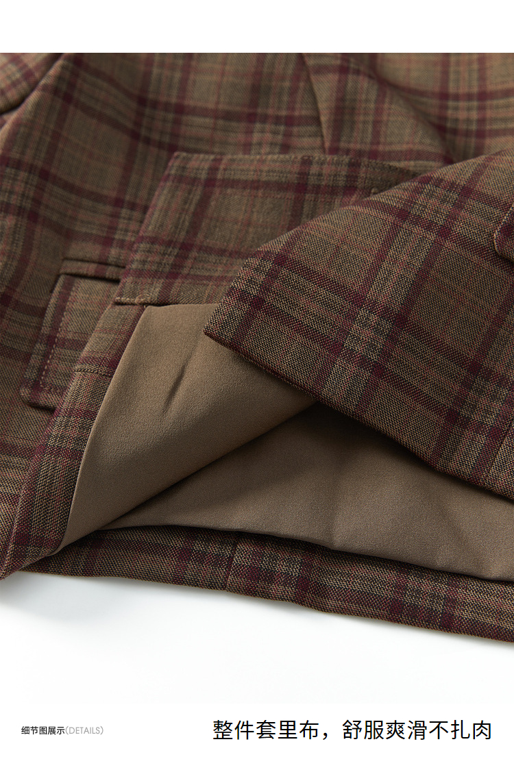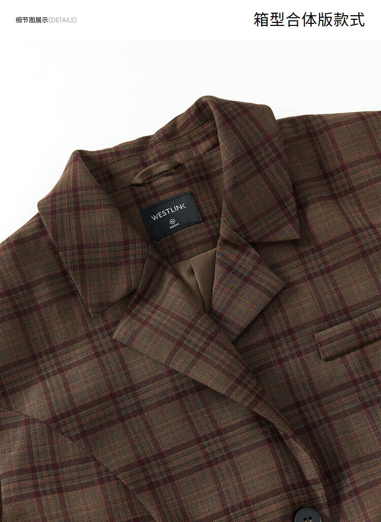 西遇英伦风格子西装女2023年秋季新款翻领宽肩韩版时尚咖色外套11831944