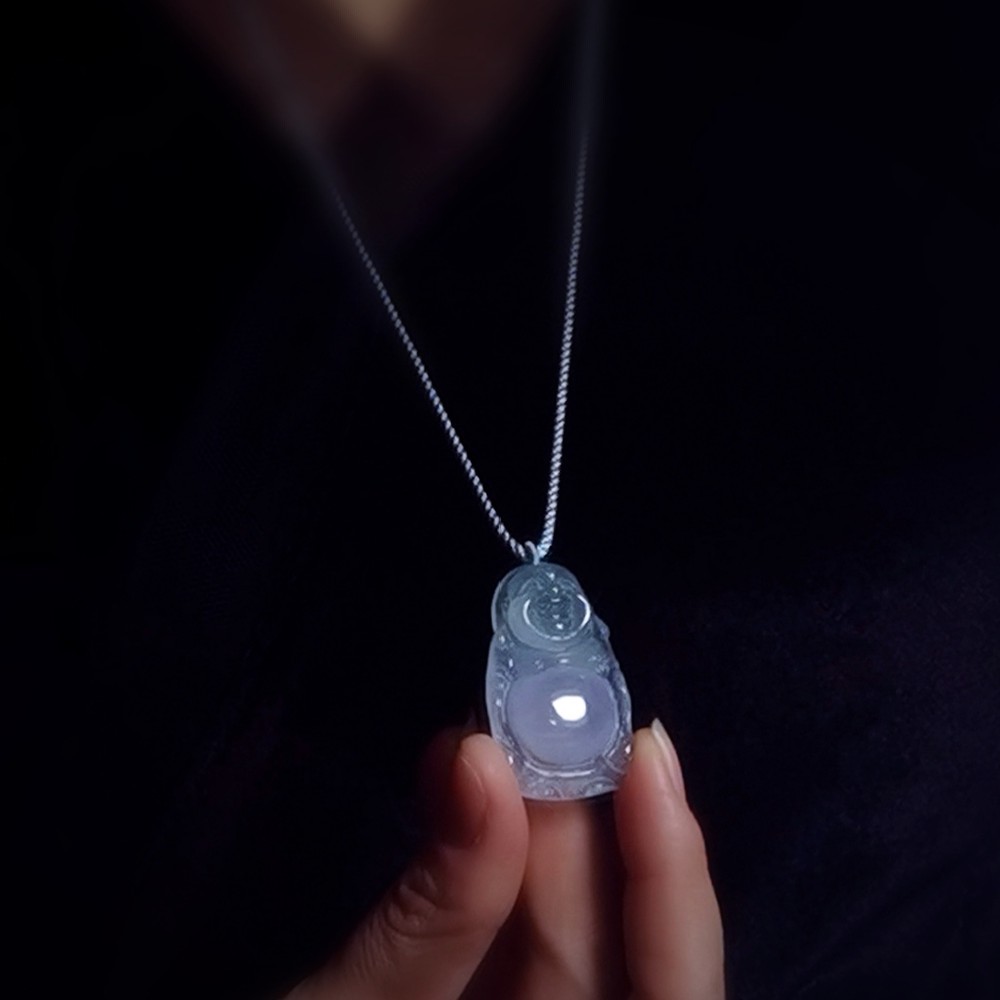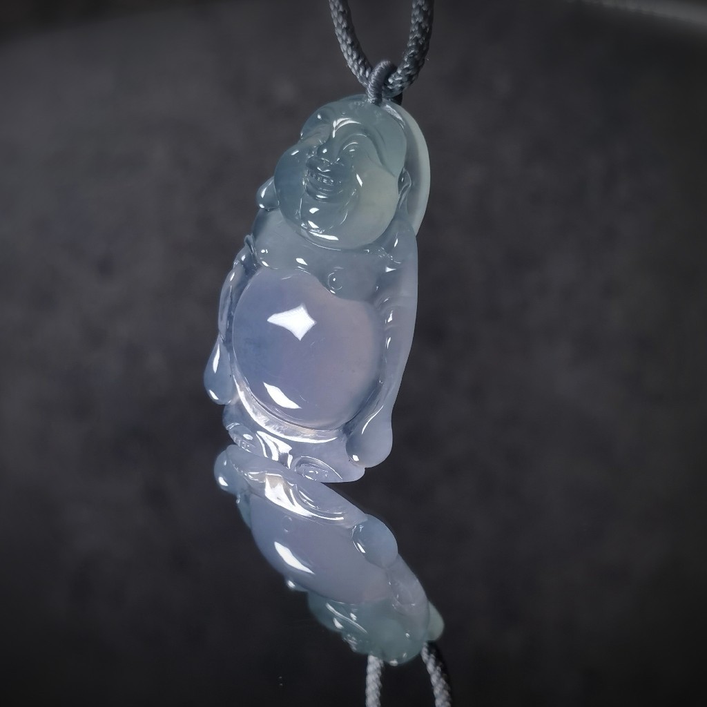 这是一件春带彩的翡翠站弥勒佛挂件。冰种结构,晶莹剔透。买点是颜色,弥勒的脸呈淡淡的果绿色,胸部以下却是淡淡的紫罗兰色。说明玉匠选料时的巧妙心思。再看这件弥勒的颜值,可以说有着天使般的笑容,眉弯嘴翘,非常的喜庆。是件不可复制的佳品。