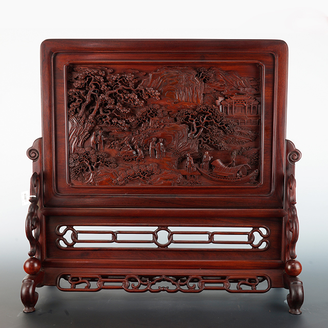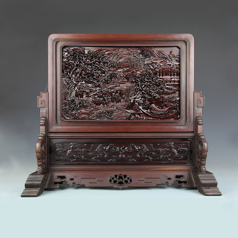 作品画面一只小船泊于码头,随从正推着满满一车财物往家赶,家人都到码头迎接,享受着团圆的欢乐。邻人也在议论,仿佛在谈论着商人的奋斗故事。远处的徽派大宅,想必就是商人的家了吧?徽商、徽派建筑使得该作品体现着强烈的徽州元素。在楠木上施以浅浮雕、深浮雕、镂空雕等多种技法雕刻着远山、近树、蓬船、水草和一组人物,颇具立体感的画面让人仿佛置身其中,见证着徽州的传奇。