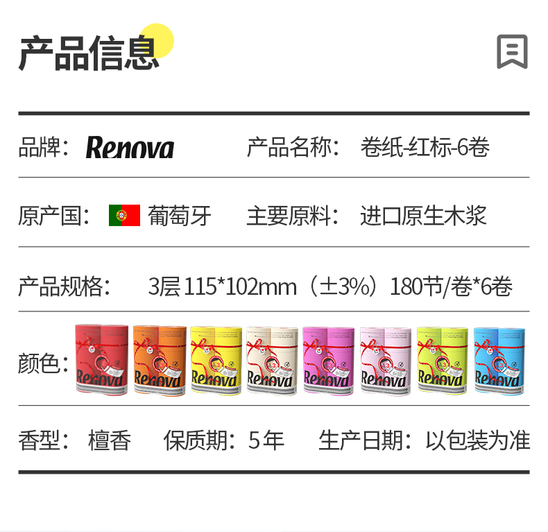 【已下架】积分换购 | 葡萄牙Renova 彩色檀香卫生纸巾6卷 蓬松柔软 植物染料 不掉色 不掉纸屑 [福利品]
