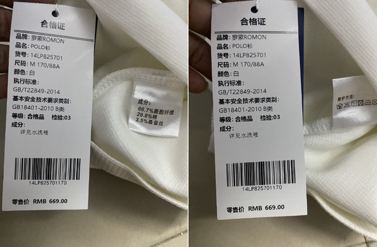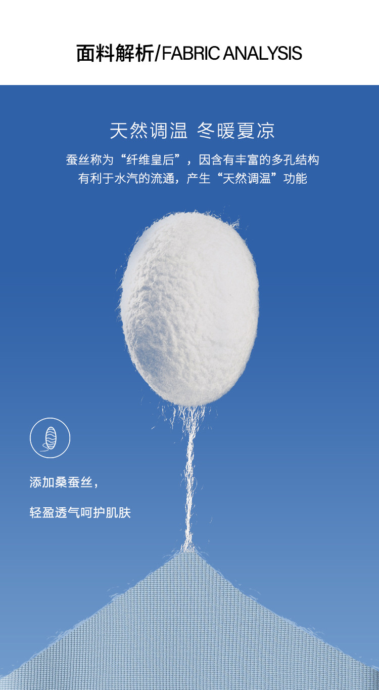 面料:66.7%聚酯纤维 29.8%棉 3.5%桑蚕丝