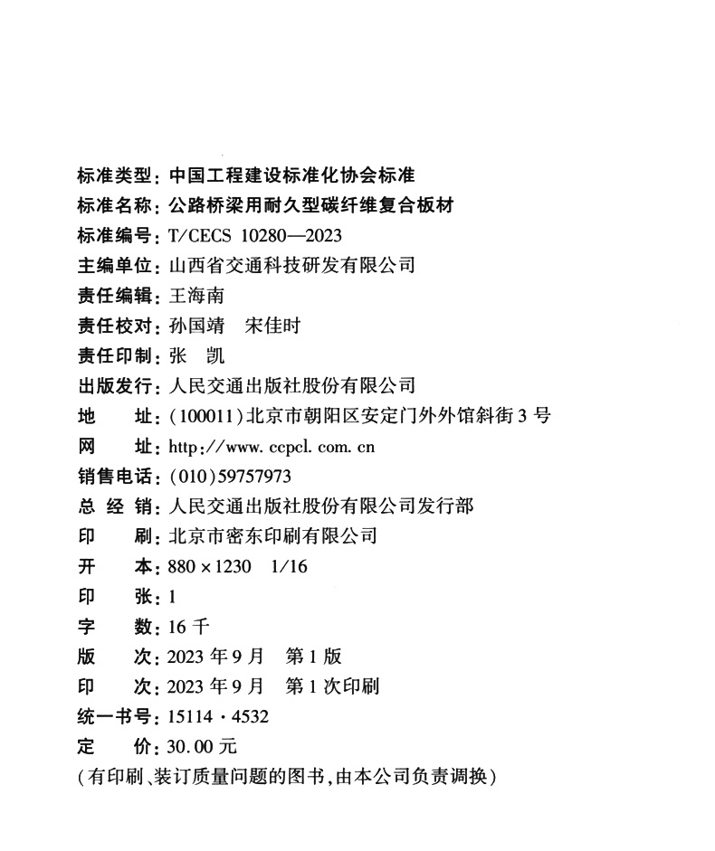 书名:公路桥梁用耐久型碳纤维复合板材(T/CECS:10280—2023)