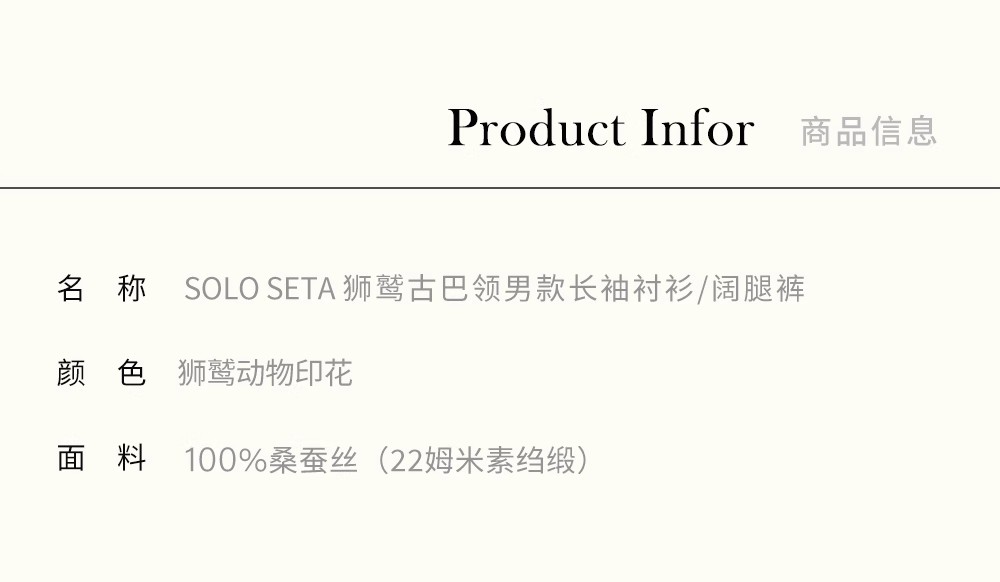- soloseta专注于真丝织物,灵感源自意大利语,中文含义为“只做真丝”的意思。让睡衣变时尚,居家和外出瞬间切换,使其更具有出街,度假,参加宴会等功能。