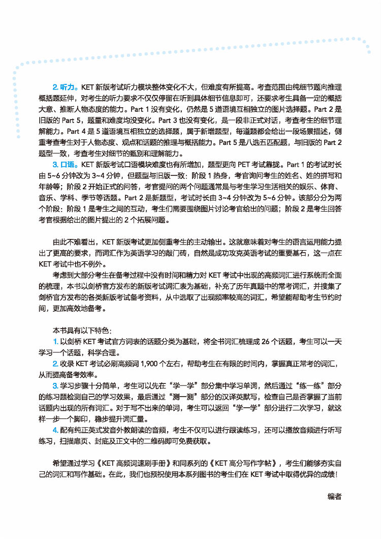 希望通过《KET高频词速刷手册》和同系列的《KET高分写作字帖》这两本书的学习,考生能够夯实自己的词汇和写作基础。在此,我们也预祝使用本系列图书的考生在KET考试中取得优异的成绩!