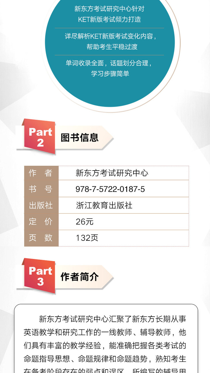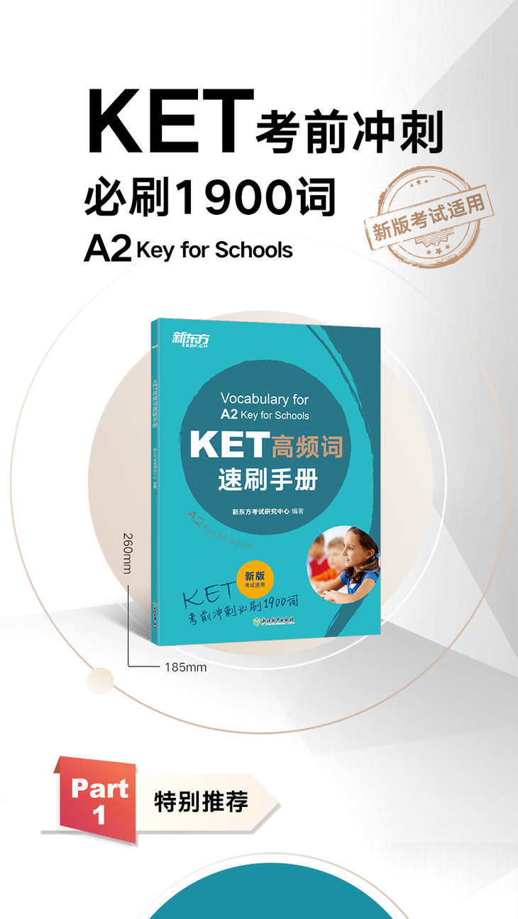 2020年起,KET、PET考试开始全面改革。以KET考试为例,考试时长不变,但是整体难度上浮30%左右,对考生的语言运用能力提出了更高的要求。这就意味着考生需要花更多的时间在语言输入和考试技能的培养上面。词汇作为英语学习的敲门砖,考生如何才能利用有限的时间,掌握真正常考的词汇,提高自己的备考效率呢?为了解决考生的这一痛点,新东方考试研究中心特地出版了《KET高频词速刷手册》一书,希望能帮助考生成功攻克KET词汇难关,在KET考试中取得优异的成绩。
