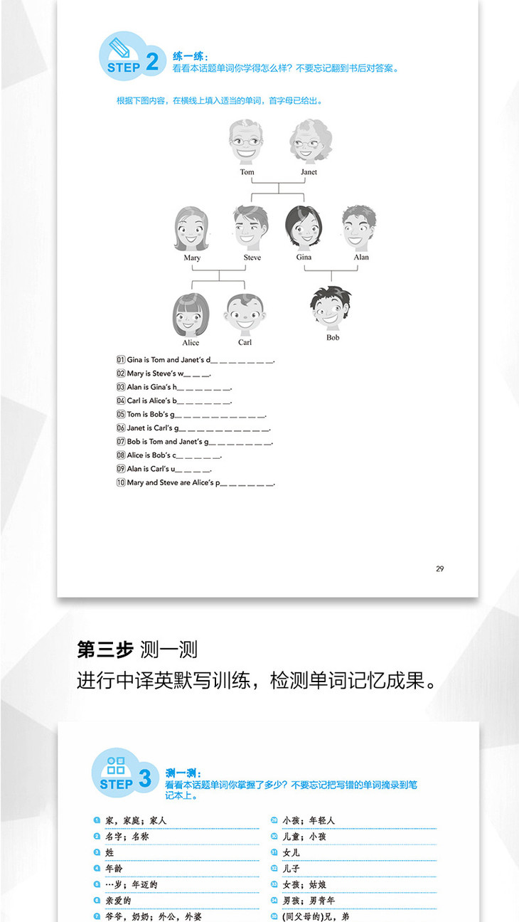 3.学习步骤十分简单,考生可以先在“学一学”部分集中学习单词,然后通过“练一练”部分的练习题检测自己的学习效果,最后通过“测一测”部分的汉译英默写检查自己是否掌握了当前话题内出现的所有词汇。对于写不出来的单词,考生可以返回“学一学”部分进行二次学习,就这样一步一个脚印,稳步提升词汇量。
