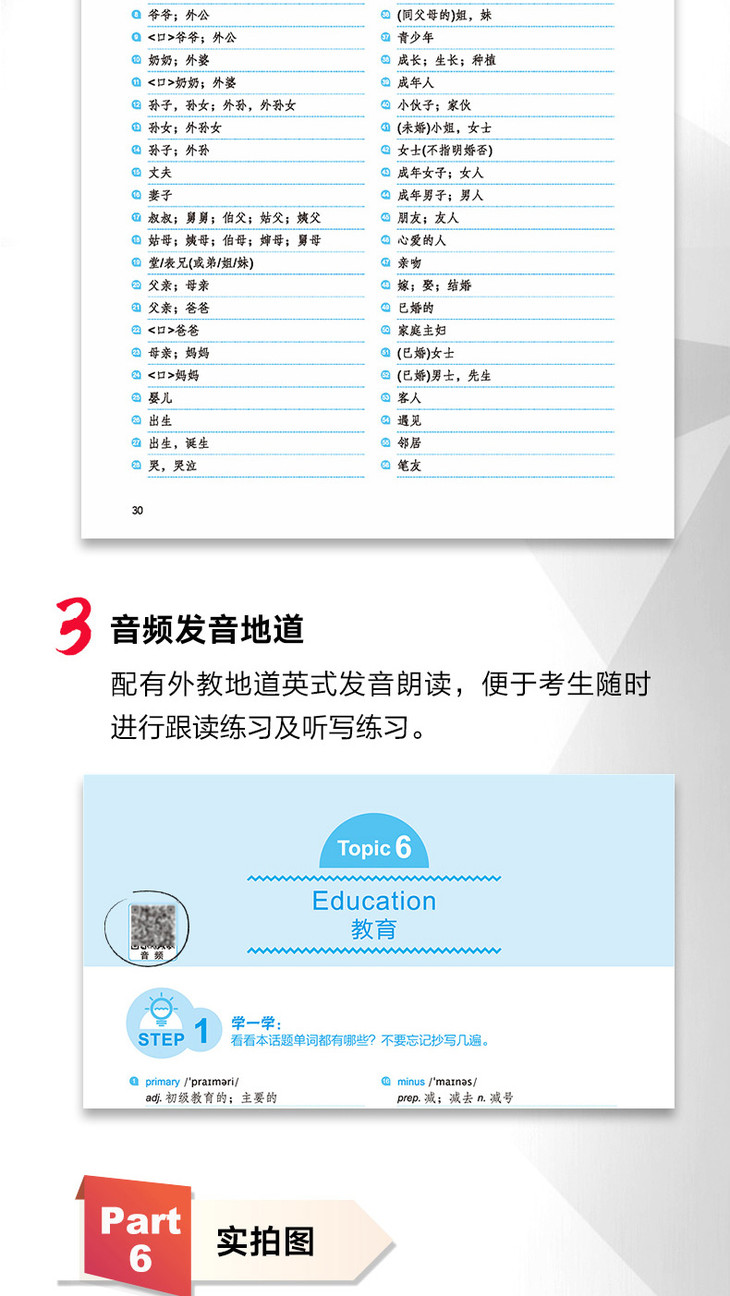 4.本书配有专业外教朗读的音频,纯正英式发音,考生不仅可以进行跟读练习,还可以播放音频进行听写练习,扫描扉页、封底及正文中的二维码即可免费获取。