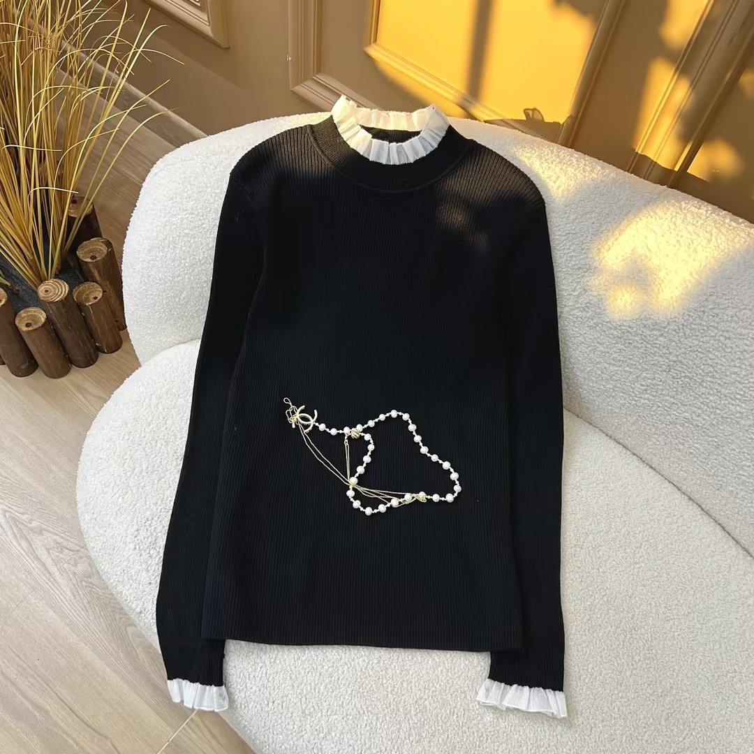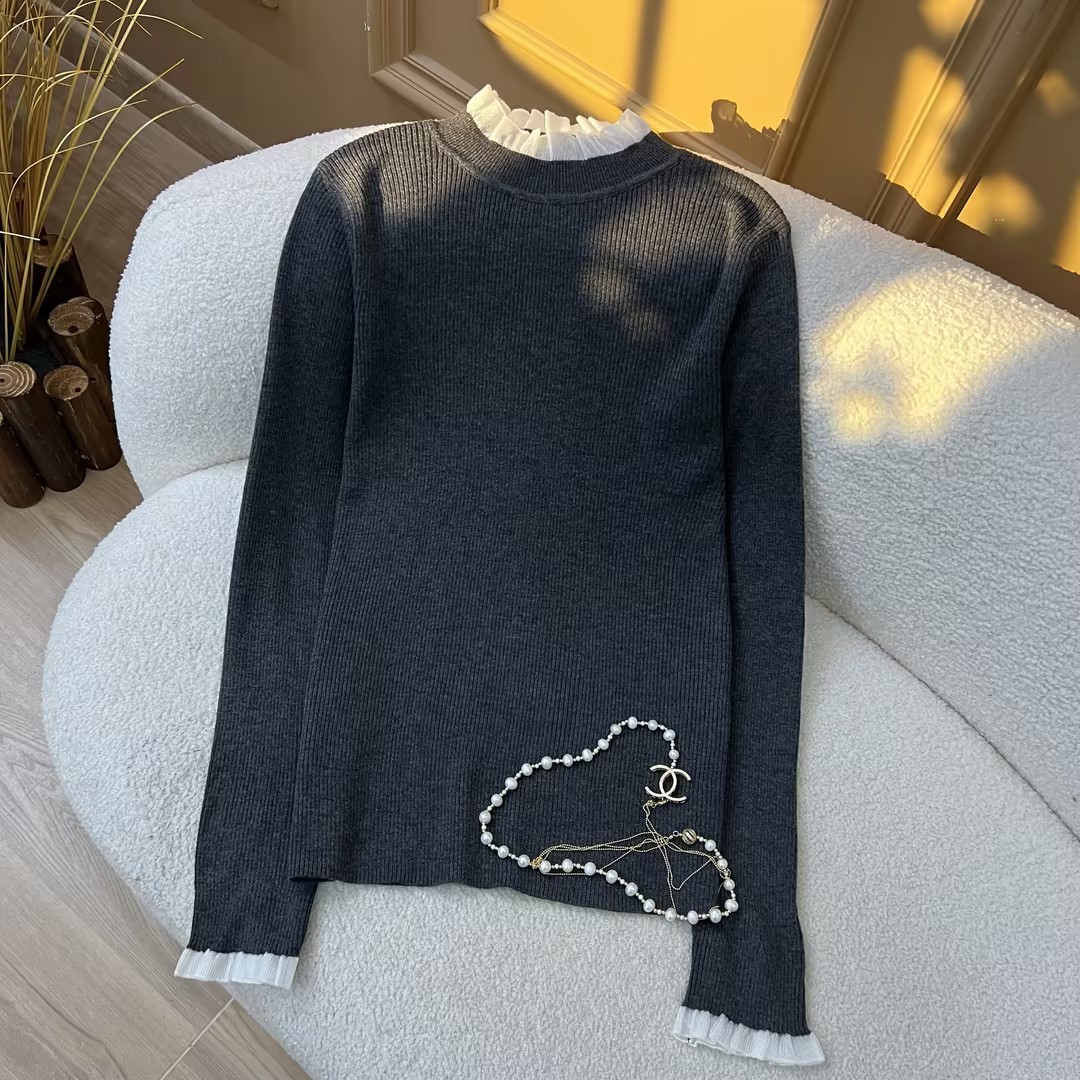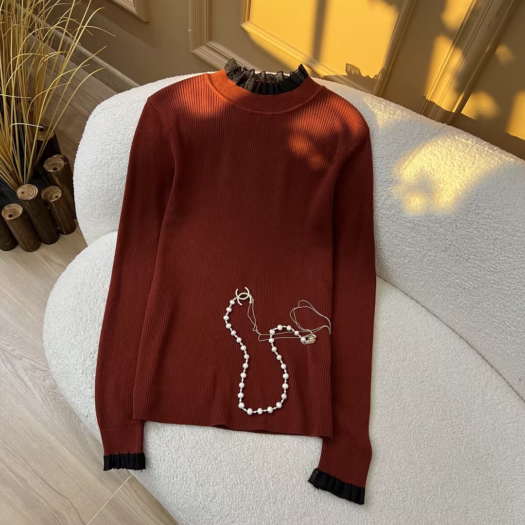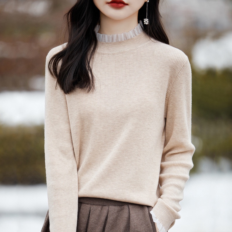 绯色织梦~抽条欧根纱木耳领花边针织套头衫
