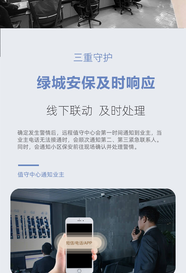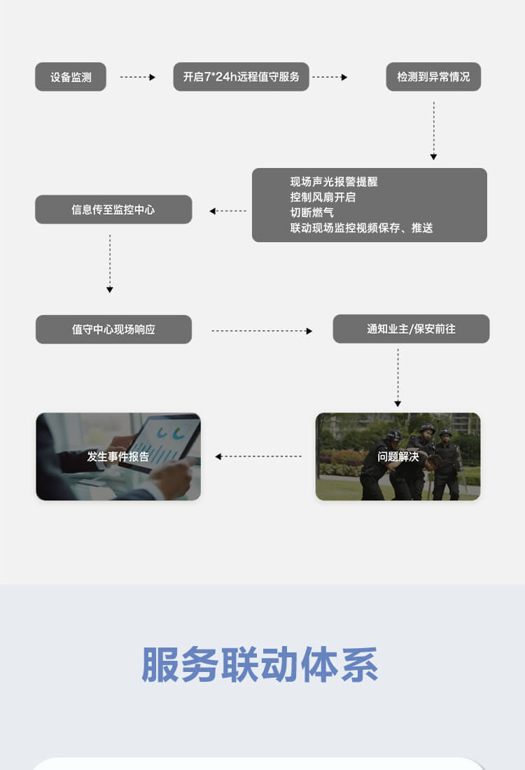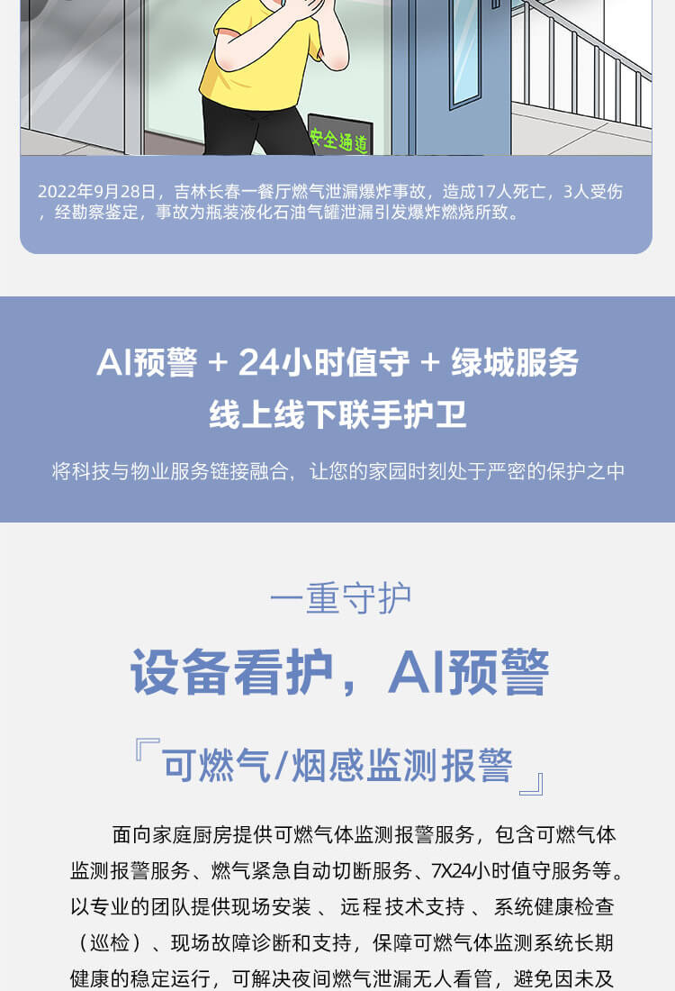 我们为客户提供家庭、商住场景的24小时在线防盗、防火、防毒以及无人化管理服务。实现老旧电子、消防设备“e”键入云,99%时间无故障使用,并升级智能化能力。