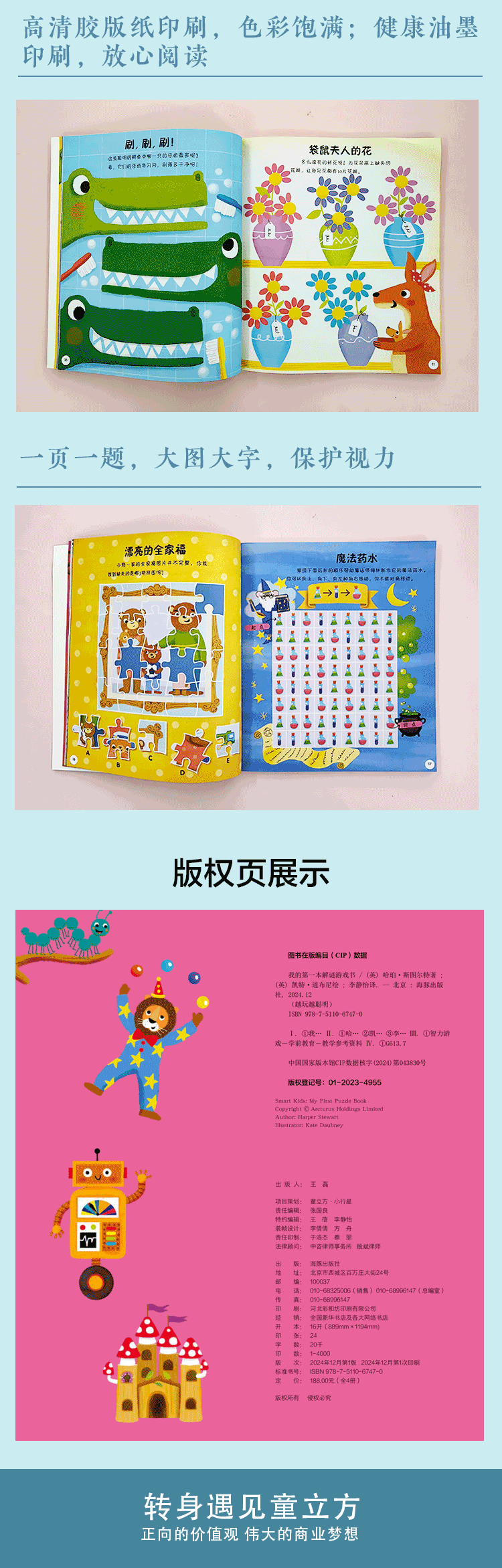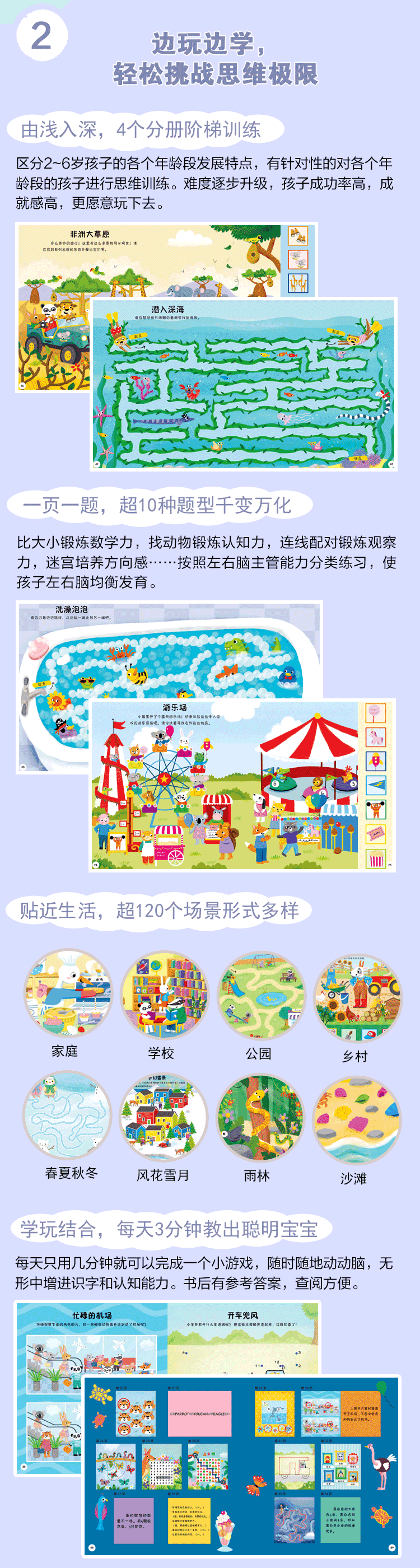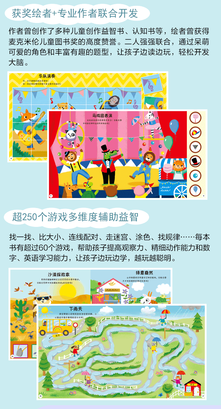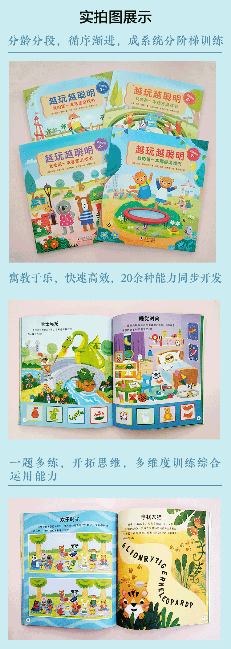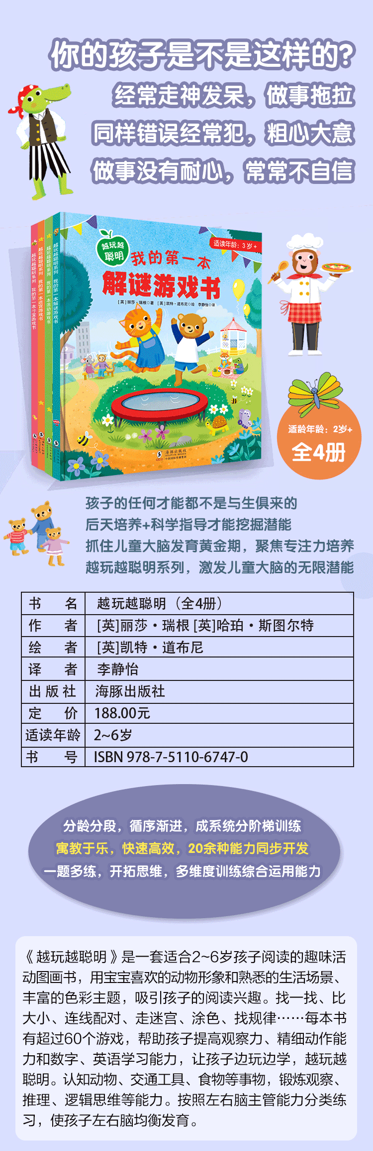 《越玩越聪明》是一套适合2~6岁孩子阅读的趣味活动图画书,用宝宝喜欢的动物形象和熟悉的生活场景、丰富的色彩主题,吸引孩子的阅读兴趣。找一找、比大小、连线配对、走迷宫、涂色、找规律……每本书有超过60个游戏,帮助孩子提高观察力、精细动作能力和数字、英语学习能力,让孩子边玩边学,越玩越聪明。认知动物、交通工具、食物等,锻炼观察、推理、逻辑思维等能力。按照左右脑主管能力分类练习,使孩子左右脑均衡发育。