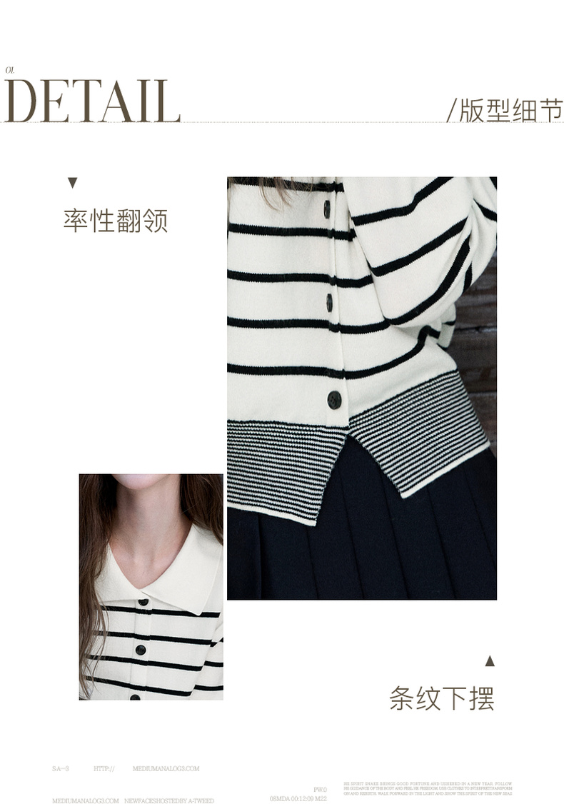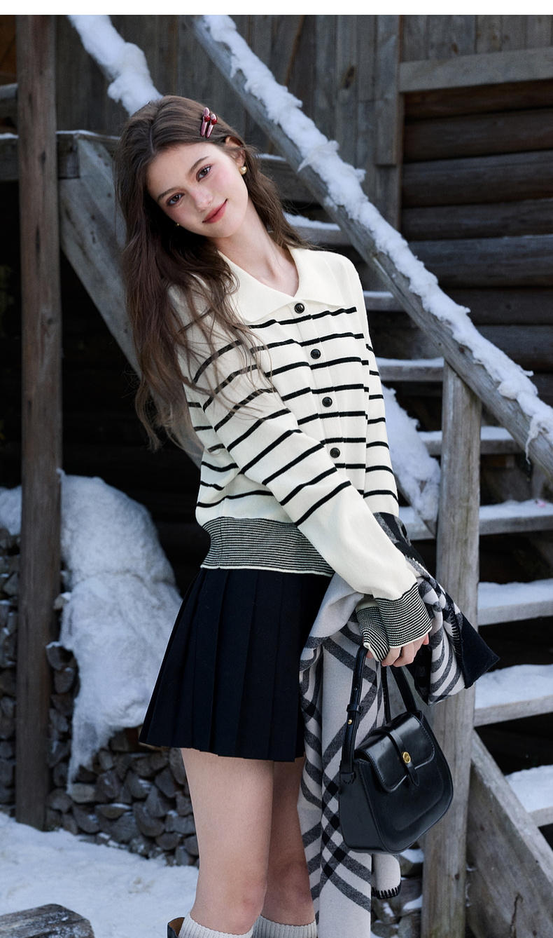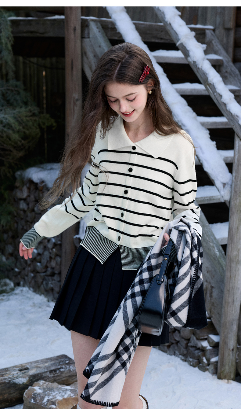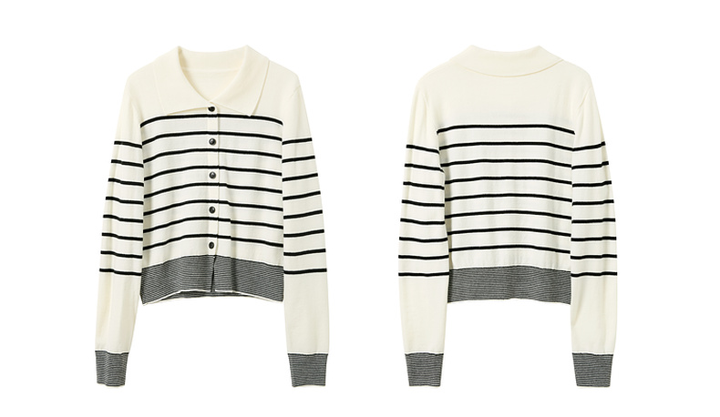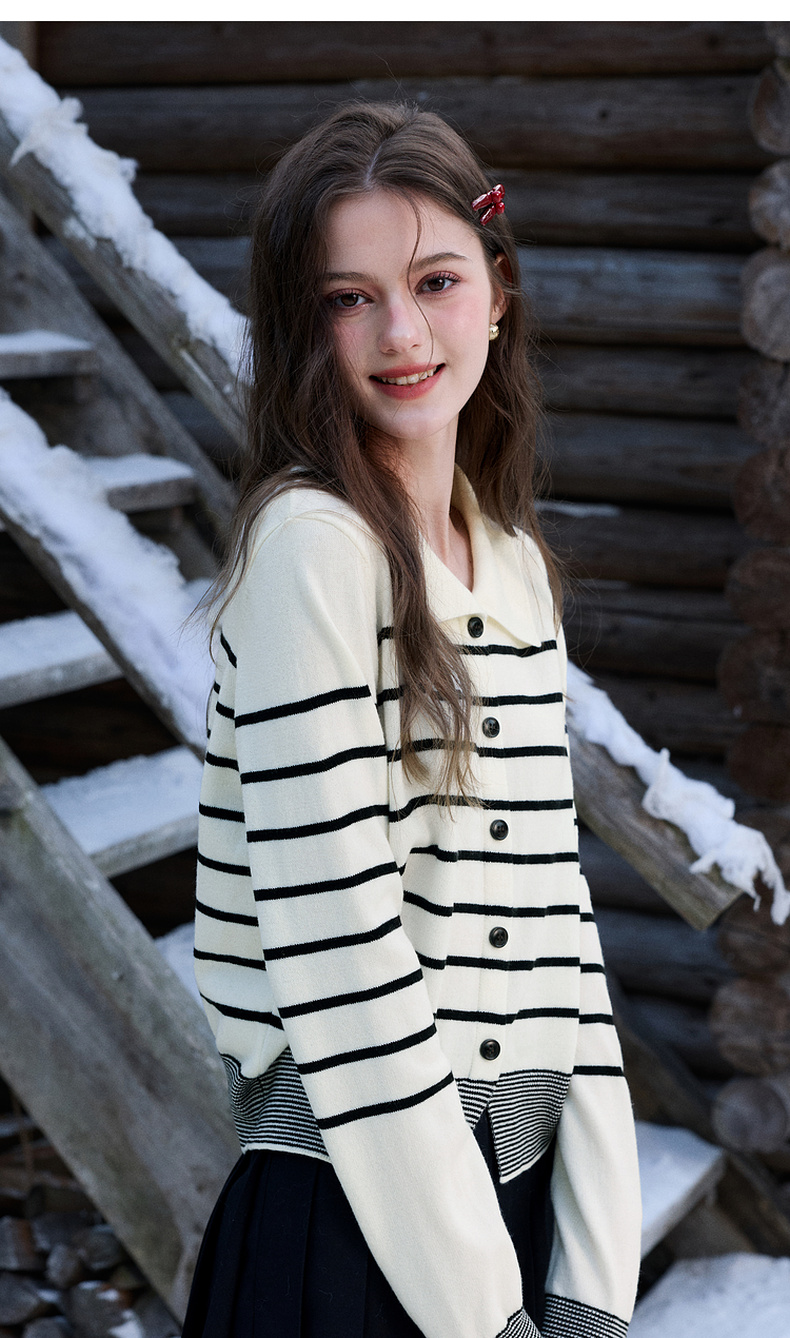 三彩2025冬季新款休闲简约撞色条纹针织衫长袖翻领套头毛衫上衣M