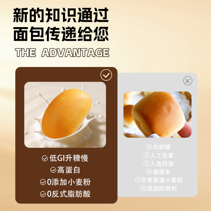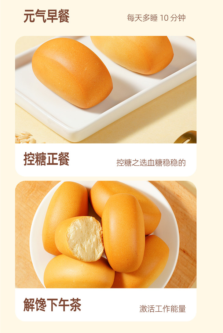 全场景适配! 从早八到露营,承包你的 24 小时 🌅 早餐救星:1 袋面包 + 1 杯豆浆,3 分钟搞定营养早餐,早八人再也不用空着肚子赶地铁; 🍵 下午茶担当:独立小包装揣兜里,开会、刷题饿了来一个,抗饿不升糖,工作学习效率翻倍; 👶 宝妈神器:无添加配方放心给娃当零食,松软不卡喉,再也不用担心孩子啃面包掉渣; 🏕️ 户外必备:露营、徒步揣几包,常温锁鲜 60 天,随时补充能量,轻装上阵无负担; 🤱 控糖人群本命:糖尿病人群、胰岛素抵抗者的友好加餐,搭配咖啡 / 酸奶碗,解锁「控糖自由」新姿势!