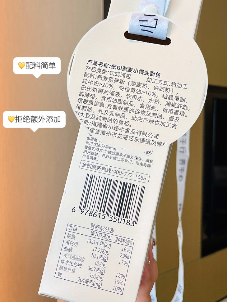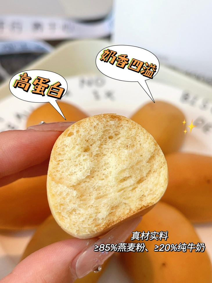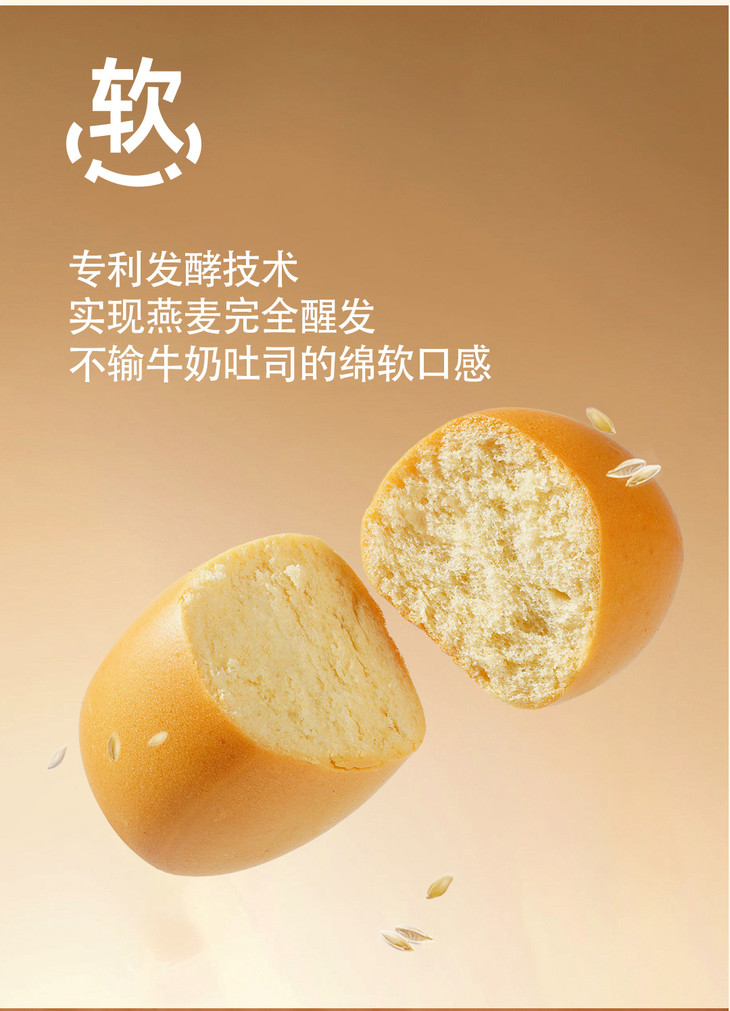 口感封神!重新定义燕麦面包的「柔软哲学」 谁说燕麦制品一定粗糙干涩❓ ✔️ 独家专利发酵技术攻克燕麦「死面」难题,揉出云朵般蓬松气孔,轻捏回弹不塌陷; ✔️ ≥20% 纯牛奶 + 10% 安佳黄油鲜奶揉面,奶香从掰开的瞬间就扑鼻而来,咬下是柔润绵密的奶霜感,连吞咽都带着回甘; ✔️ 小小一个掌心大小,宝宝小手轻松抓握,老人也能咬得动,全家老小都抢着吃!