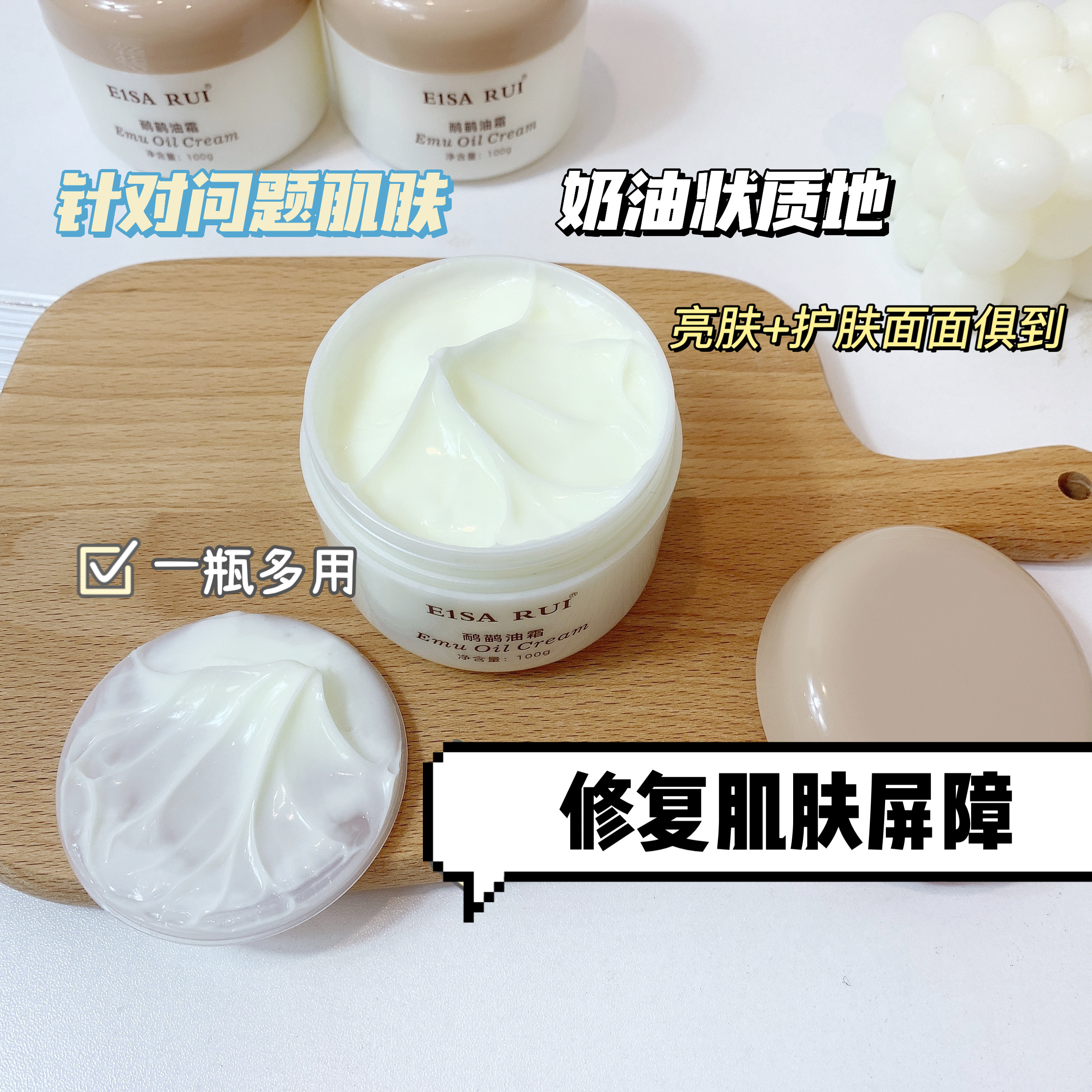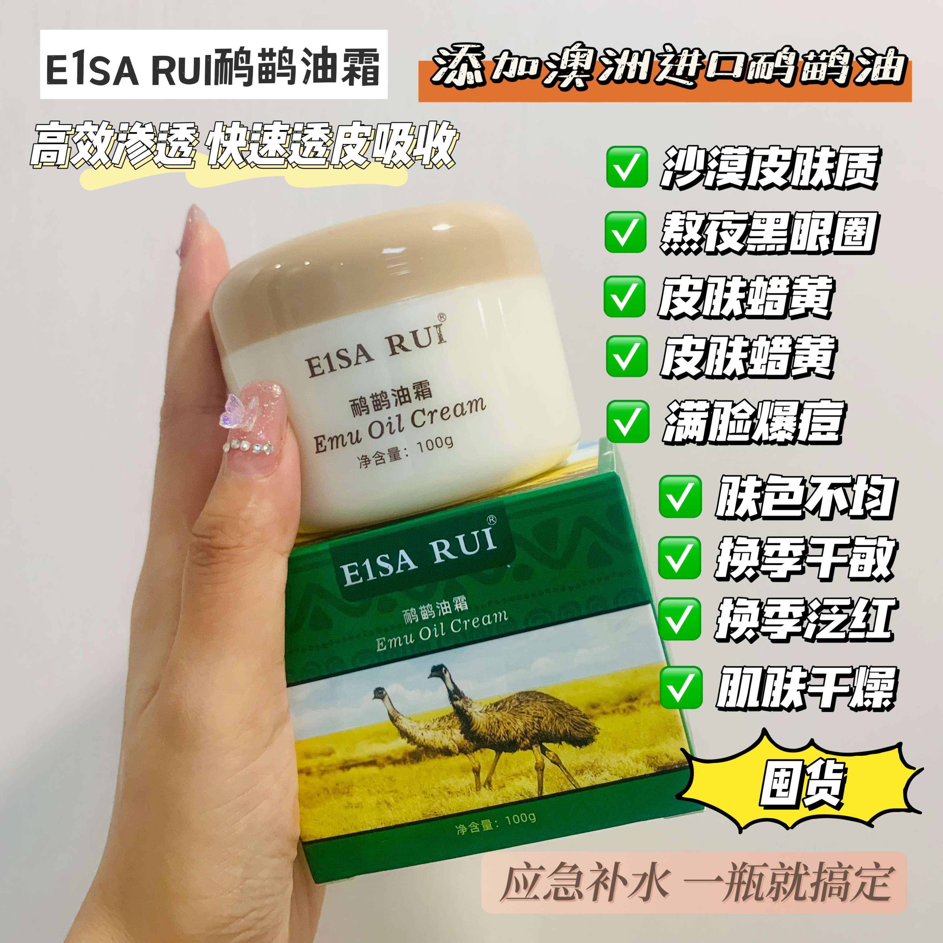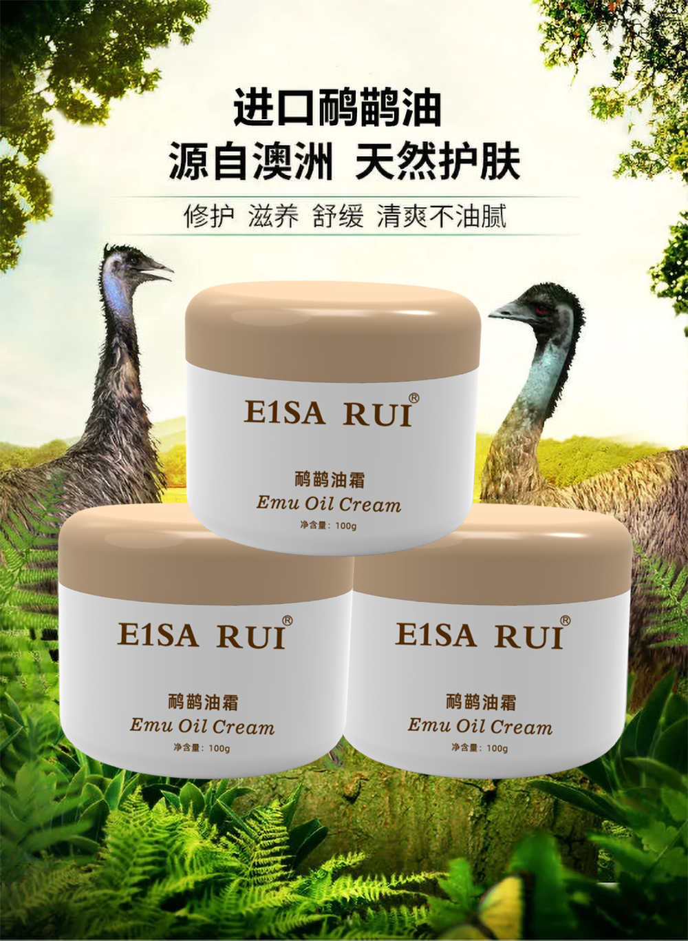 E1SA RUI鸸鹋油霜多重功效:补水、滋润、抗衰老、增强肌肤抵抗力、修复产后皮肤、可以做面霜、身体乳等,一瓶多用。采用进口鸸鹋油,天然成分,0酒精,0色素,0矿物油。全家可用。