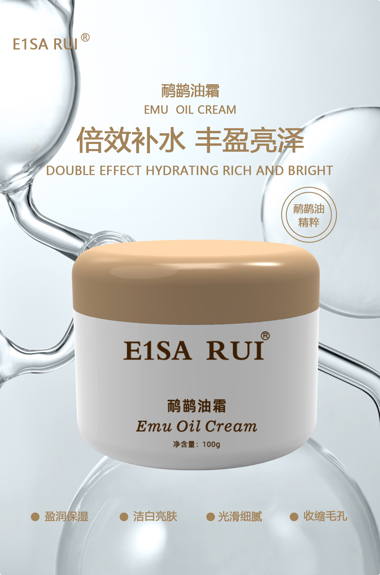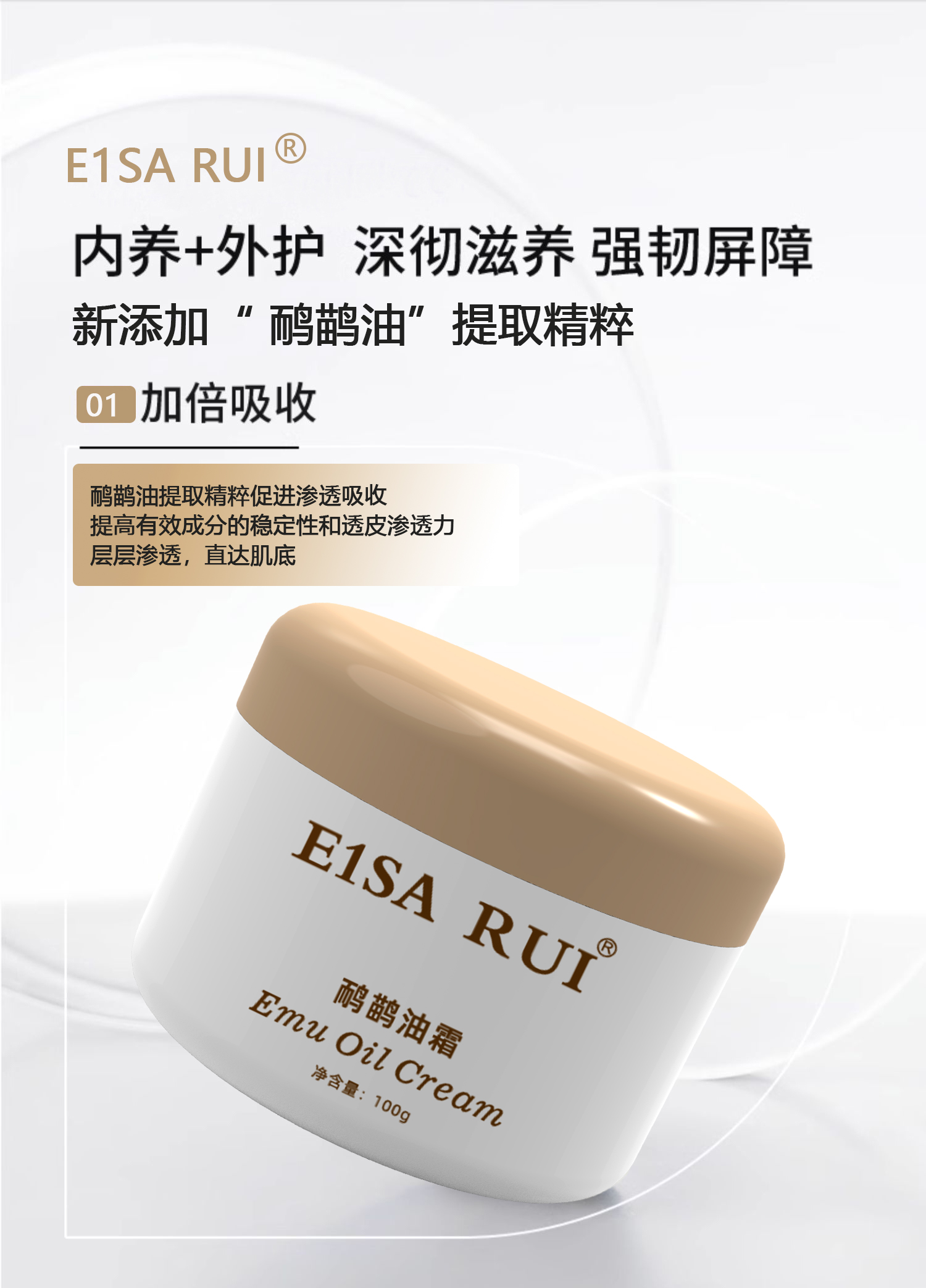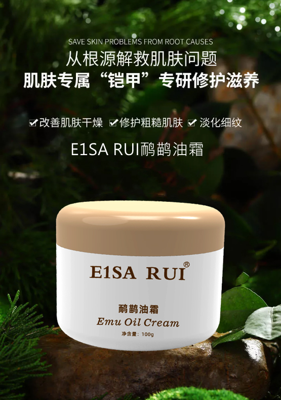 E1SA RUI鸸鹋油霜渗透力强,能促进皮肤细胞再生,维护深层细胞的稳定性,建立坚固的肌肤屏障。具有消湿疹、皮炎的作用,修护力强,能够缓解痘痘肌、泛红等问题肌肤。有效为肌肤补充水分,提亮肌肤暗沉,让你的肌肤变得水润透亮。