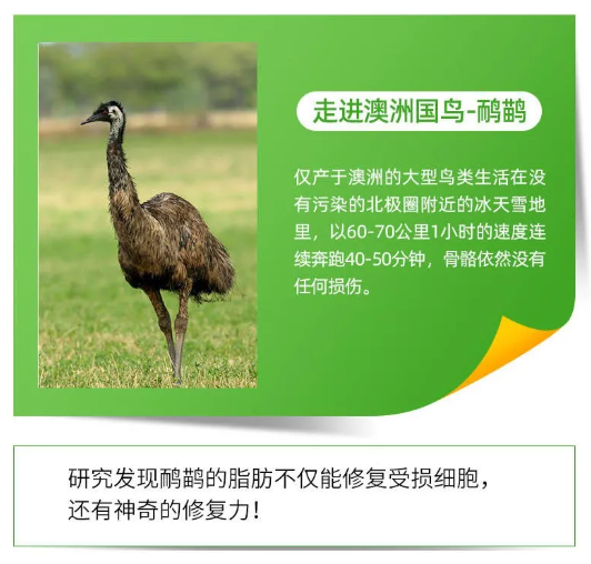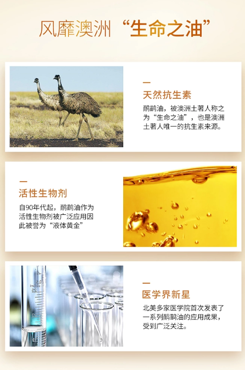 鸸鹋油被澳洲土著人称为“神油”,是他们抗炎药物唯一来源,被称为“生命之油”也称之为“液体黄金”。鸸鹋的生理结构和骆驼相似,全身的脂肪都集中在背部脂肪囊中。从脂肪囊中提炼出的鸸鹋油,含有丰富的油酸、亚油脂肪酸、维生素E、维生素A、OMEGA-3、OMEGA-6等天然成分。