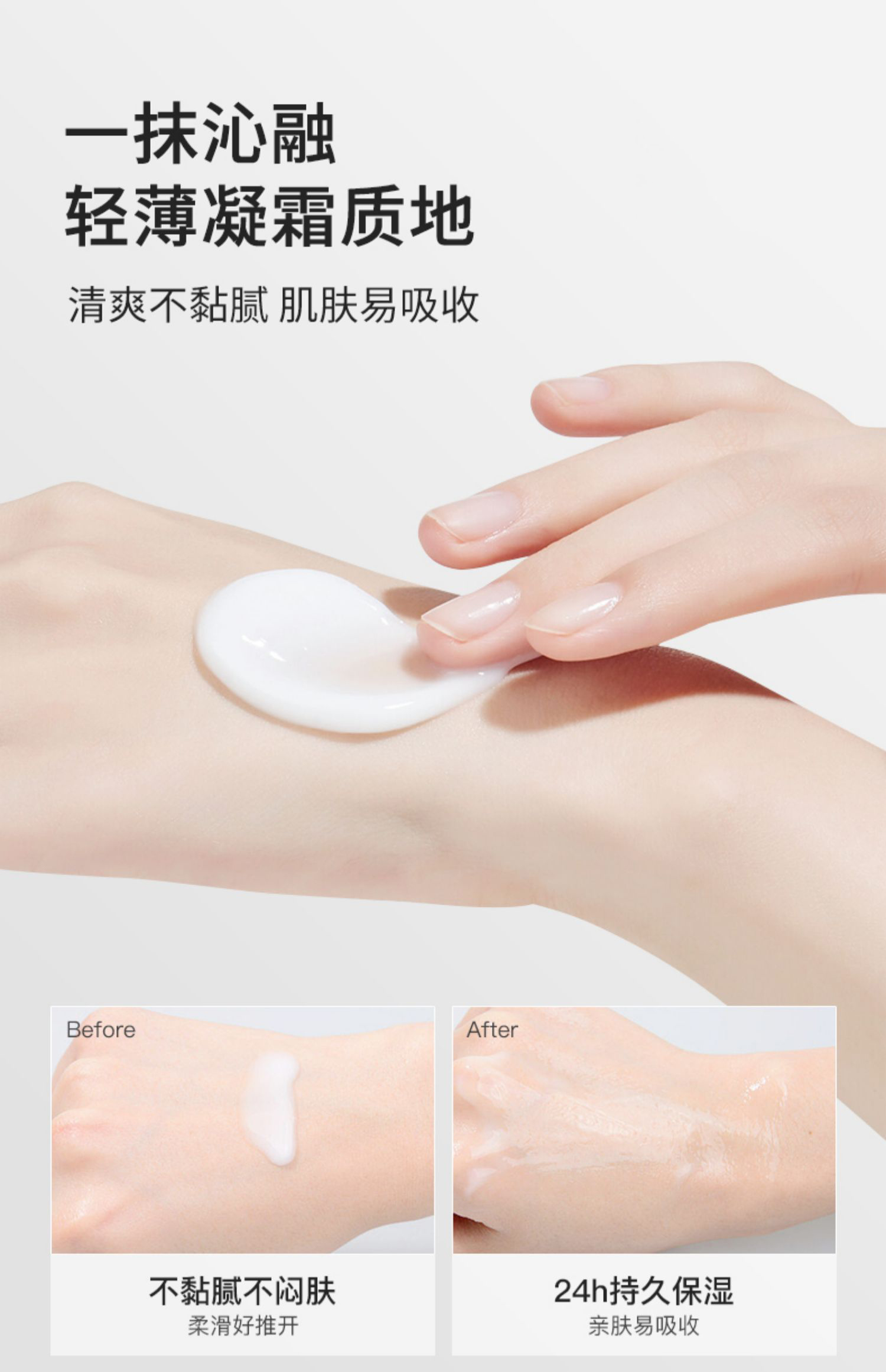 打开之后是有点像奶油般的质地在手上试了一下,不粘腻,被皮肤吸收快,没有一般面霜的粘腻感和厚重感。上脸有点凉凉的,很润很舒服,是一年四季都可以用配置~涂开来延展性很好,配合按摩手法涂抹,吸收效果更胜一筹。
