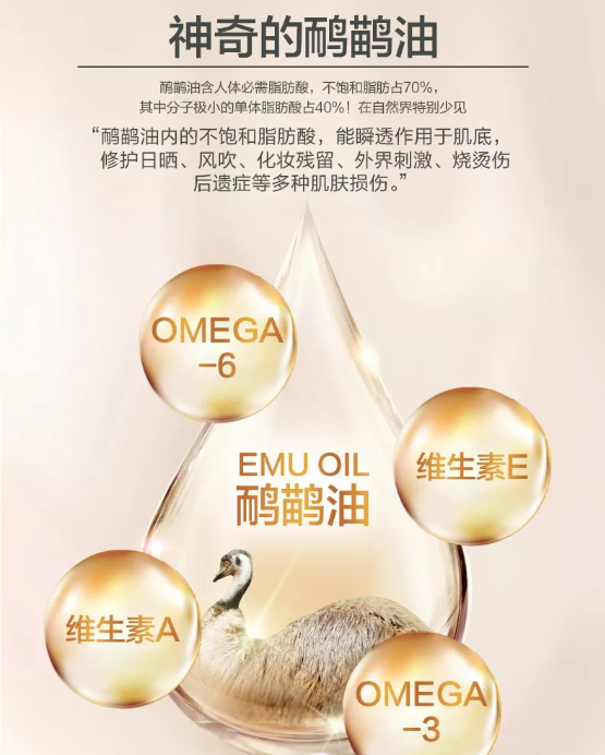 鸸鹋油里面含有大量的DHA不饱和脂肪酸,能够有效缓解肌肤的炎症。