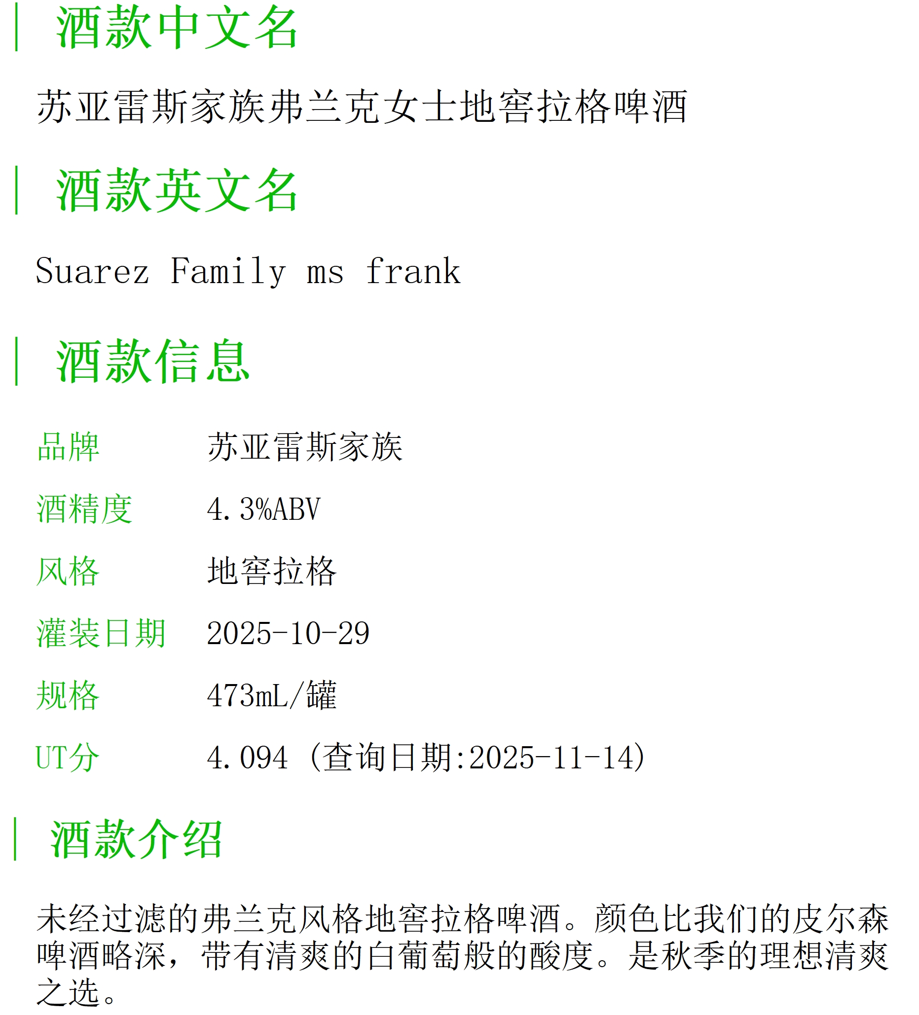 苏亚雷斯家族弗兰克女士地窖拉格啤酒