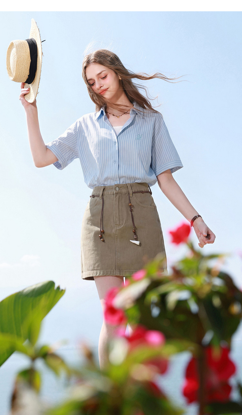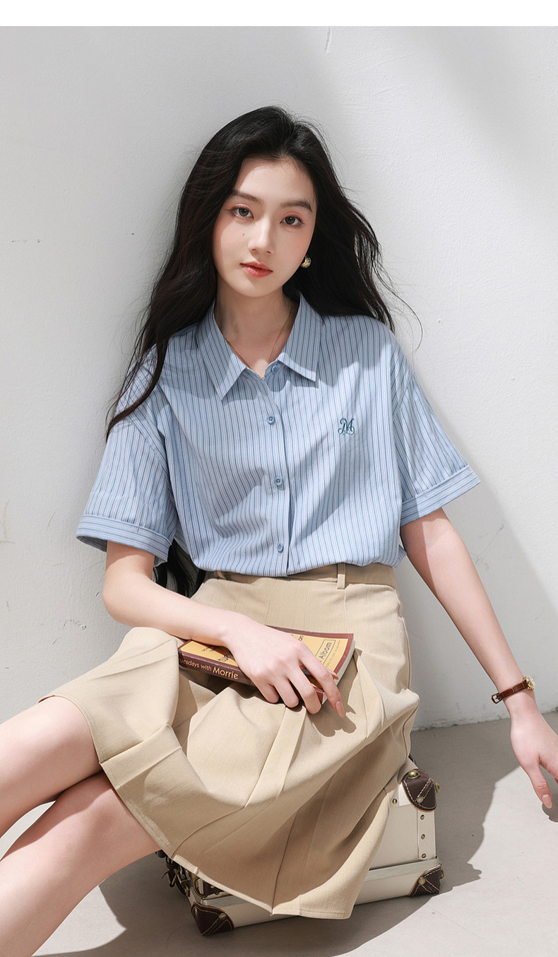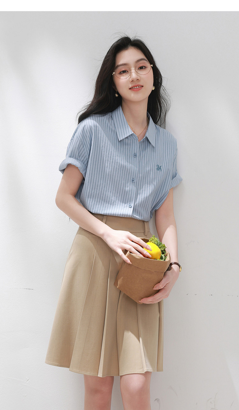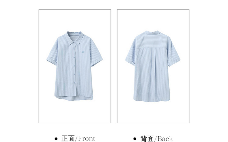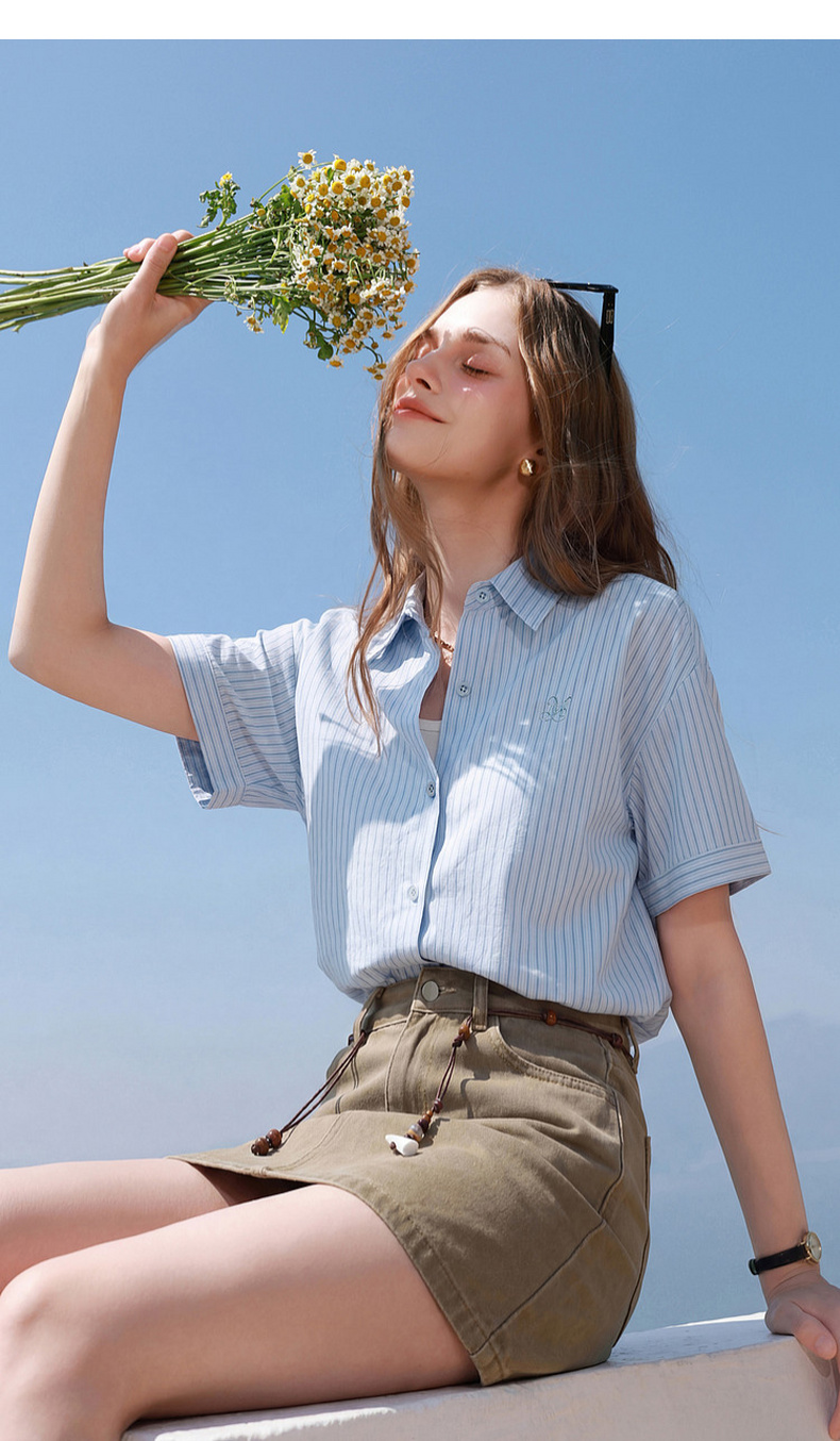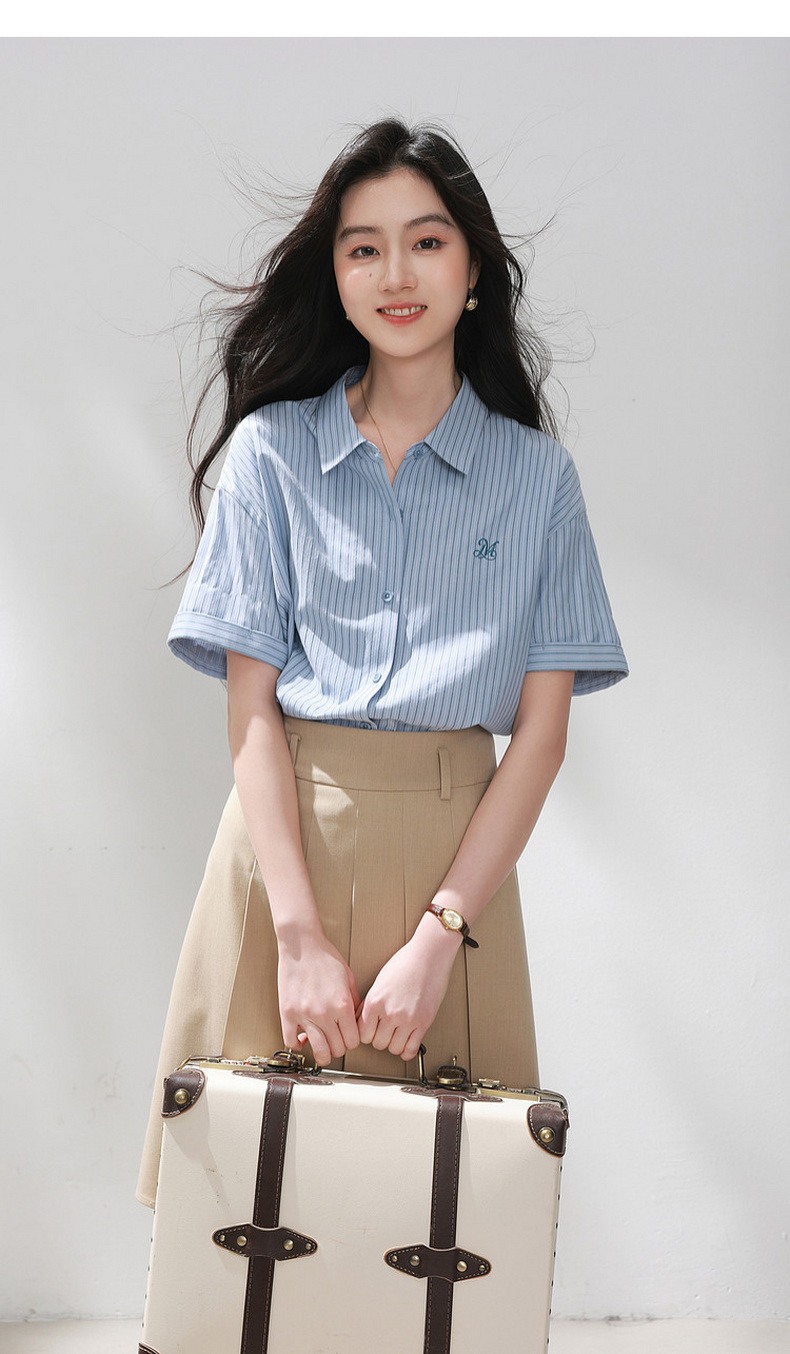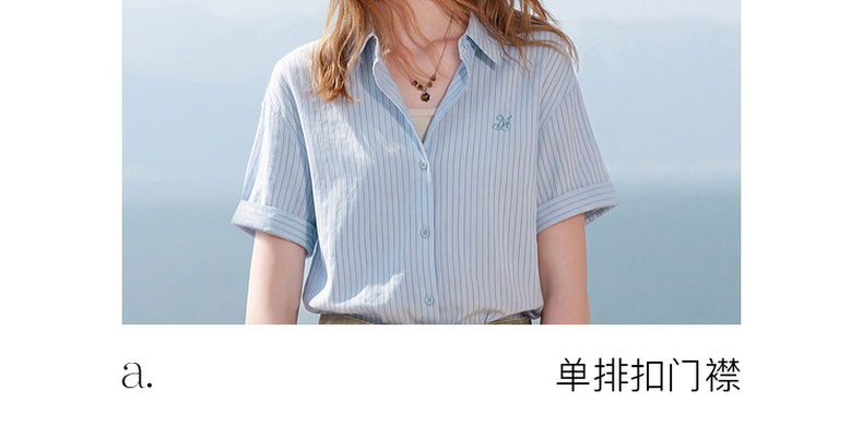 三彩2026夏季新款条纹衬衫刺绣宽松翻领休闲衬衣简约M