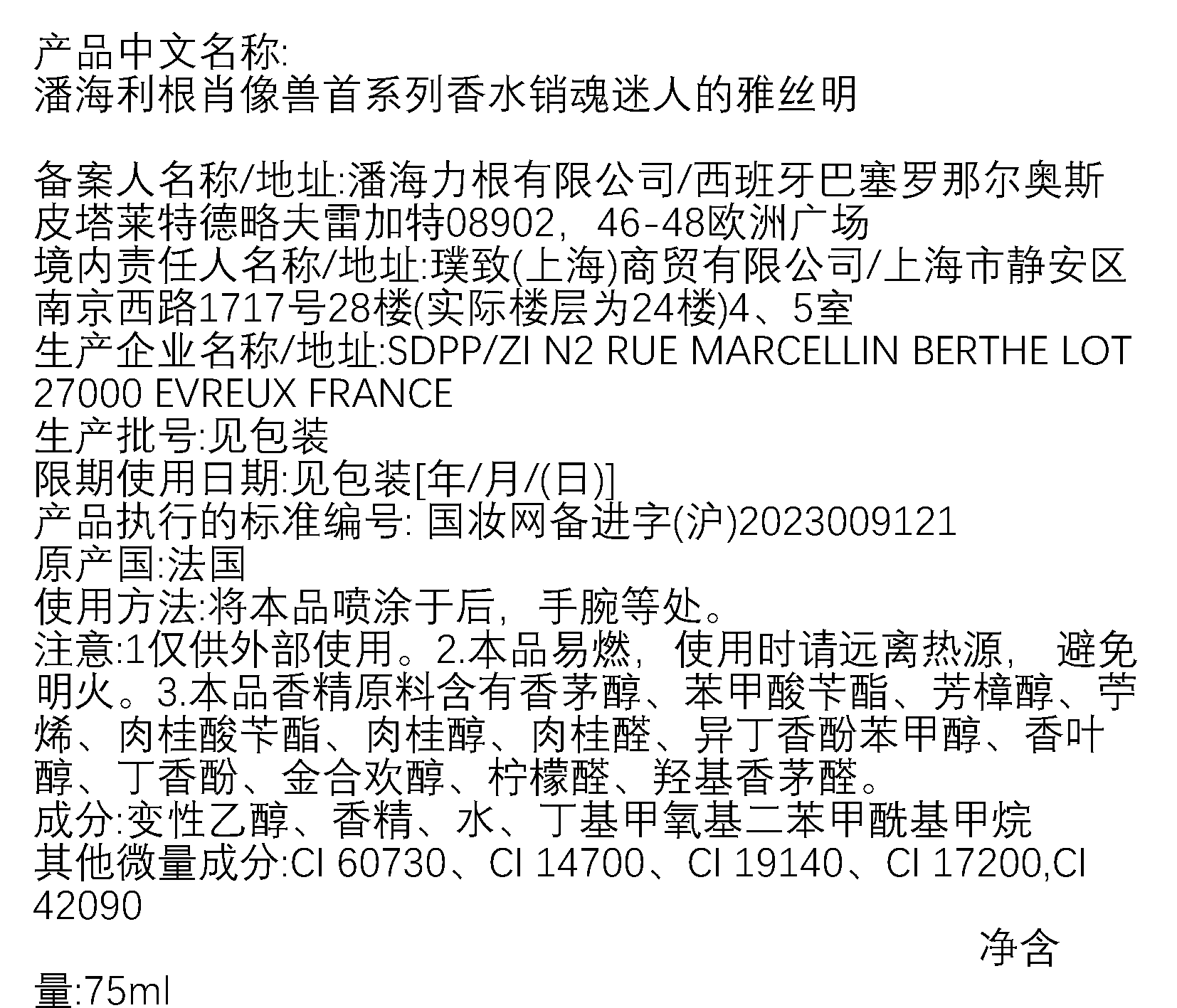 Penhaligon's潘海利根兽首系列 销魂迷人的雅丝明/猫头香水