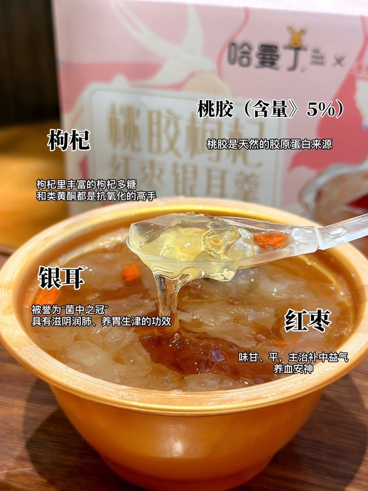 【哈曼丁·桃胶枸杞红枣银耳羹】 配料干净,每一口都是天然滋养 滋味非凡,健康从每一餐开始! 纯天然,滋味好 给您带来的不仅是美味,更是健康与自信