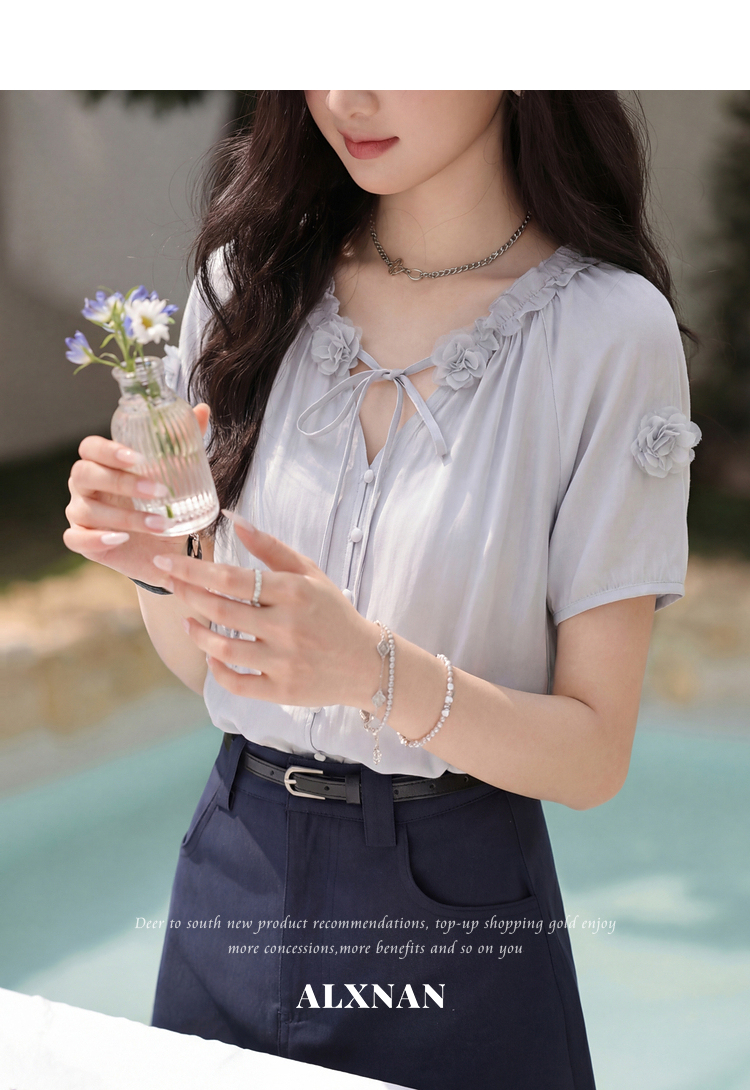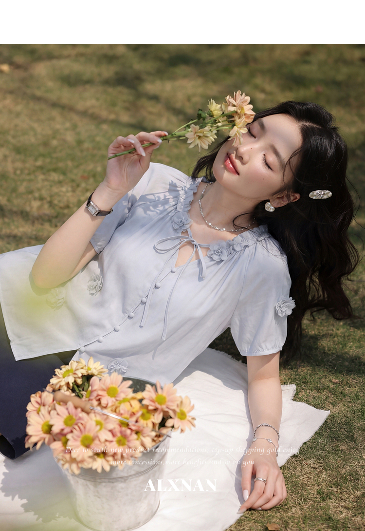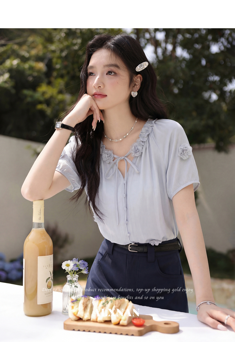 鹿向南【0405/20:00新品前1小时7折限量100件】蓝色花边短袖衬衫
