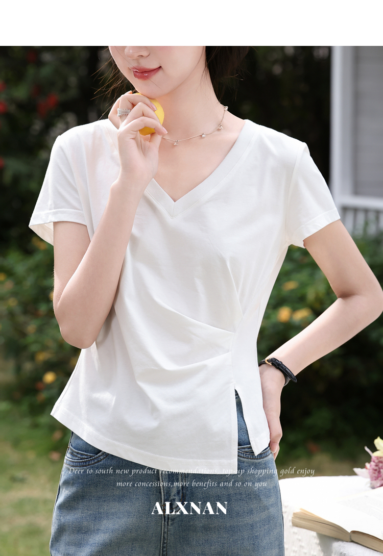 鹿向南「云白轻叙」白色V领短袖T恤夏新款修身显瘦百搭气质上衣女