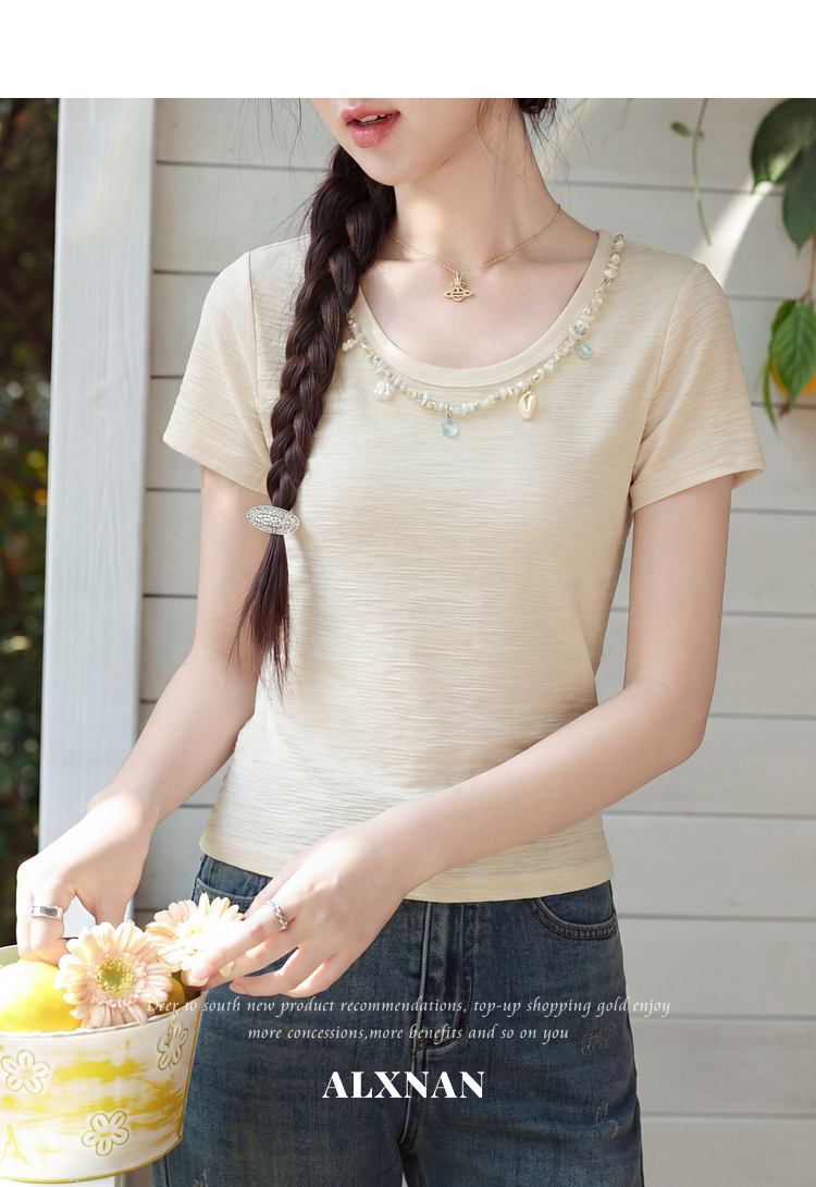 鹿向南「星芒缀衣」杏色圆领短袖T恤夏季新款修身显瘦气质上衣女