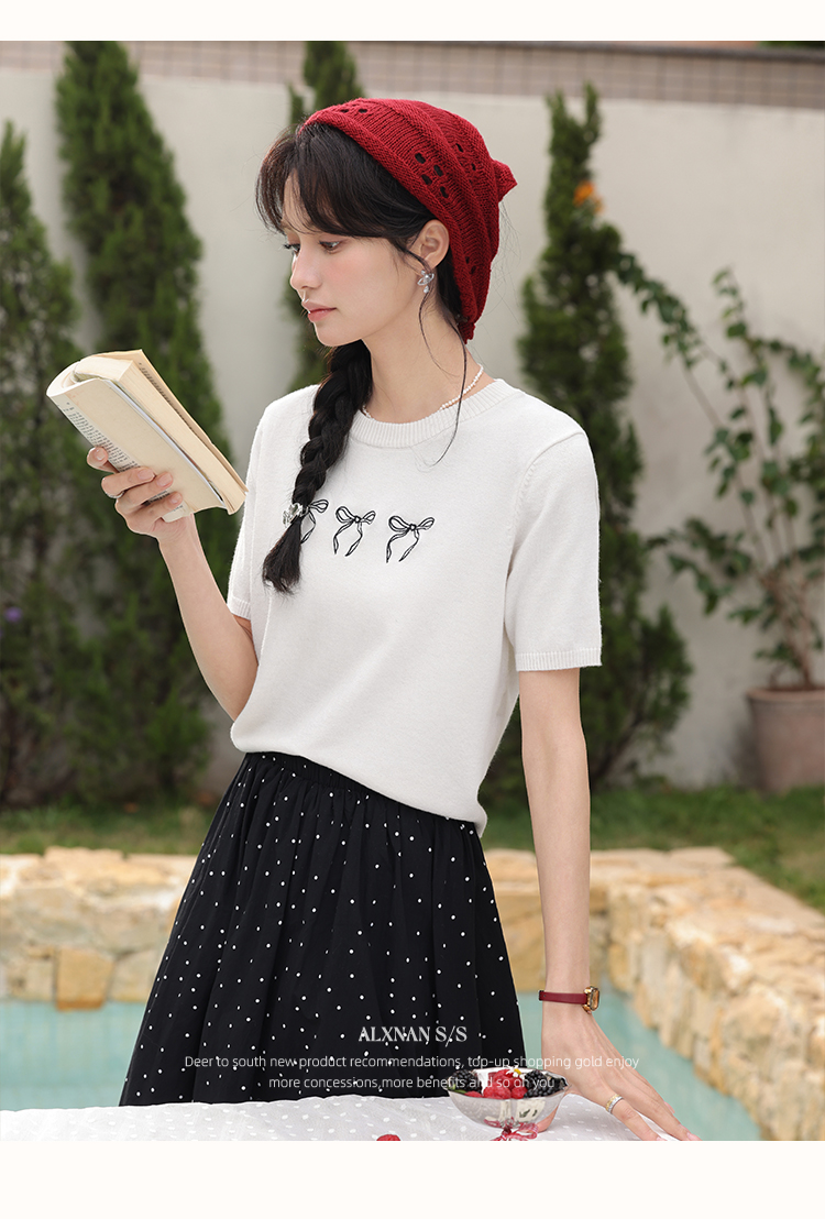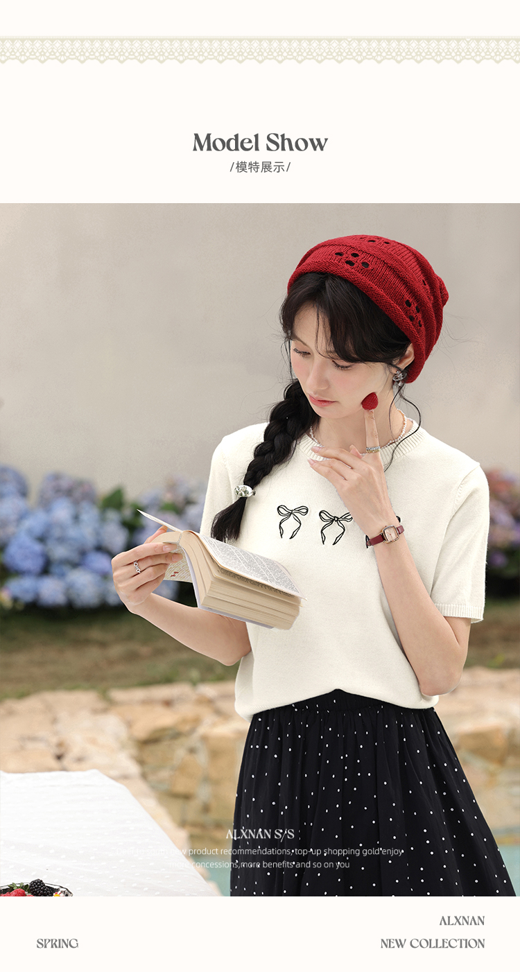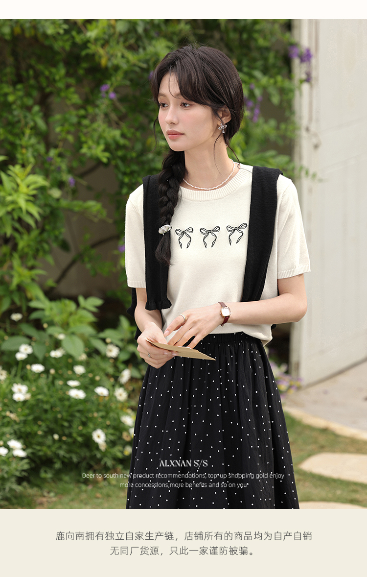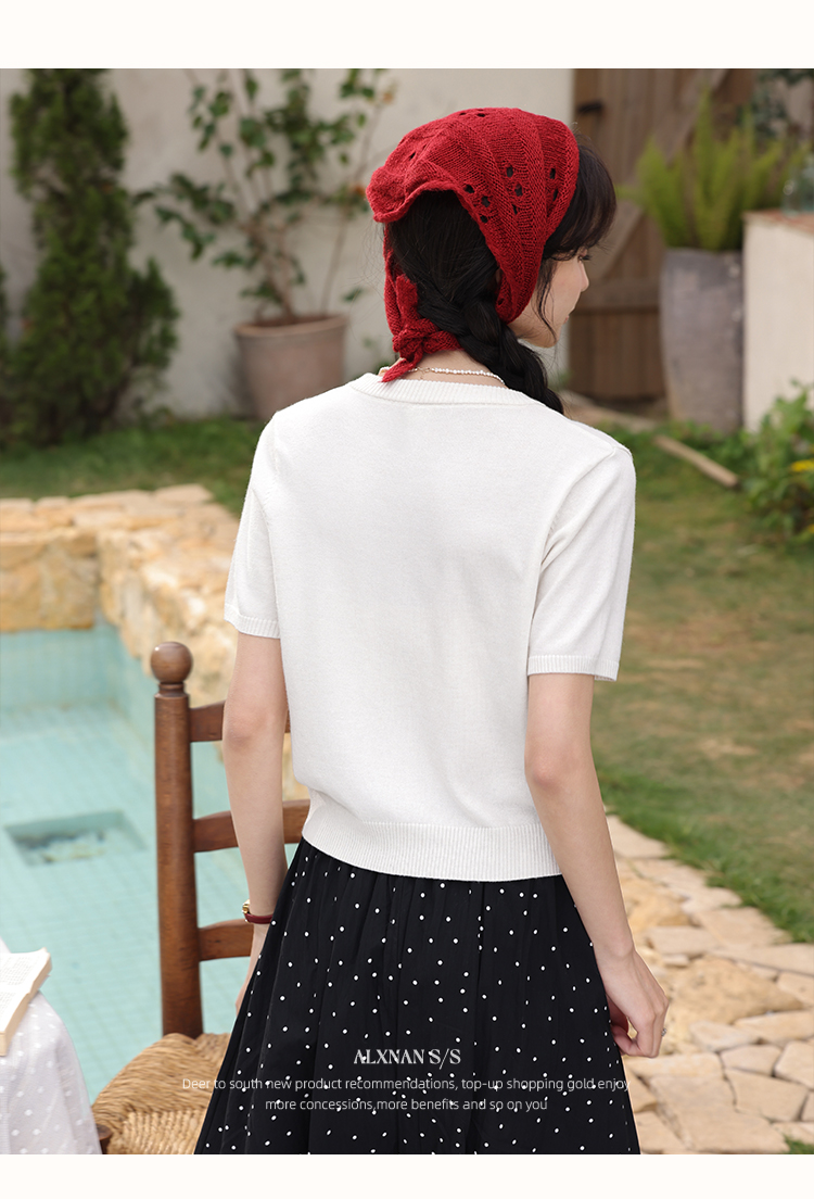 鹿向南「夏日物语」白色正肩针织衫短袖女夏季设计感小众修身上衣L55032