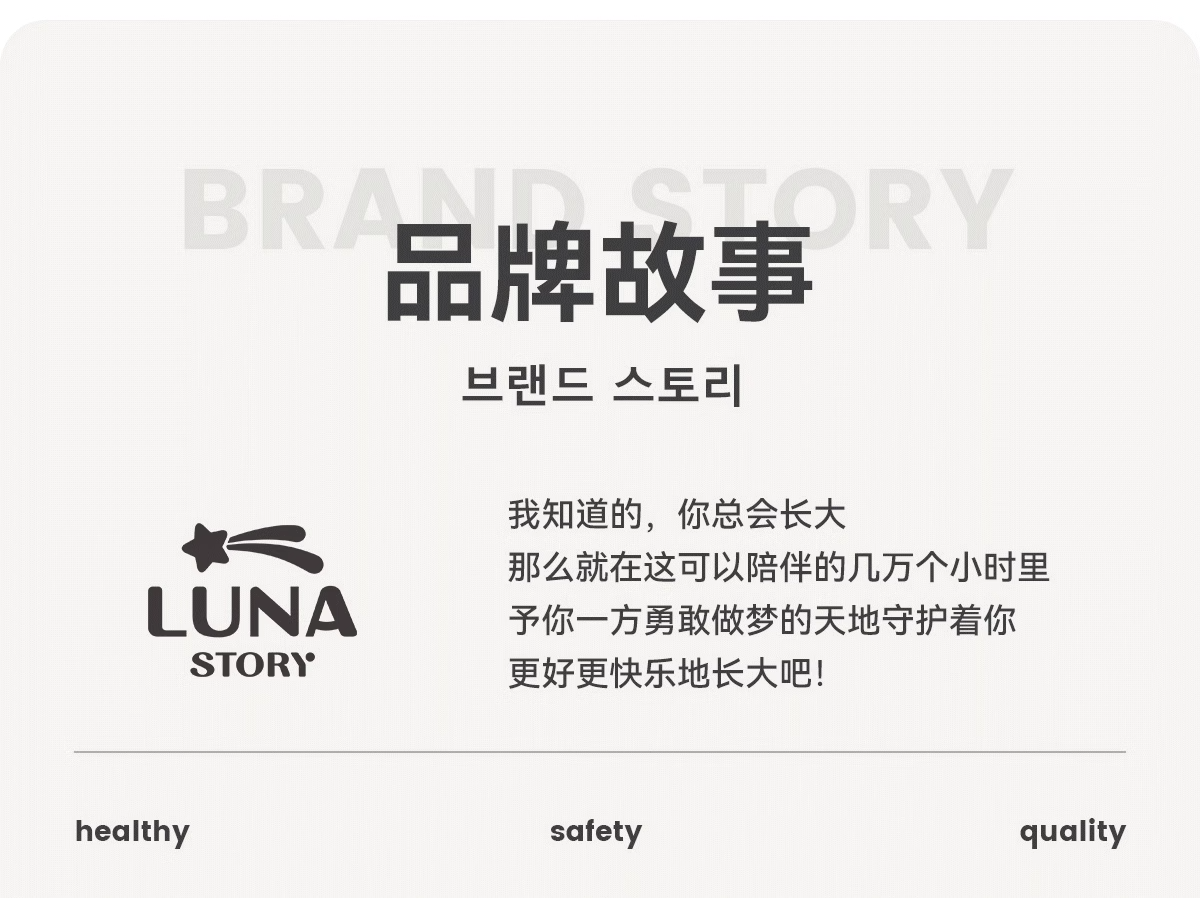 - Lunastory是2017年全新推出的母婴用品高端品牌,致力于维护孩子的安全与健康。以父母之心,开发多种母婴用品,目标是让客户只用Lunastory就能打造出温馨的儿童房。