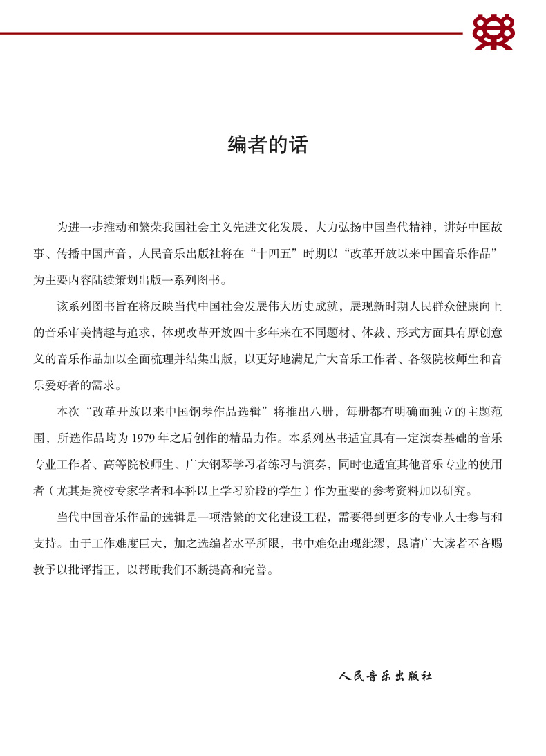 人民音乐出版社是我国最具规模与影响力的国家级音乐专业出版机构,在国内外具有重要学术地位。成立69年来,始终以“用音乐记录历史、用出版记录音乐”为企业使命,积累了丰富的音乐专业类图书资源。