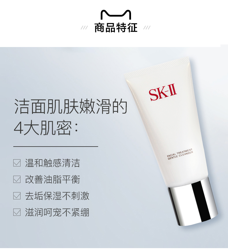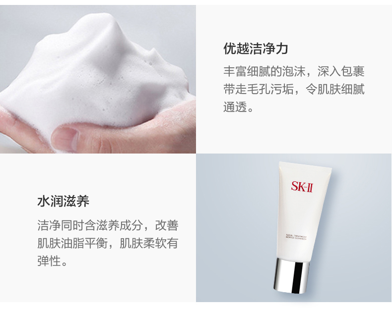 温和洁面,优越洗净力与肌肤pH值相当的弱酸性配方﹐蕴含SK-II PiteraTM 、水解亚麻子提取物及保湿成分。温和而具有优越洁净力,其丰富而幼细的保湿泡沫可把污垢包围,然后从肌肤带走,给予您细腻通透照人的肌肤。