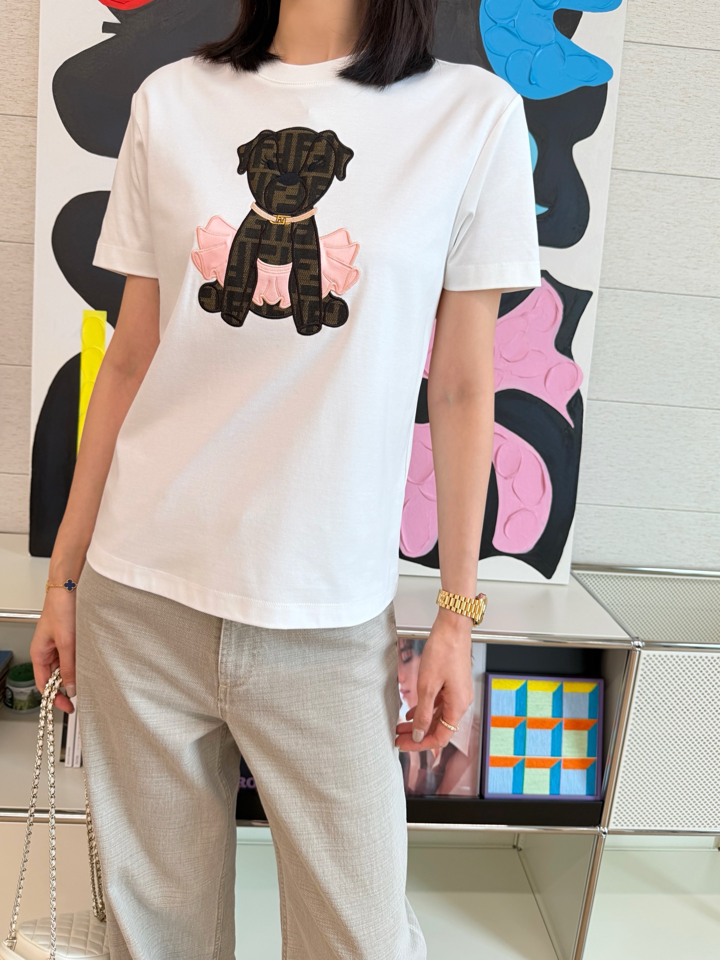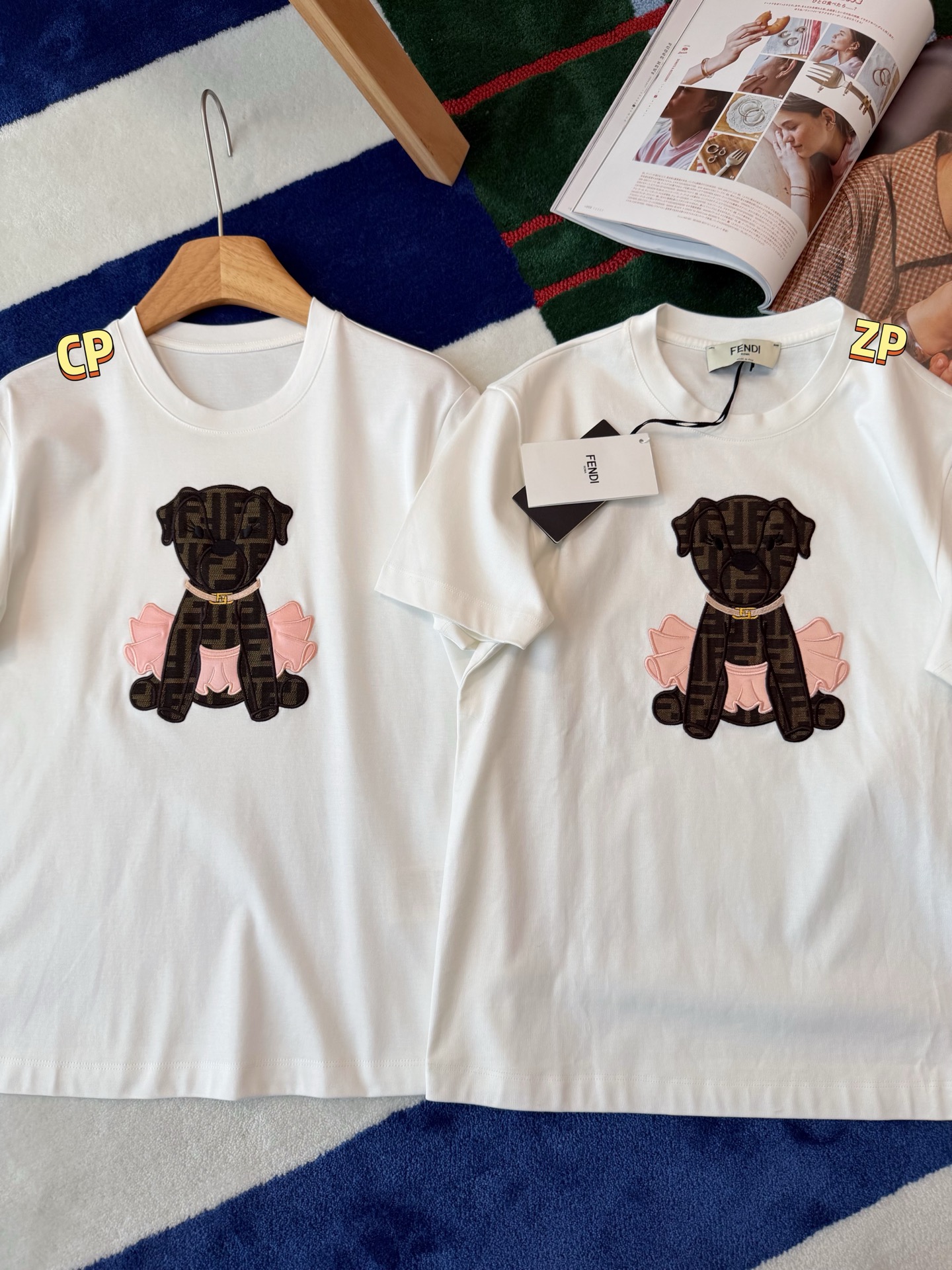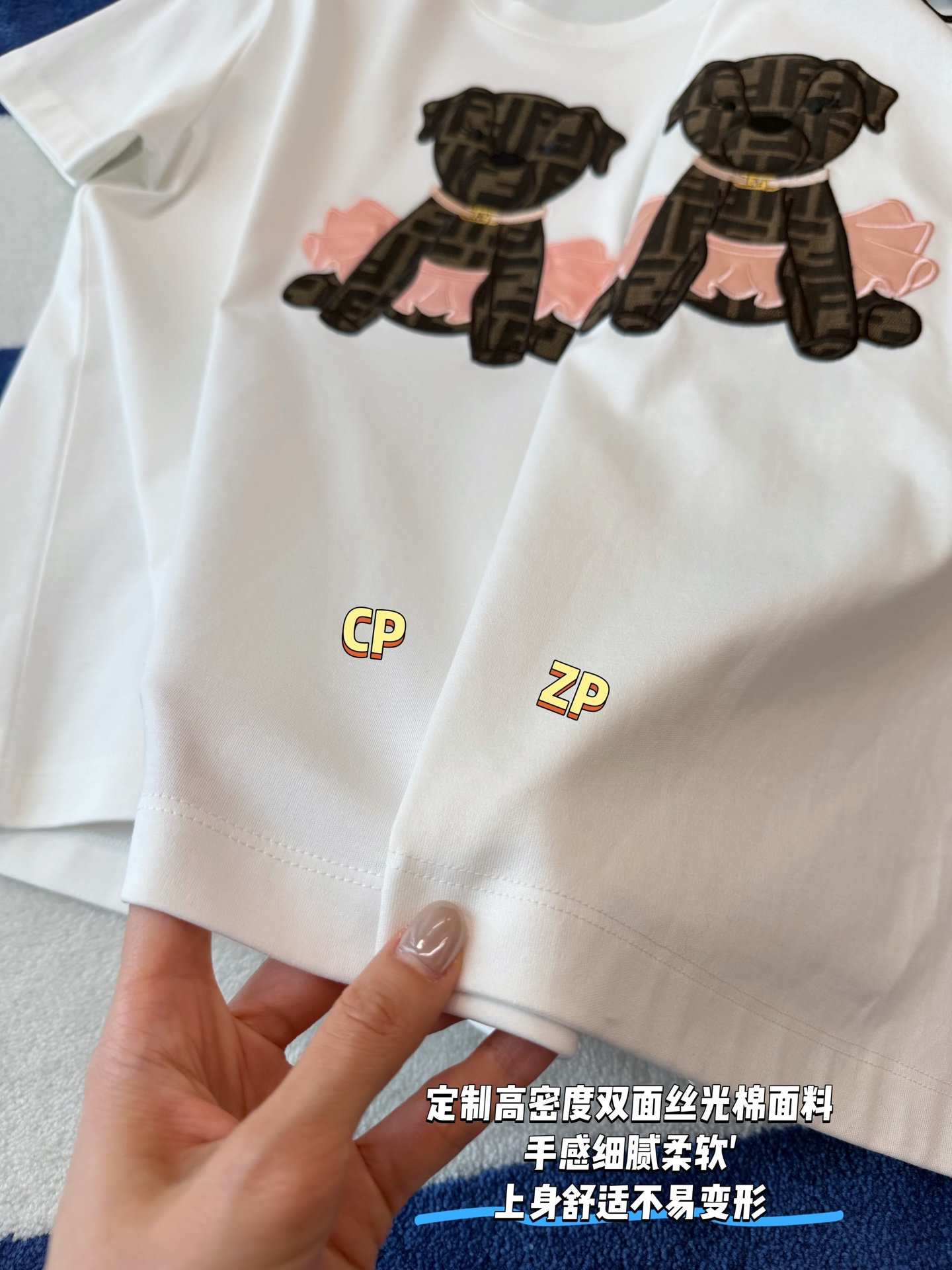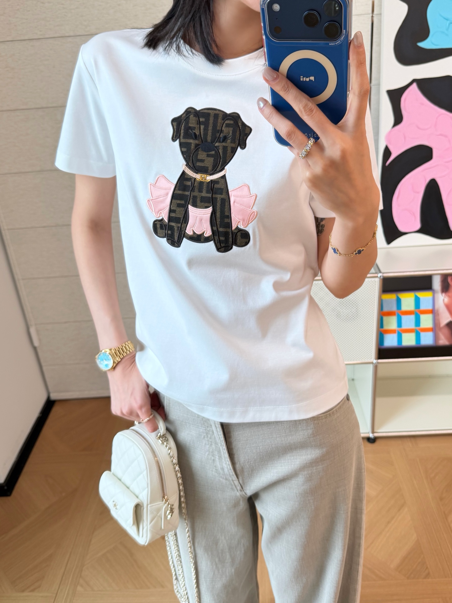【现货发售】爆款限定T恤🔥全新上线‼️老花小狗章仔白T 恤, 采用柔软的棉质面料🔝特选耐穿抗磨的纯棉面料,穿起来舒服不拘束❕❕质感绝绝子🤩章仔做工非常复杂细致✨ FF小狗作为视觉焦点🔜 既保留了品牌辨识度,又不会像满logo款那样张扬😉完美诠释了“低调奢华的可爱感”🤩打造日常随性风范〰️为衣橱注入新意☑️必入款💕常规版型,码数SML