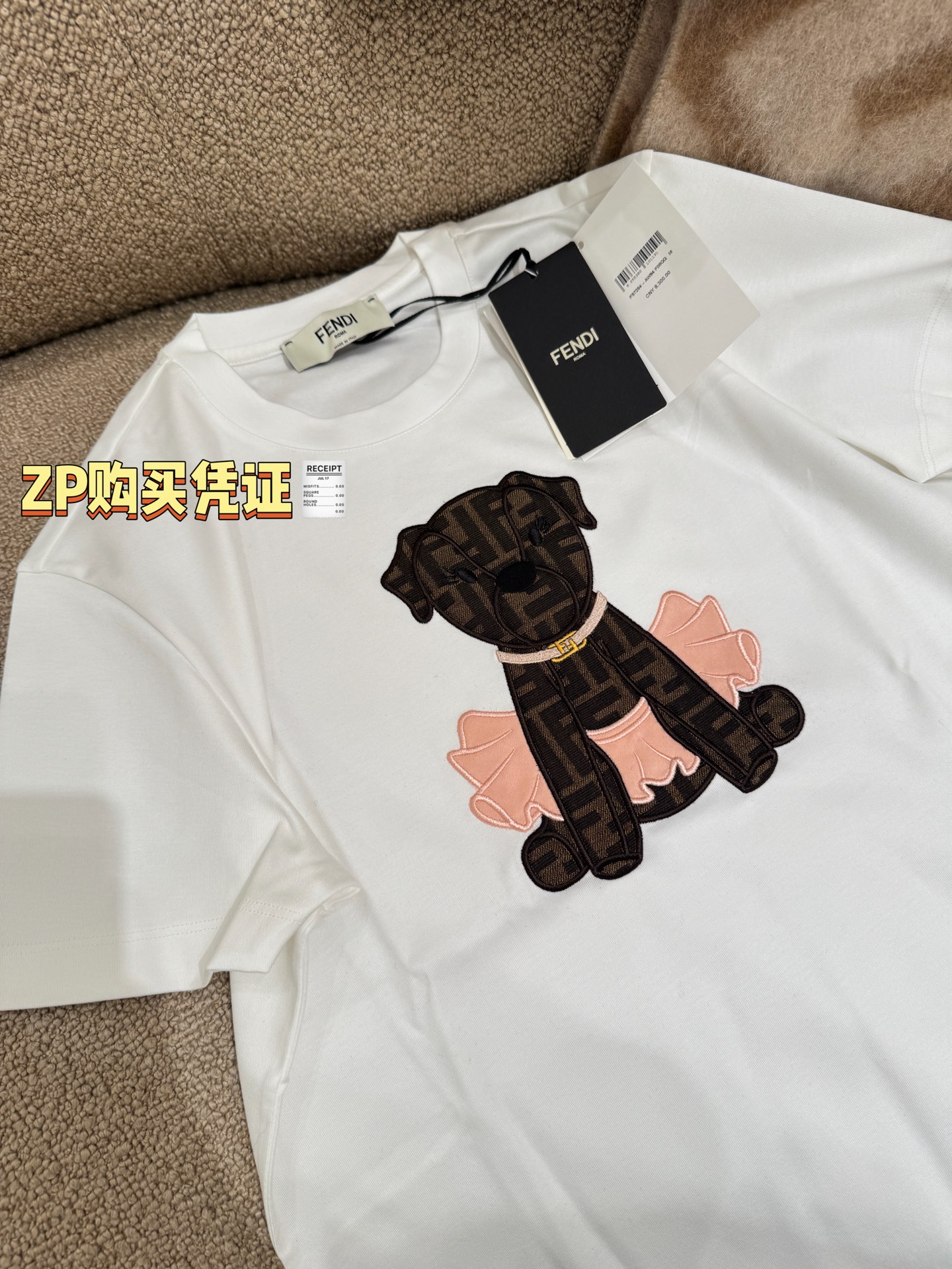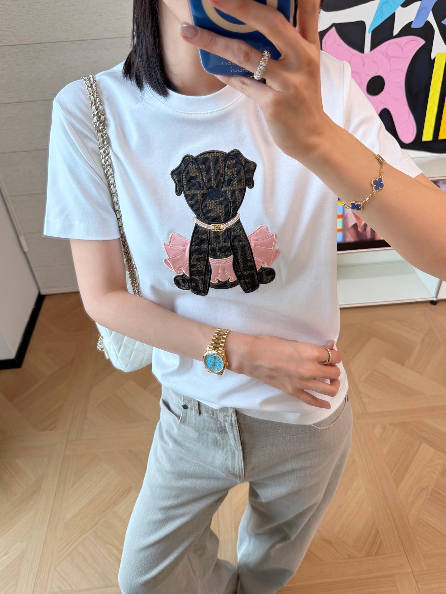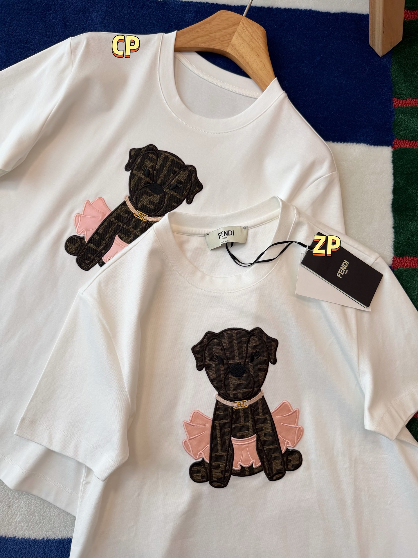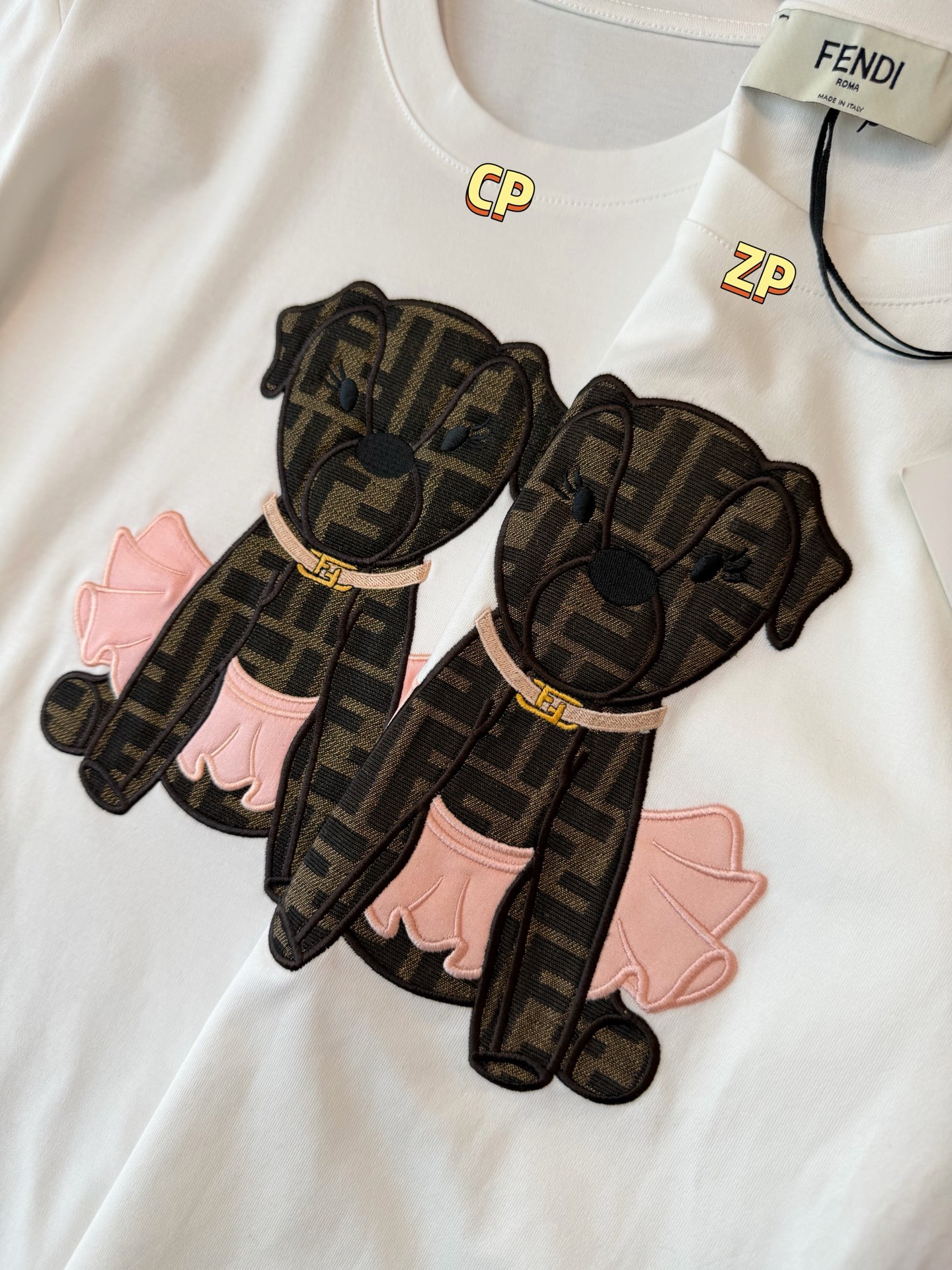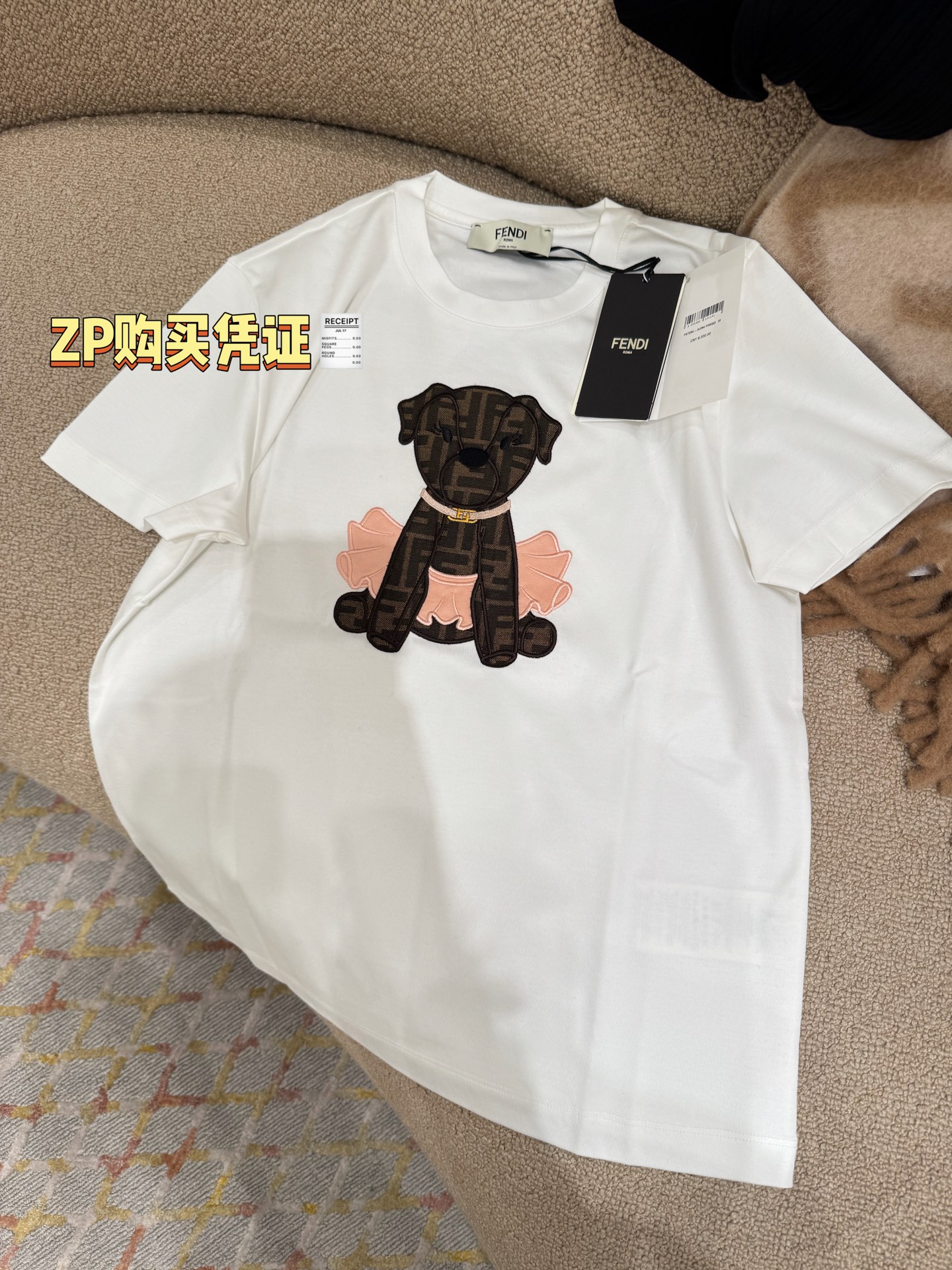 【现货发售】爆款限定T恤🔥全新上线‼️老花小狗章仔白T 恤, 采用柔软的棉质面料🔝特选耐穿抗磨的纯棉面料,穿起来舒服不拘束❕❕质感绝绝子🤩章仔做工非常复杂细致✨ FF小狗作为视觉焦点🔜 既保留了品牌辨识度,又不会像满logo款那样张扬😉完美诠释了“低调奢华的可爱感”🤩打造日常随性风范〰️为衣橱注入新意☑️必入款💕常规版型,码数SML