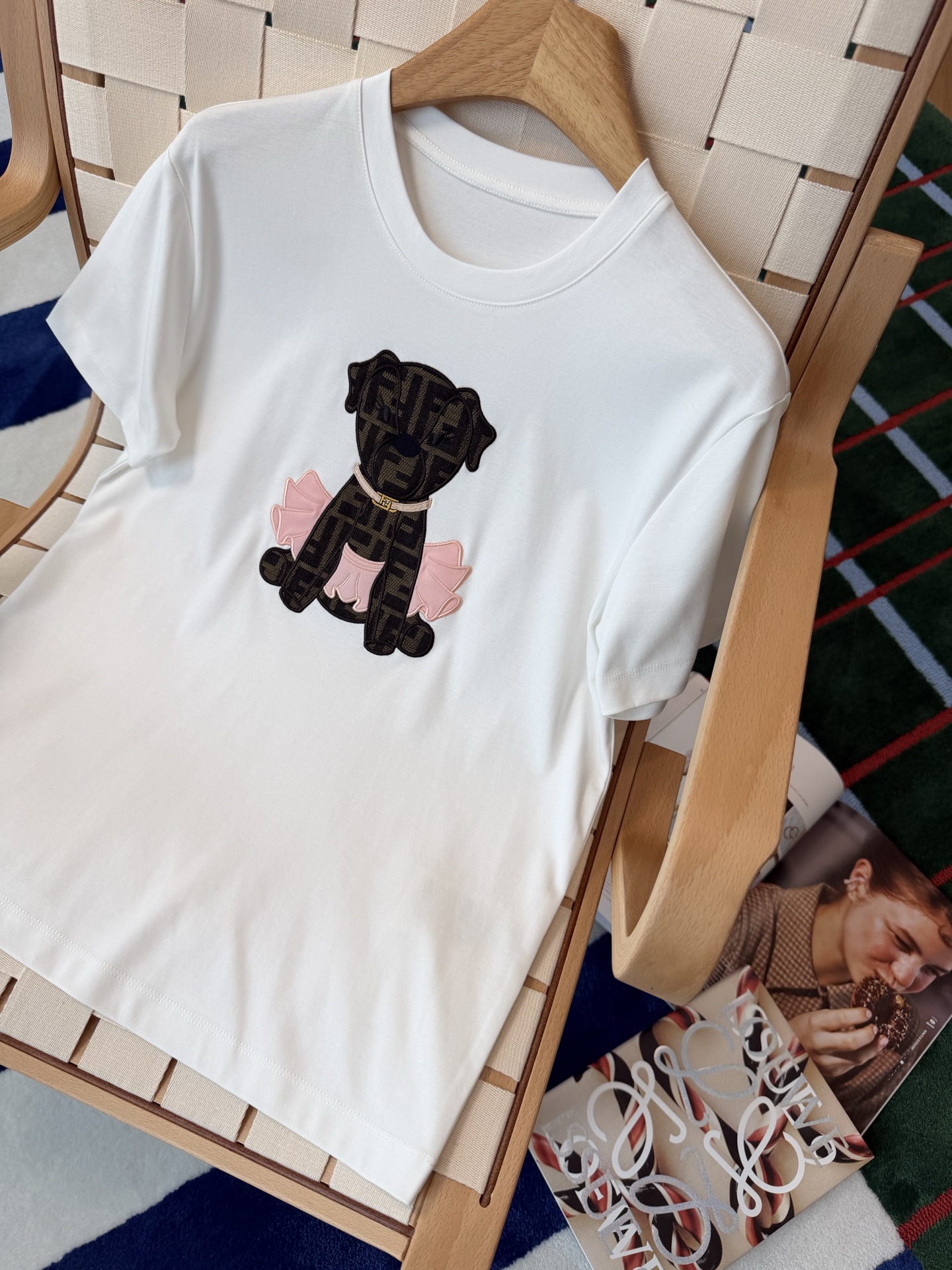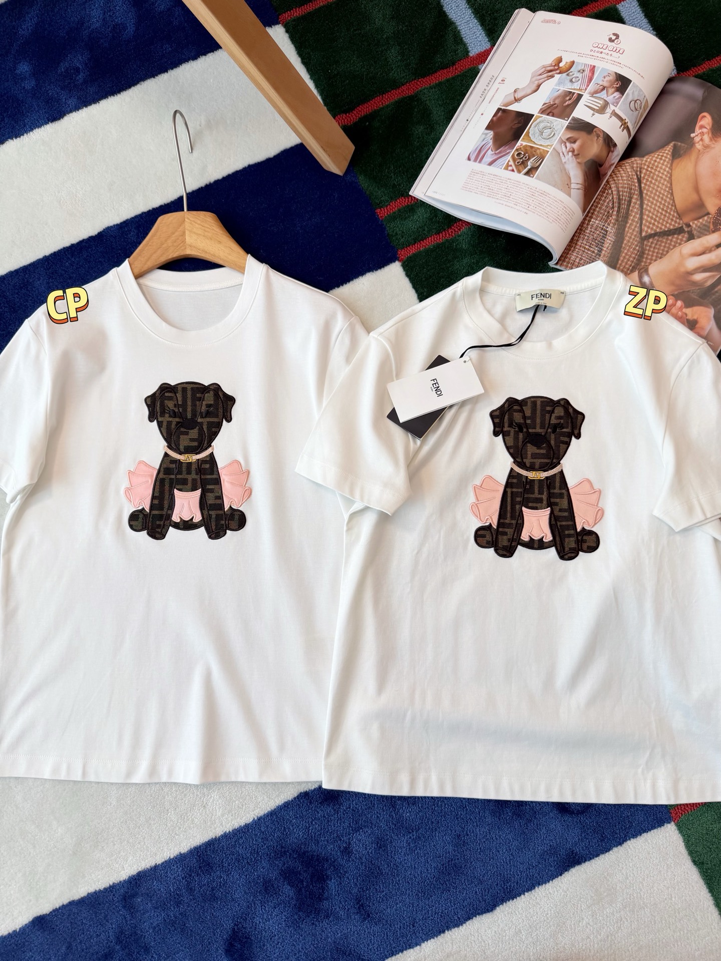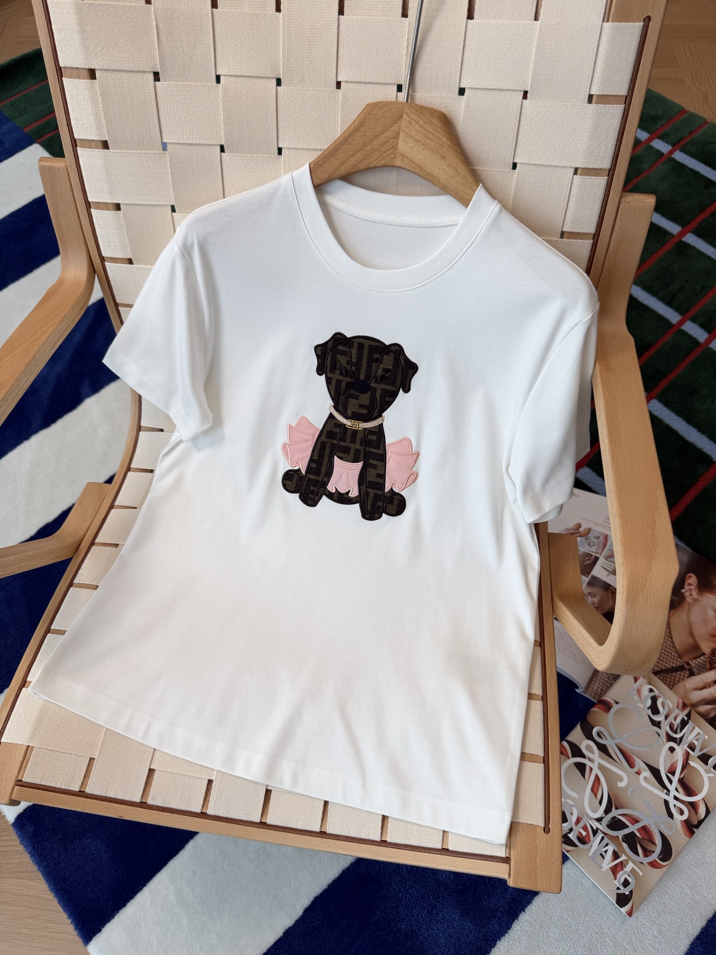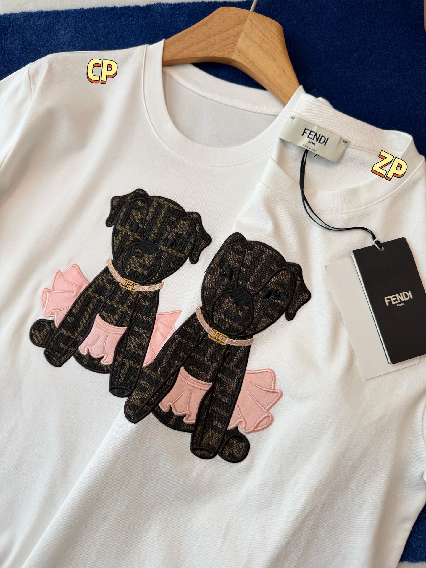 【现货发售】爆款限定T恤🔥全新上线‼️老花小狗章仔白T 恤, 采用柔软的棉质面料🔝特选耐穿抗磨的纯棉面料,穿起来舒服不拘束❕❕质感绝绝子🤩章仔做工非常复杂细致✨ FF小狗作为视觉焦点🔜 既保留了品牌辨识度,又不会像满logo款那样张扬😉完美诠释了“低调奢华的可爱感”🤩打造日常随性风范〰️为衣橱注入新意☑️必入款💕常规版型,码数SML