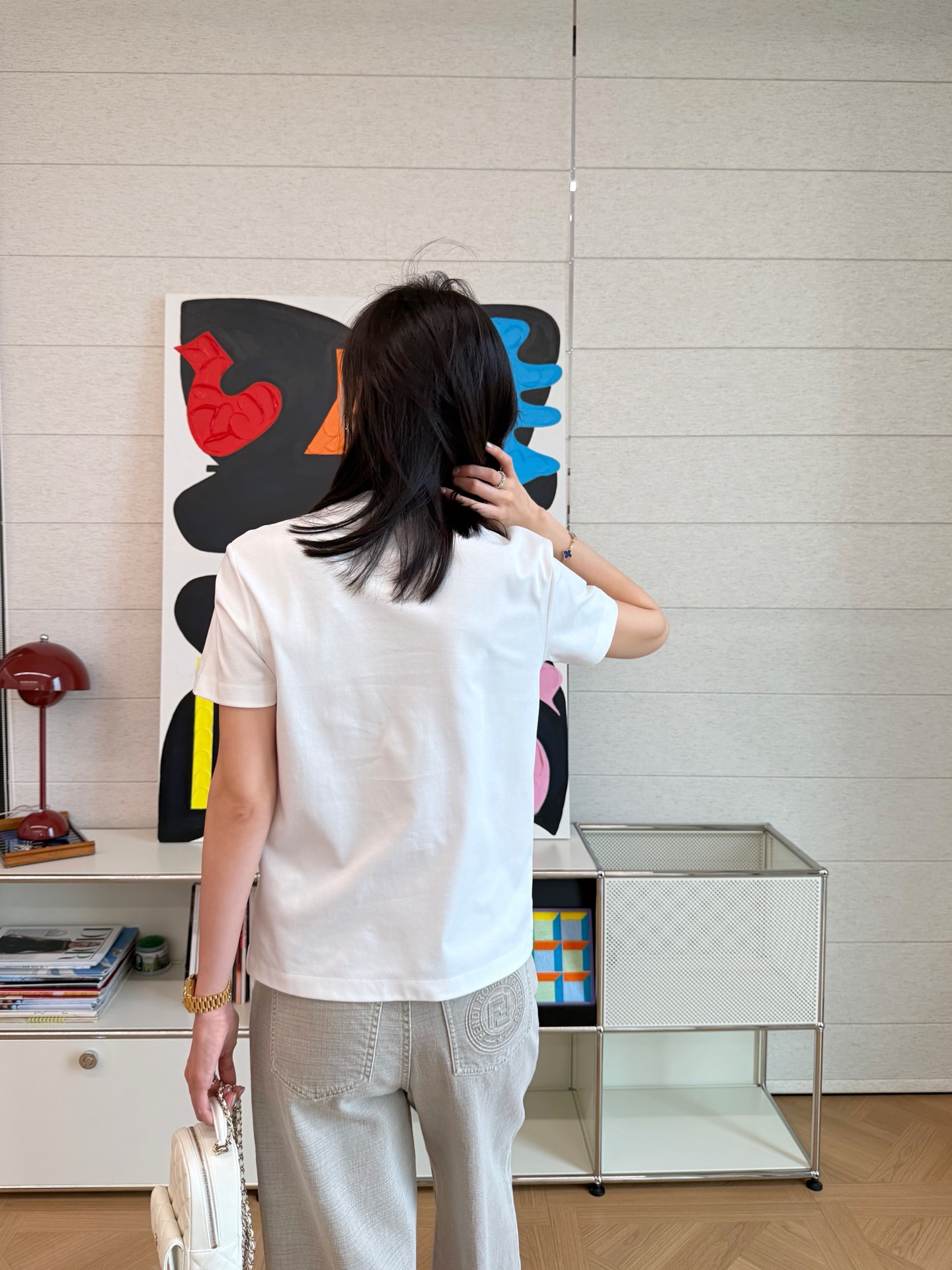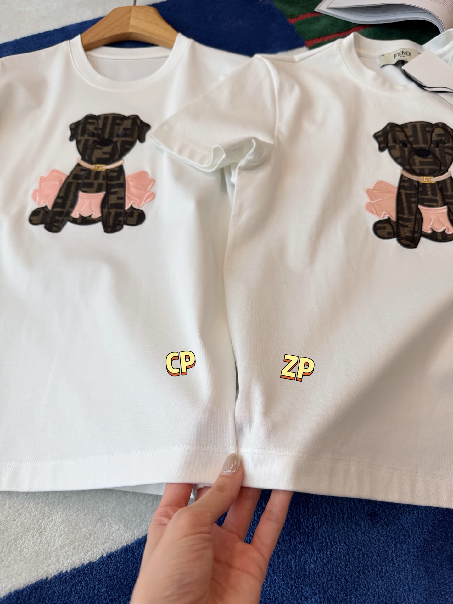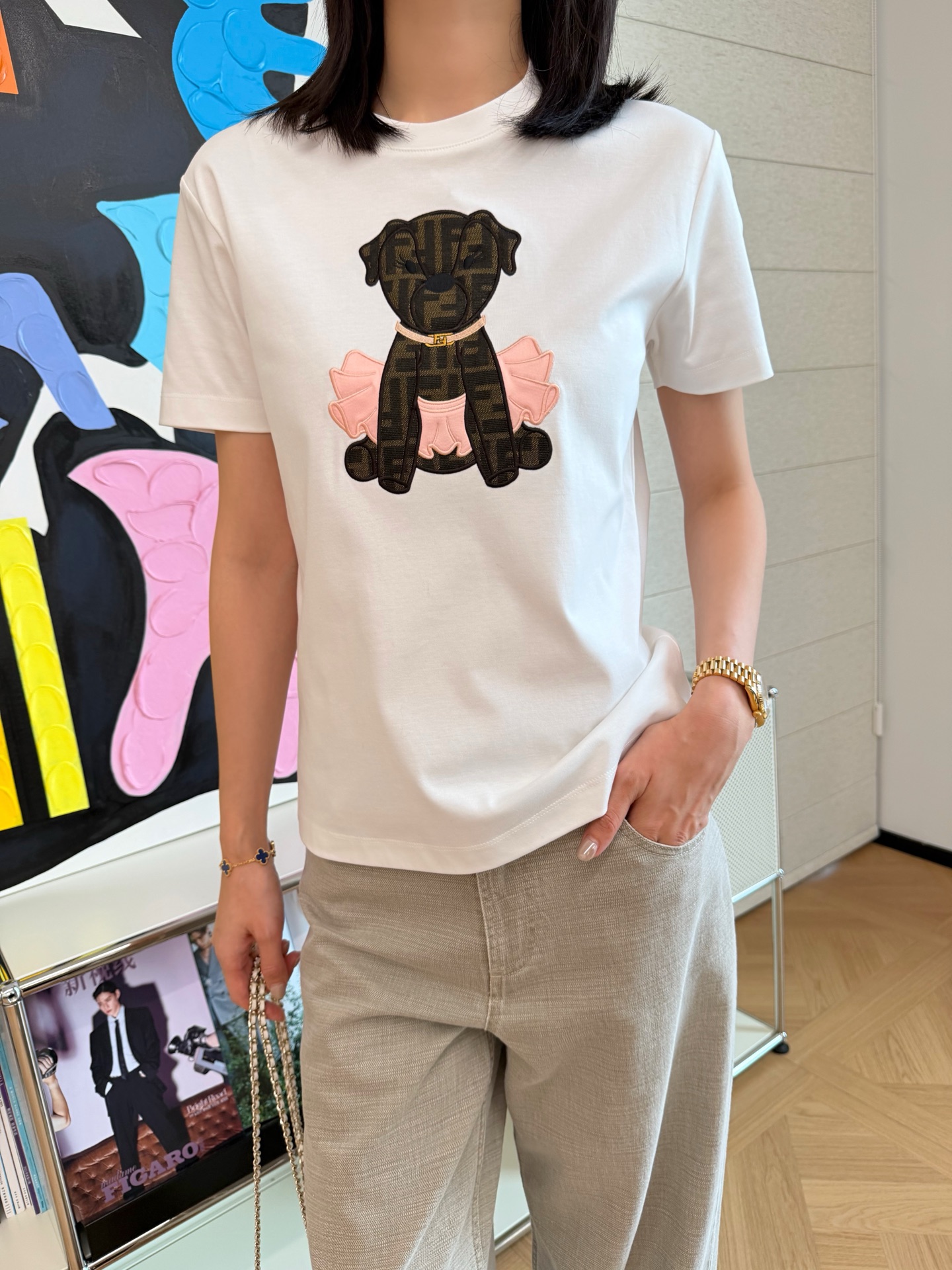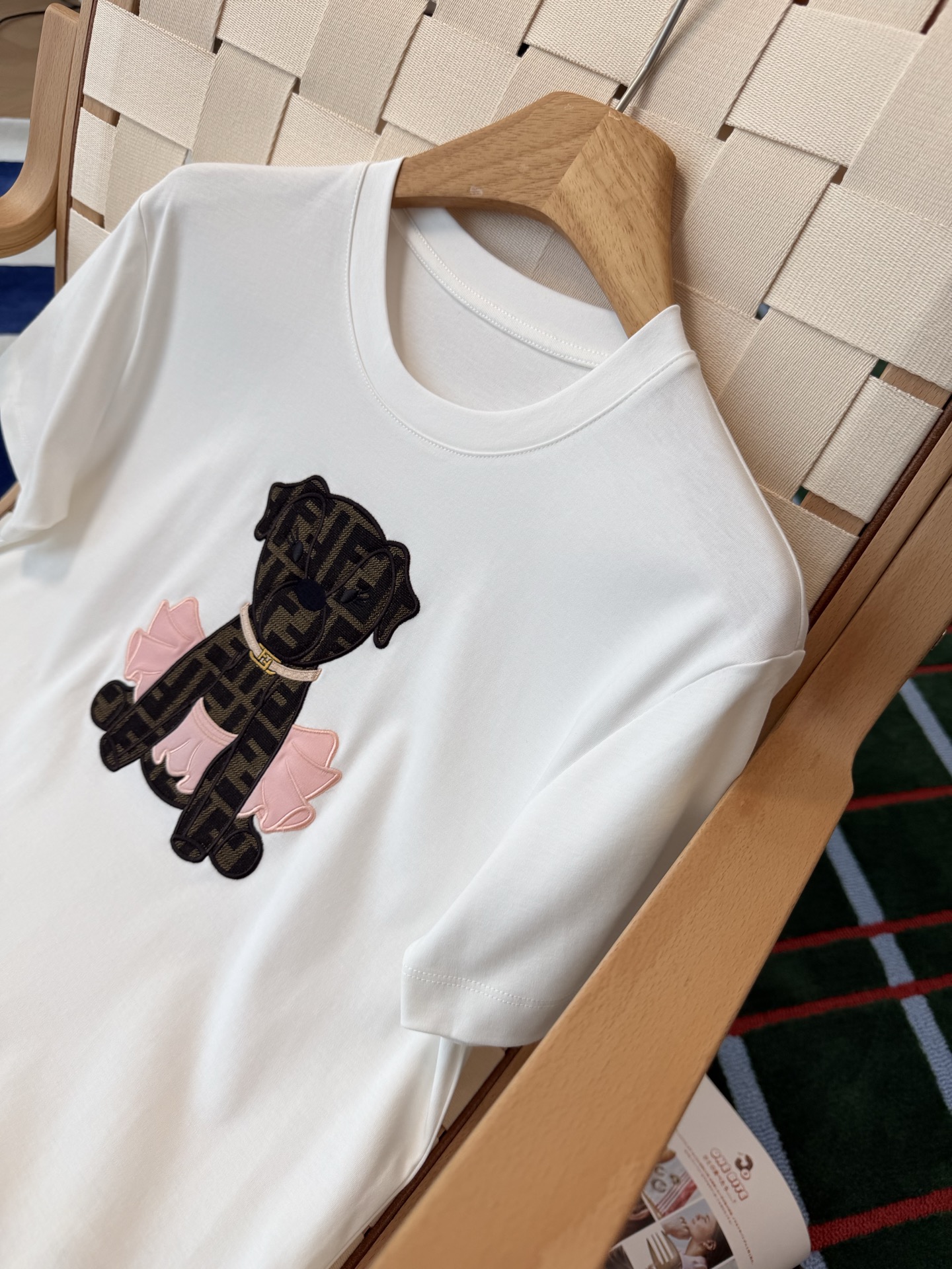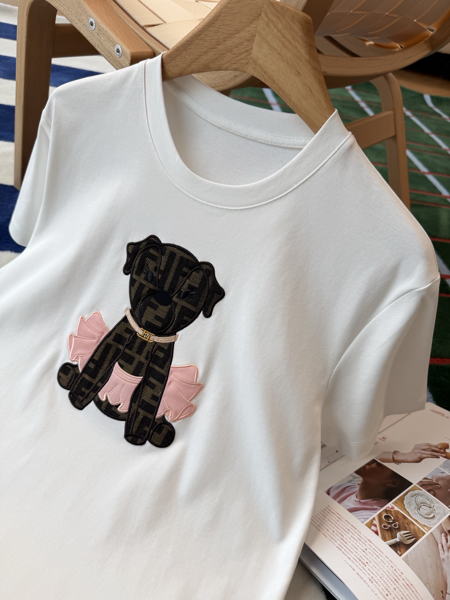 【现货发售】爆款限定T恤🔥全新上线‼️老花小狗章仔白T 恤, 采用柔软的棉质面料🔝特选耐穿抗磨的纯棉面料,穿起来舒服不拘束❕❕质感绝绝子🤩章仔做工非常复杂细致✨ FF小狗作为视觉焦点🔜 既保留了品牌辨识度,又不会像满logo款那样张扬😉完美诠释了“低调奢华的可爱感”🤩打造日常随性风范〰️为衣橱注入新意☑️必入款💕常规版型,码数SML