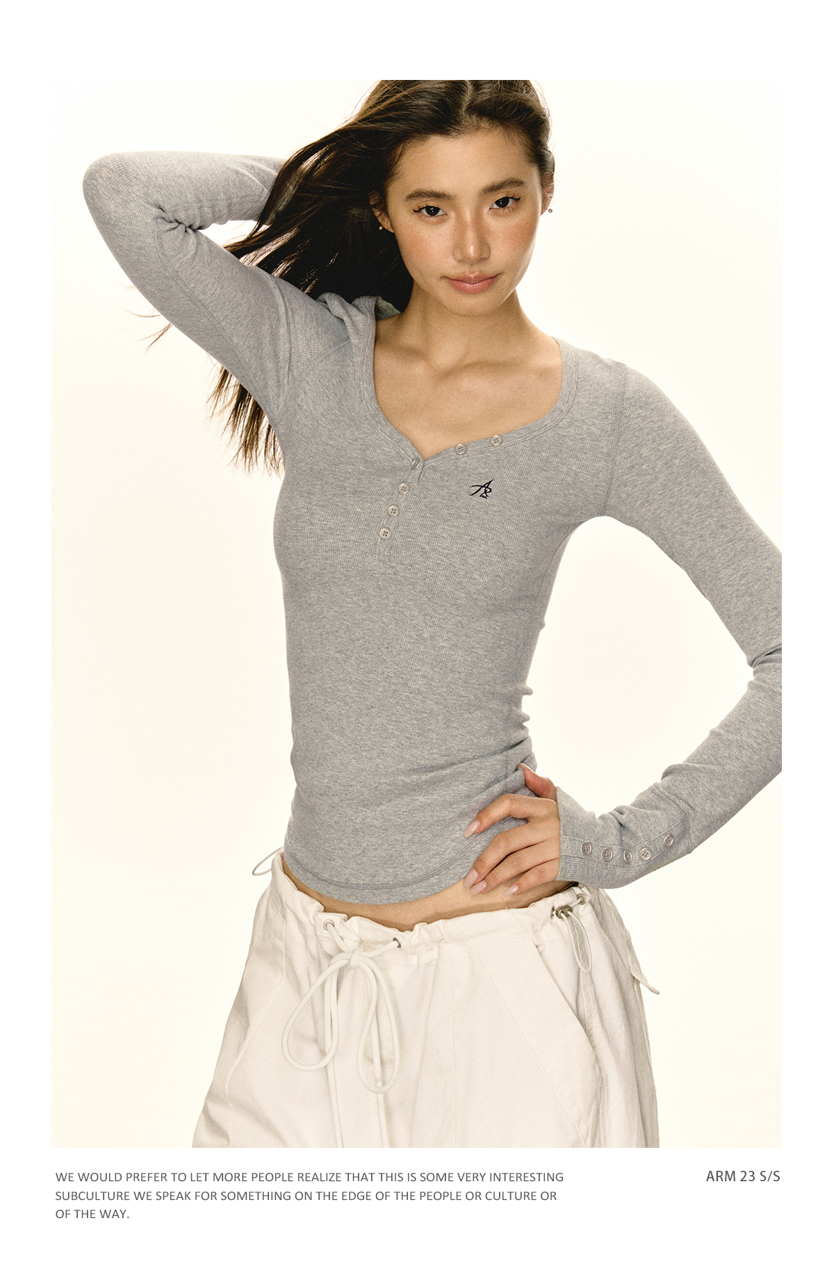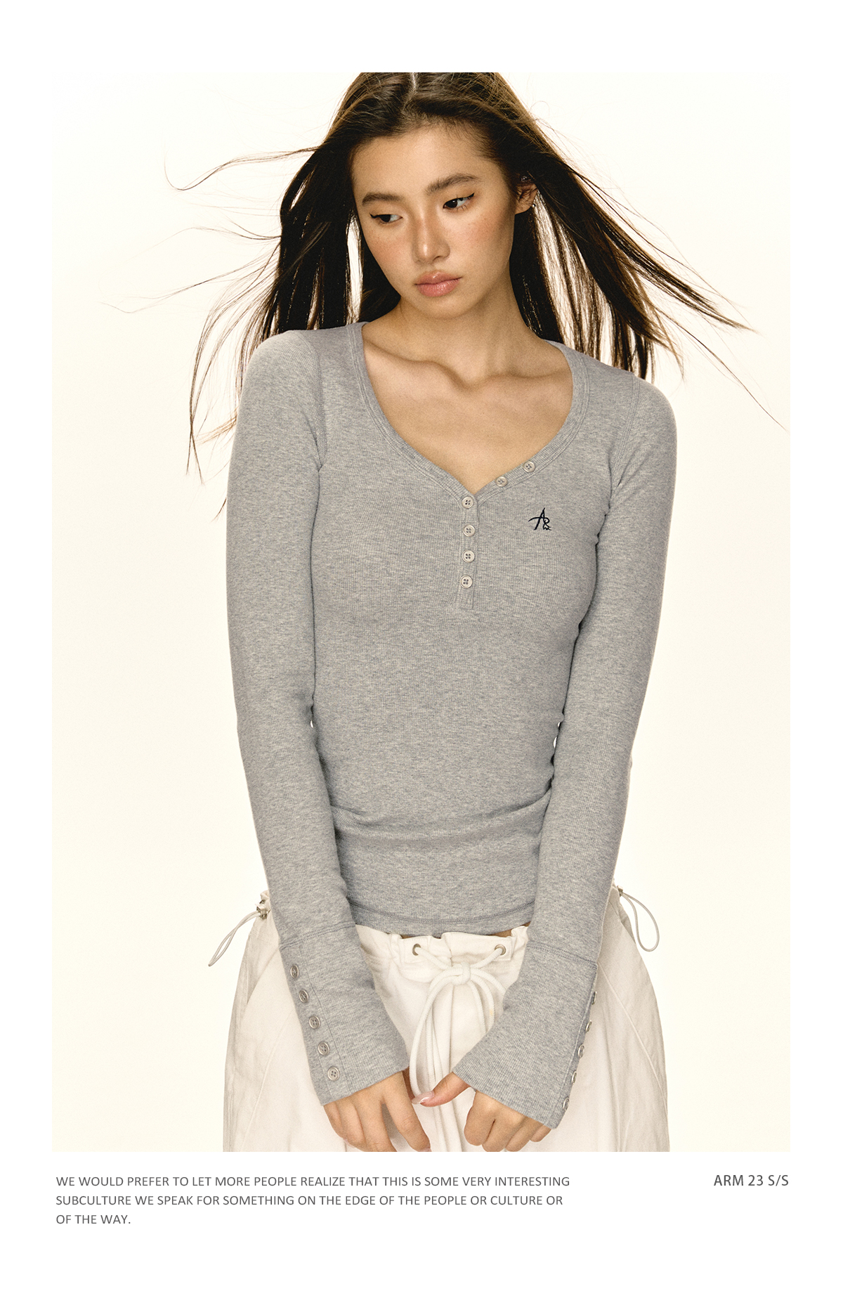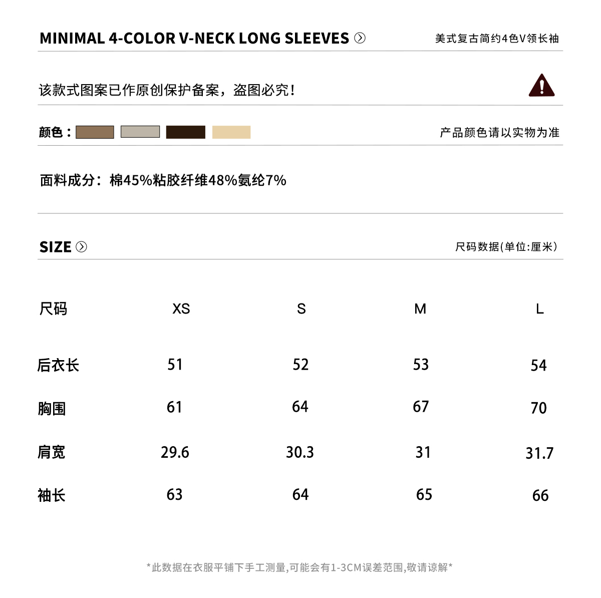 Ariseism 美式复古V领修身长袖t恤女2025秋季新款内搭上衣打底衫